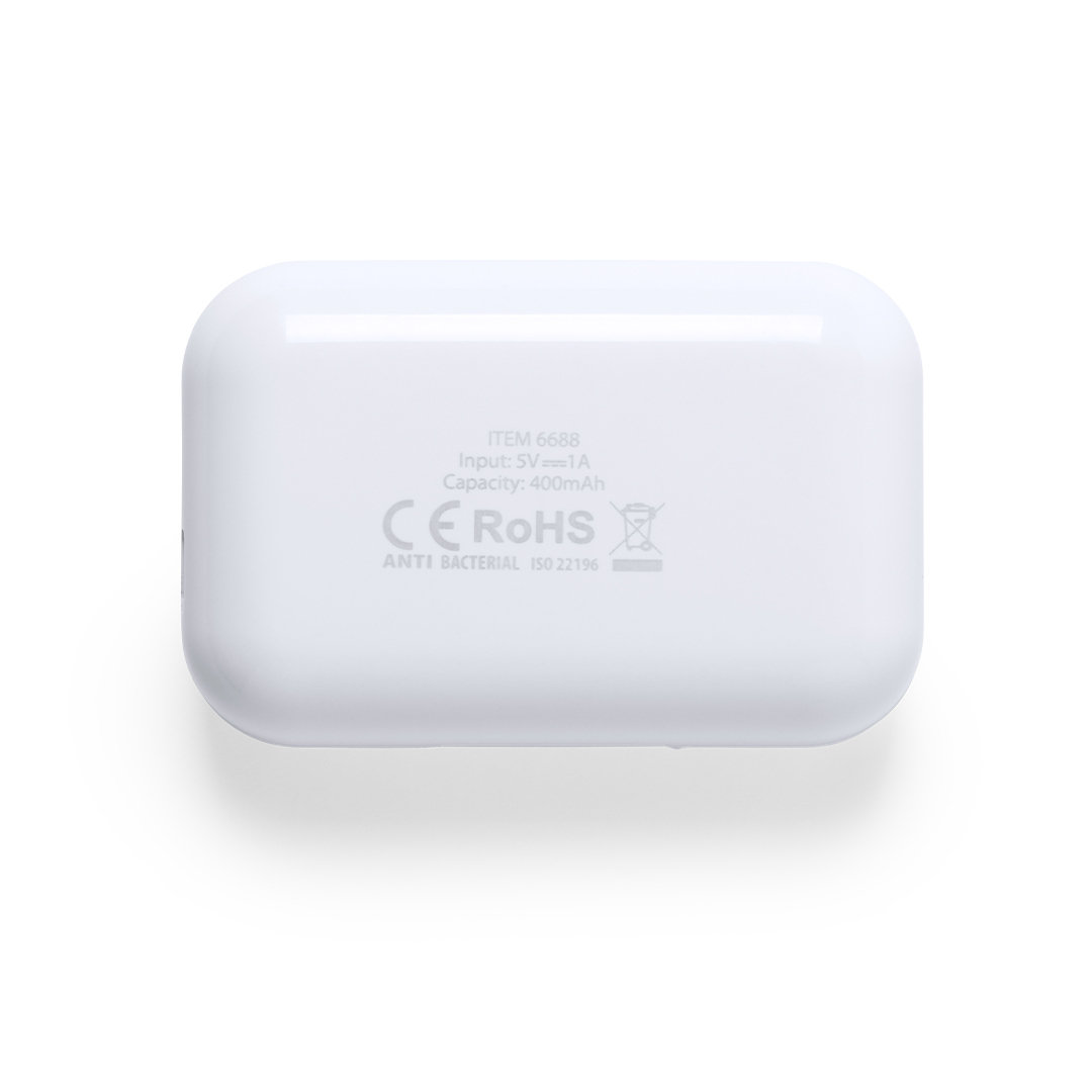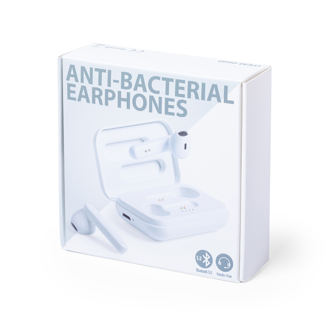 Antibakterieller Kopfhörer mit Bluetooth® 5.0-Buchse in einem eleganten weißen Farbdesign in glänzender Ausführung. Ergonomisches Design, einschließlich eines integrierten Touch-Control-Knopfes im Ohrhörer, mit farblich angepasster Ladestation. Freisprechfunktion und wiederaufladbares Mikro-USB-Kabel im Lieferumfang enthalten. Präsentiert in einem individuellen Luxus-Etui mit Scharnierdeckel und in einer attraktiven Design-Box. Produkte mit antibakterieller Behandlung sind in der Lage, den Bakteriengehalt auf den Materialoberflächen dank der Zugabe permanenter statischer mikrobieller Wirkstoffe drastisch zu reduzieren, mit hoher Wirksamkeit bei der Hemmung und Verhinderung bakterieller Verunreinigungen. Artikel nach der Norm ISO 22196, die die antibakterielle Aktivität in Kunststoffen und auf nicht porösen Oberflächen bestimmt. Dies erlaubt es uns, die Wirksamkeit der Bakterienhemmung, die die Zusatzstoffe auf den behandelten Artikeln haben, anhand einer quantitativen Bewertung zu bestimmen.