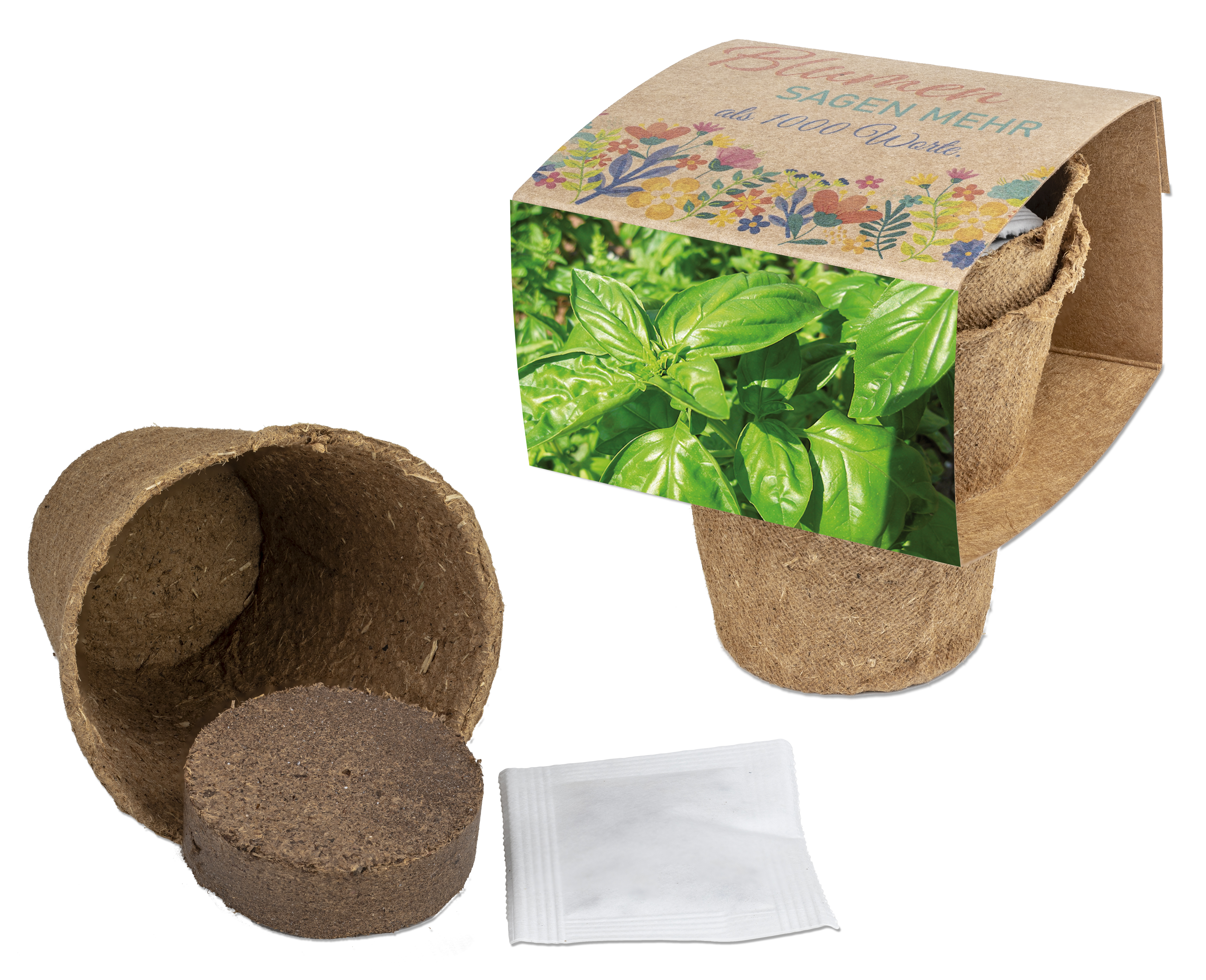 Diese Anzuchttöpfe sind biologisch abbaubar, nachhaltig und mit dem Umweltsiegel "Der blaue Engel" gekennzeichnet. Das Zellulose-Materialwird leicht durchwurzelt, die Jungpflanzen lassen sich daher mitsamt dem Ballen ohne Umpflanzschock auspflanzen. Geliefert wird das 2er Set mit Substrattabletten als Erde sowie zwei Samensorten nach Wahl. Die umlaufende Banderole aus Kraftkarton kann individuell bedruckt werden.