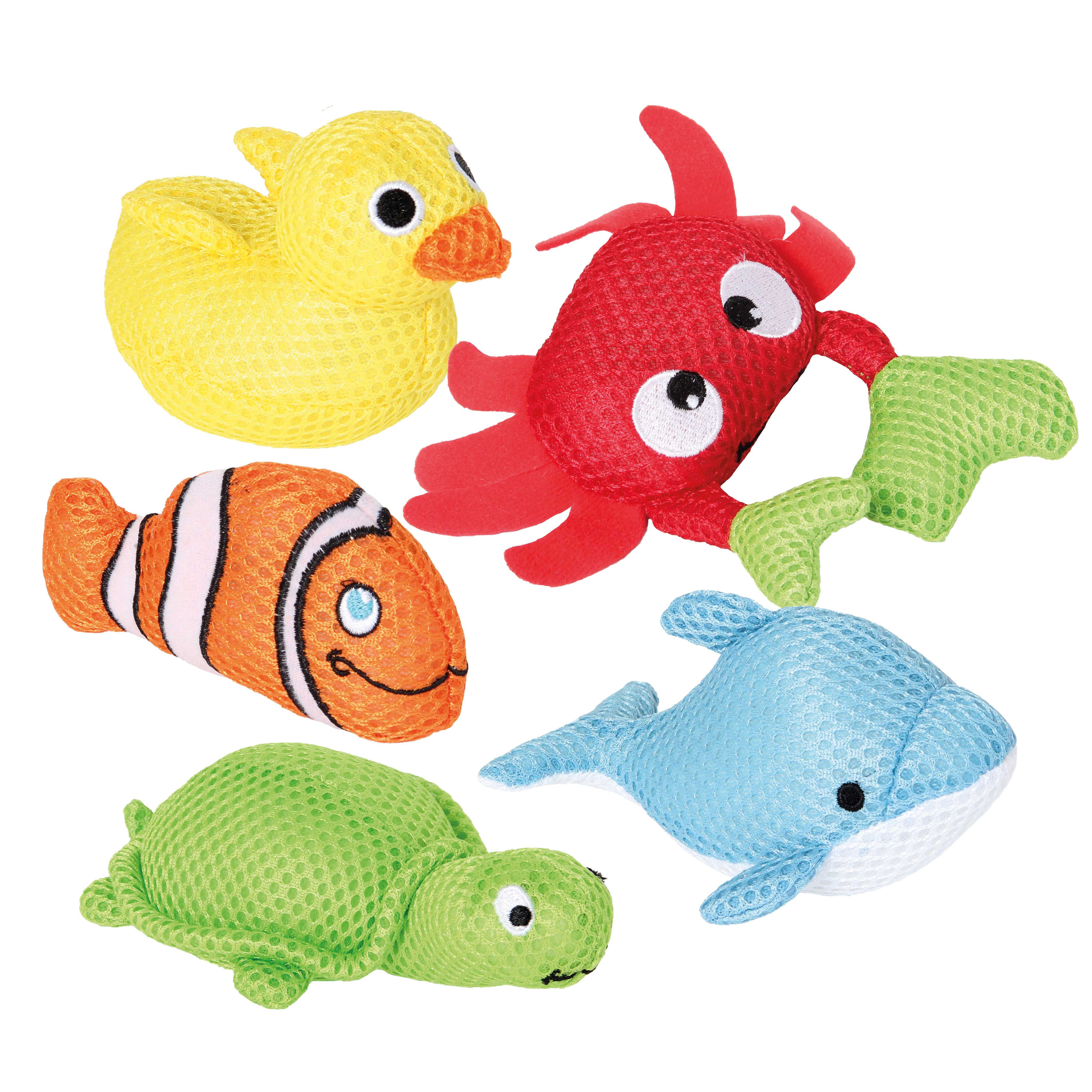 Auch mit Wasser vollgesogen gehen die Tiere nicht unter! 5-fach sortiert machen die lustigen Schwammtiere das Plantschen zu einem besonderen Vergnügen, ob in der Badewanne, im Pool oder als Wasserbomben! Länge ca. 10 - 12cm.