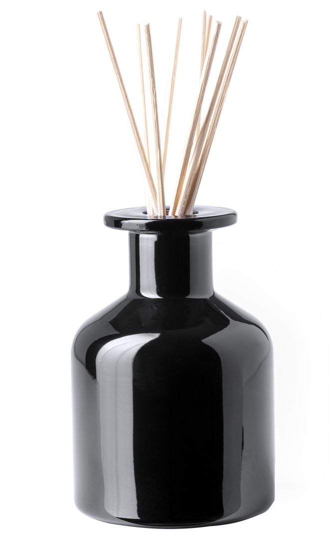 Duftzerstäuber 100 ml, hergestellt aus massivem Glas. Mit 8 Rattanstäbchen und auslaufsicherem Deckel. Weißes Modell mit Vanilleduft und schwarzes Modell mit Sandelholzduft. Präsentiert in einer individuellen weißen Schachtel mit Sichtfenster.