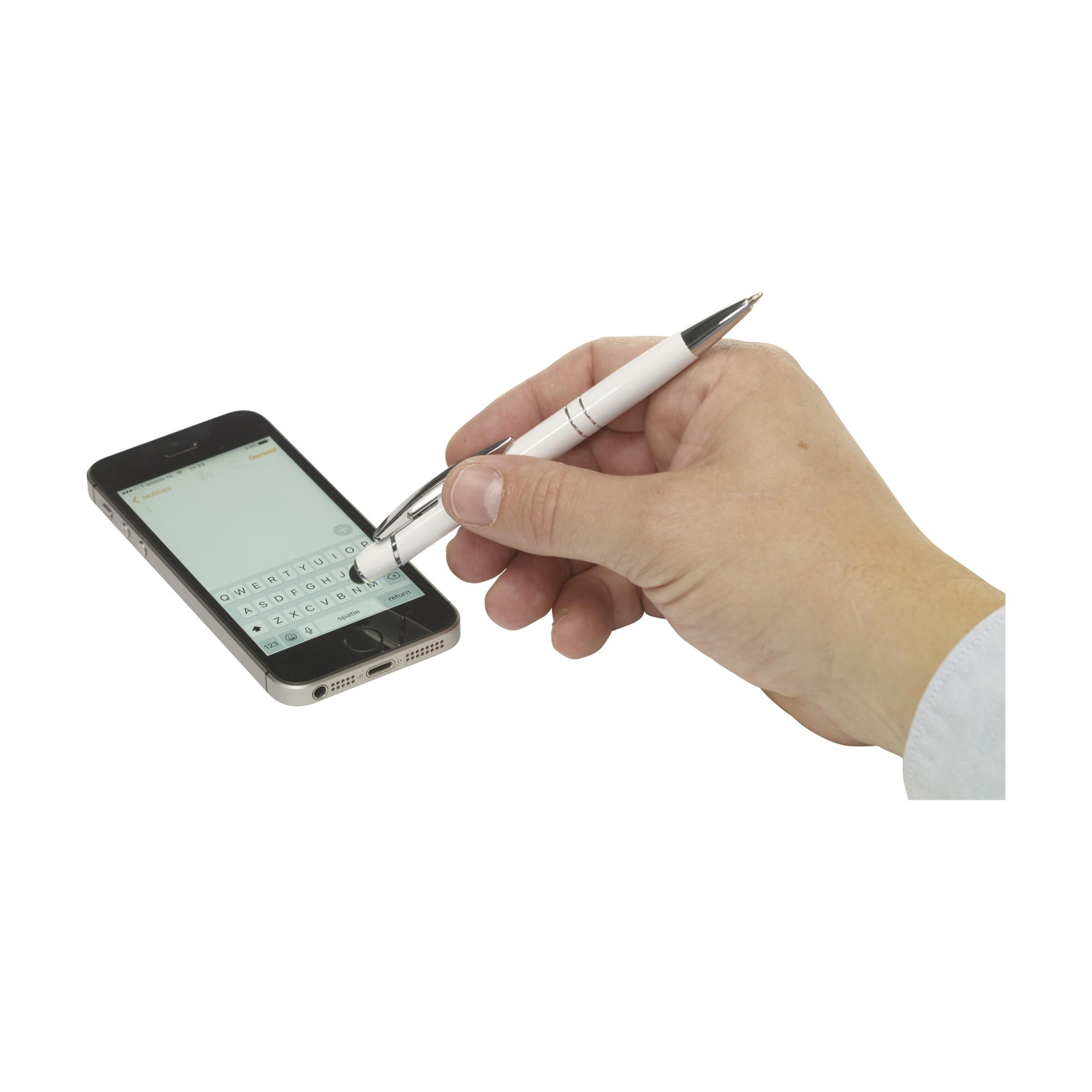 Beschreibung: Blauschreibender Aluminium-Kugelschreiber mit griffestem Vorderteil, silbernen Akzenten und metallenem Clip. Mit gummierte Spitze zum Bedienen von Touchscreens (wie iPhone / iPad).
