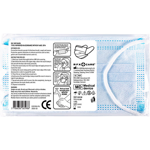 Inhalt: 1 Atemmaske im Polybeutel. Mundschutz mit Gummizügen und eingearbeiteter Nasenklemme für gute Passform. Die Maske hat eine hohe Bakterienfiltration. CE-Kennzeichnung gemäß EU-Richtlinie über Medizinprodukte 93/42 / EWG, Anhang V11, Klasse 1 Typ IIR, zugelassen gemäß EN 14683: 2019.
