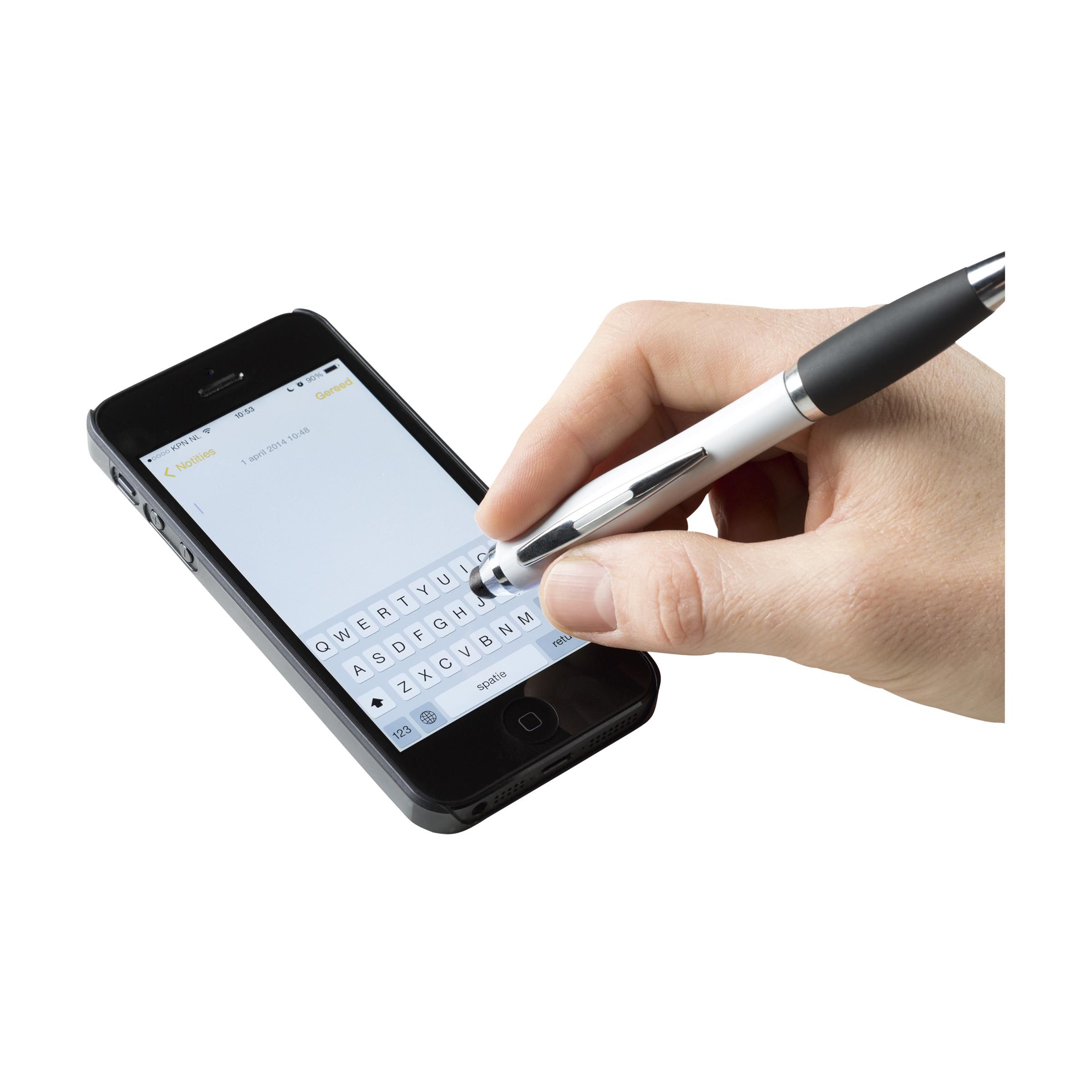 Beschreibung: Blauschreibender Kugelschreiber mit gummiertem, grifffesten Vorderteil, hochglänzenden Akzenten, Aussparungen im Metallclip, gummierter Spitze / Pointer zum Bedienen von Touchscreens (wie iPhone / iPad).