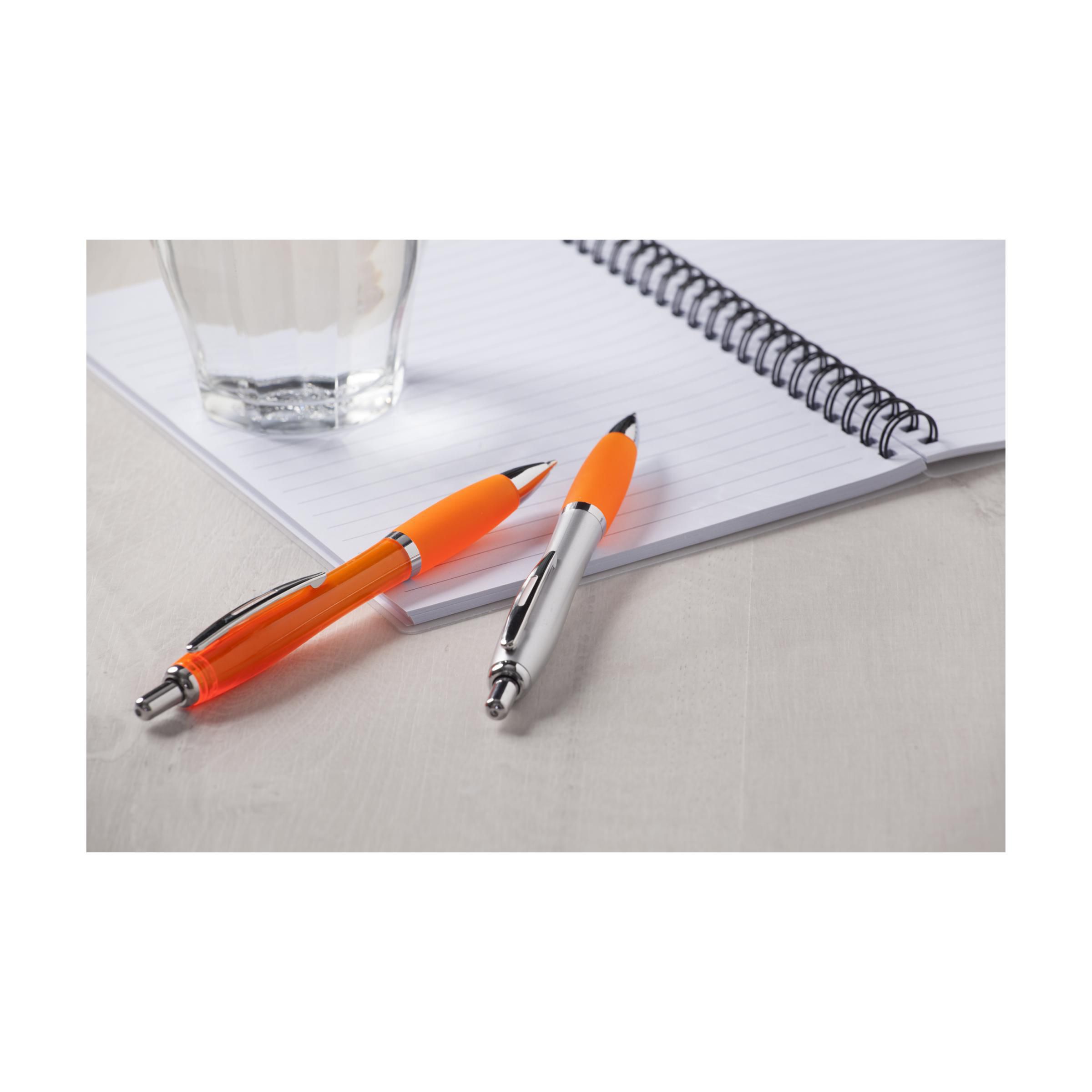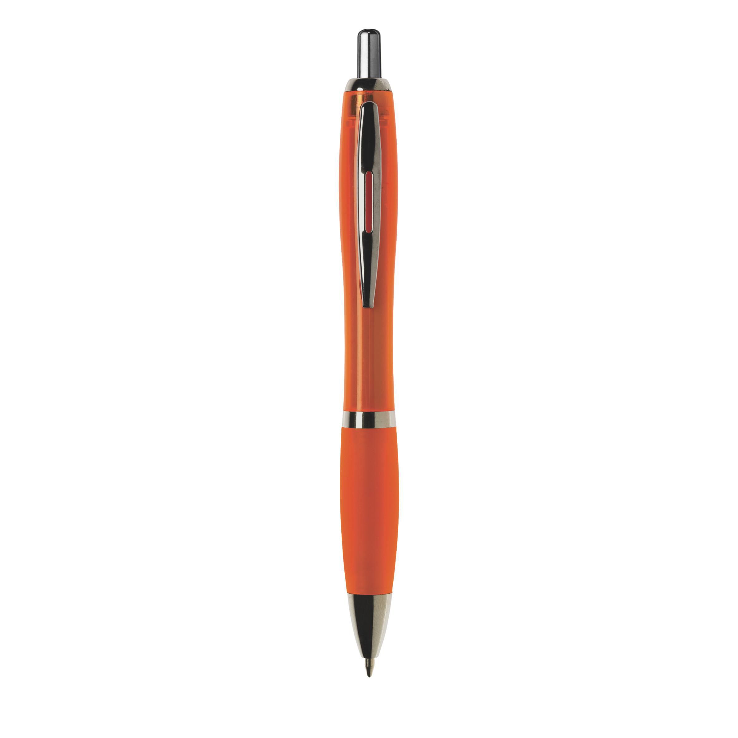 Beschreibung: Blauschreibender oder schwarzschreibender Kugelschreiber mit transparentfarbener Gehäuse, grifffestem Vorderteil und Metallclip.