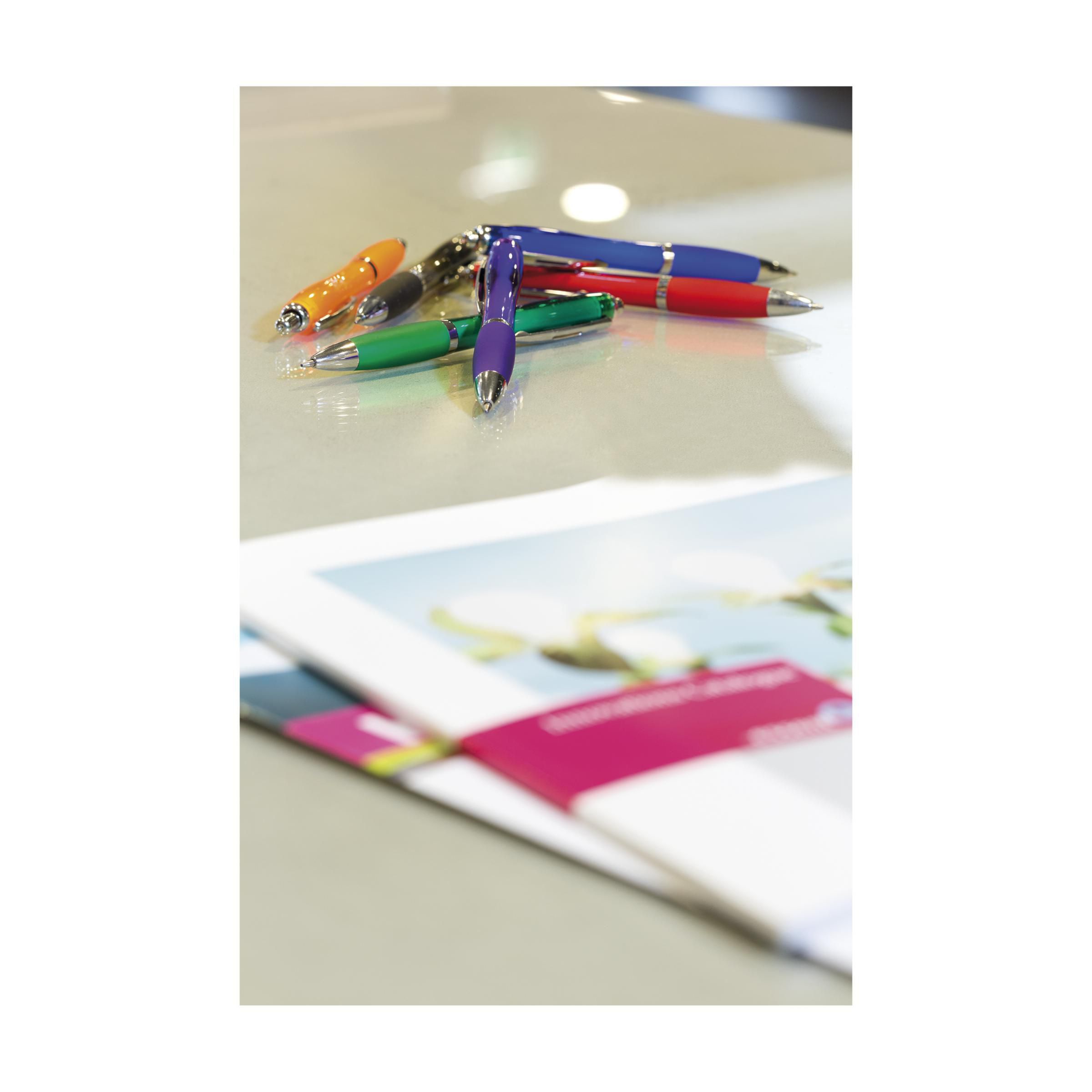 Beschreibung: Blauschreibender oder schwarzschreibender Kugelschreiber mit transparentfarbener Gehäuse, grifffestem Vorderteil und Metallclip.