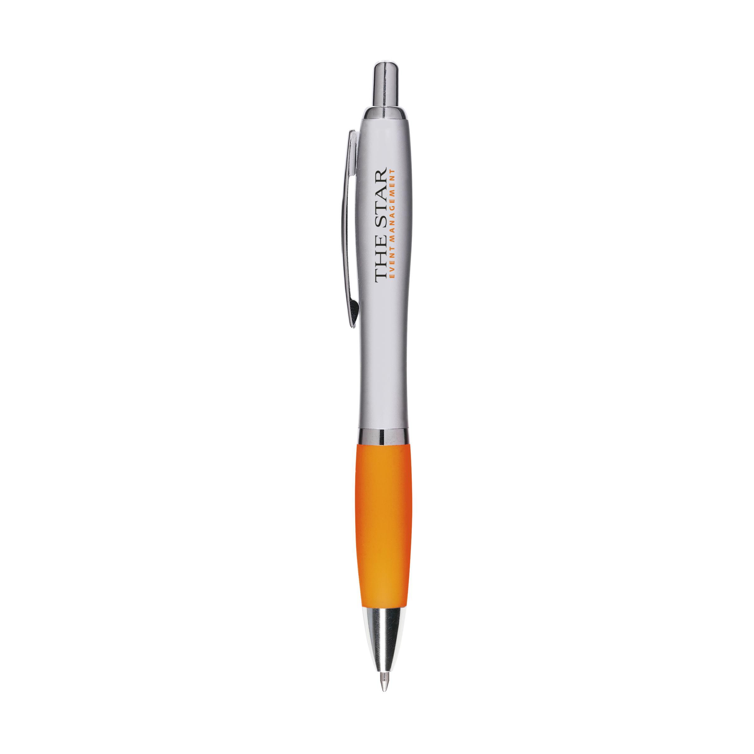 Beschreibung: Blauschreibender oder schwarzschreibender Kugelschreiber mit farbigem, grifffestem Vorderteil und Metallclip.