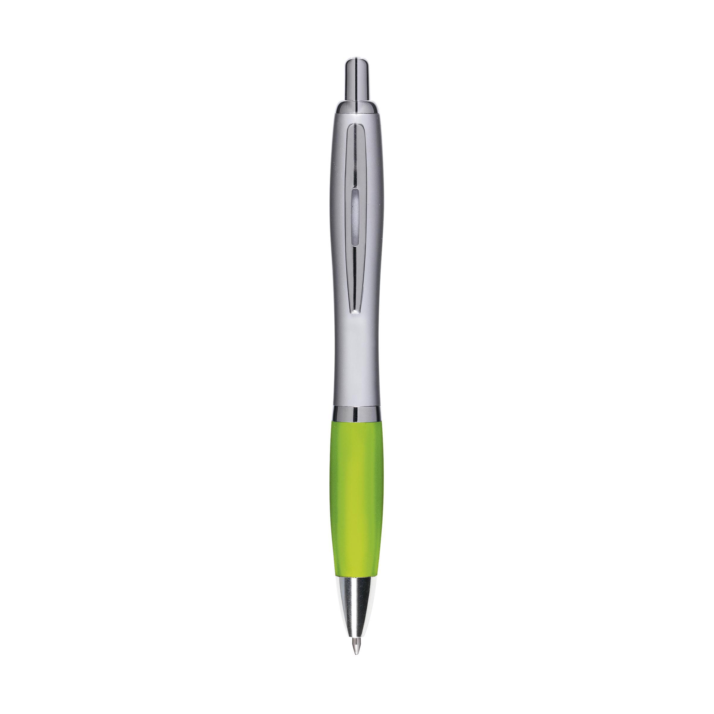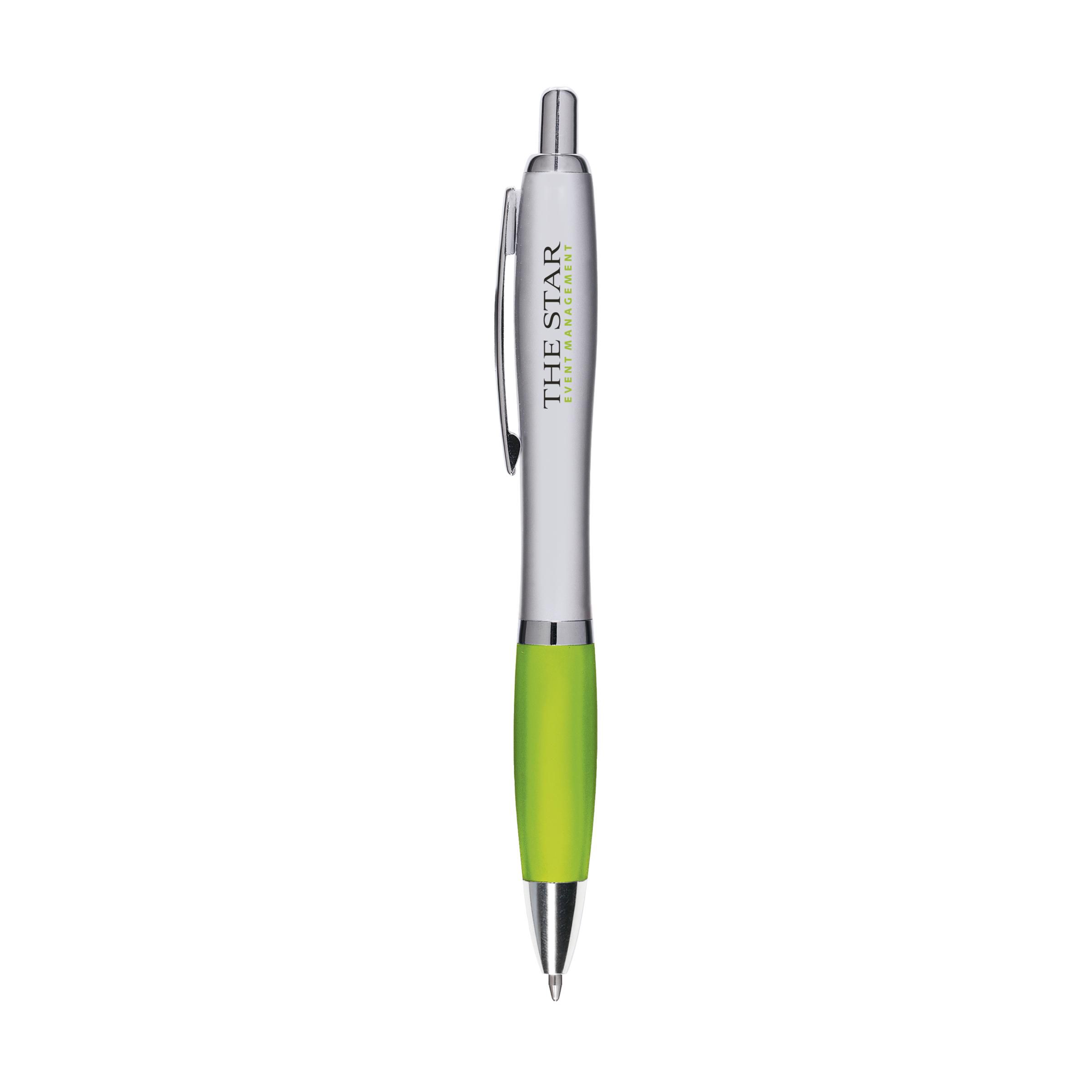Beschreibung: Blauschreibender oder schwarzschreibender Kugelschreiber mit farbigem, grifffestem Vorderteil und Metallclip.