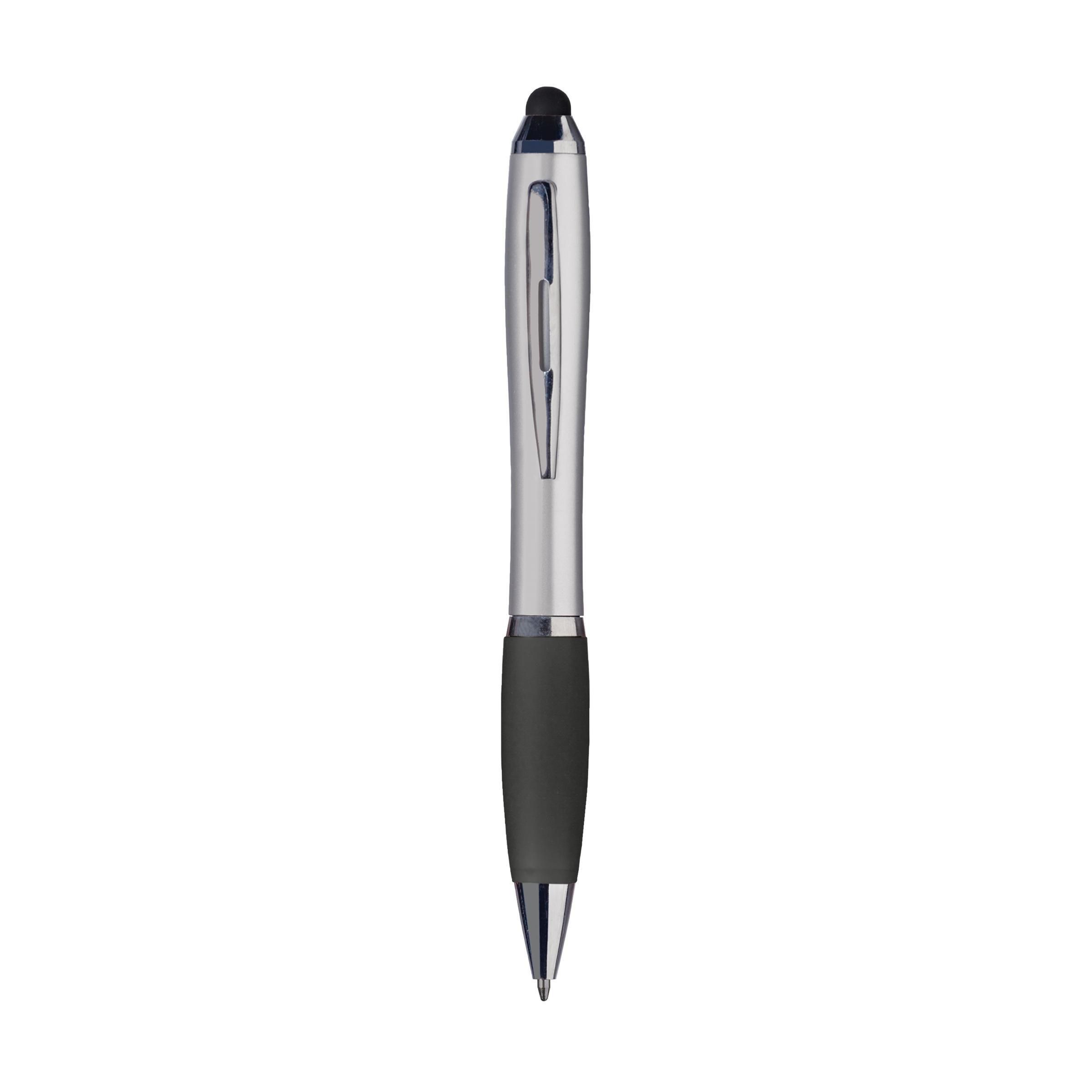 Beschreibung: Blauschreibender Kugelschreiber mit farbiger, gummierter Spitze/Pointer zum Bedienen von Touchscreens (wie iPhone/iPad), hochglänzenden Akzenten, farbigem, grifffestem Vorderteil, Aussparungen im Metallclip und Dreh-Klicksystem.
