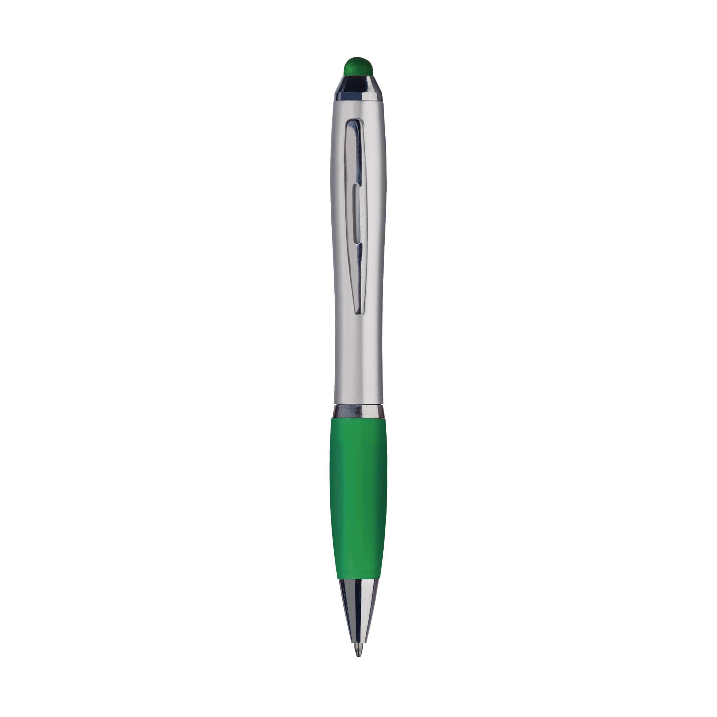 Beschreibung: Blauschreibender Kugelschreiber mit farbiger, gummierter Spitze/Pointer zum Bedienen von Touchscreens (wie iPhone/iPad), hochglänzenden Akzenten, farbigem, grifffestem Vorderteil, Aussparungen im Metallclip und Dreh-Klicksystem.