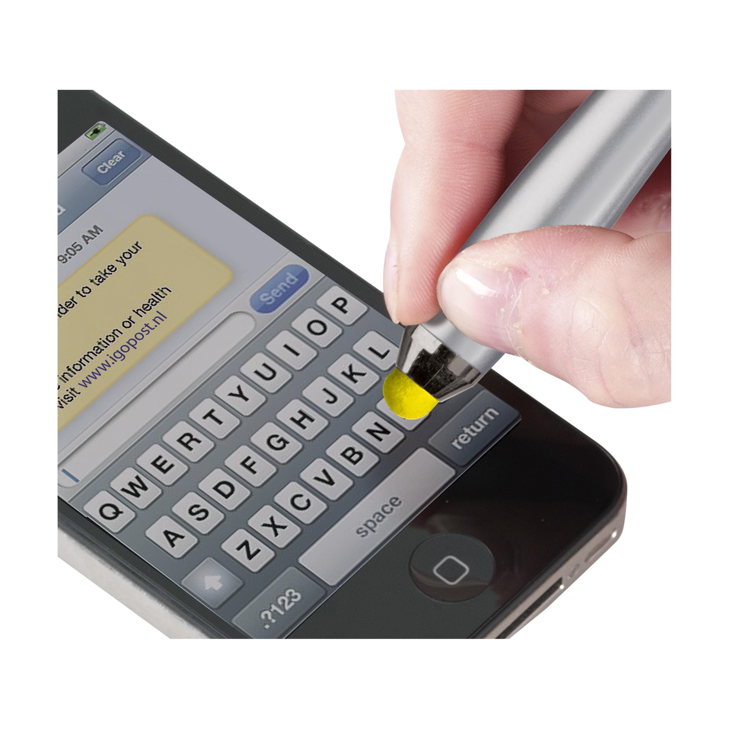 Beschreibung: Blauschreibender Kugelschreiber mit farbiger, gummierter Spitze / Pointer zum Bedienen von Touchscreens (wie iPhone / iPad), hochglänzenden Akzenten, farbigem, grifffestem Vorderteil, Aussparungen im Metallclip und Dreh-Klicksystem.