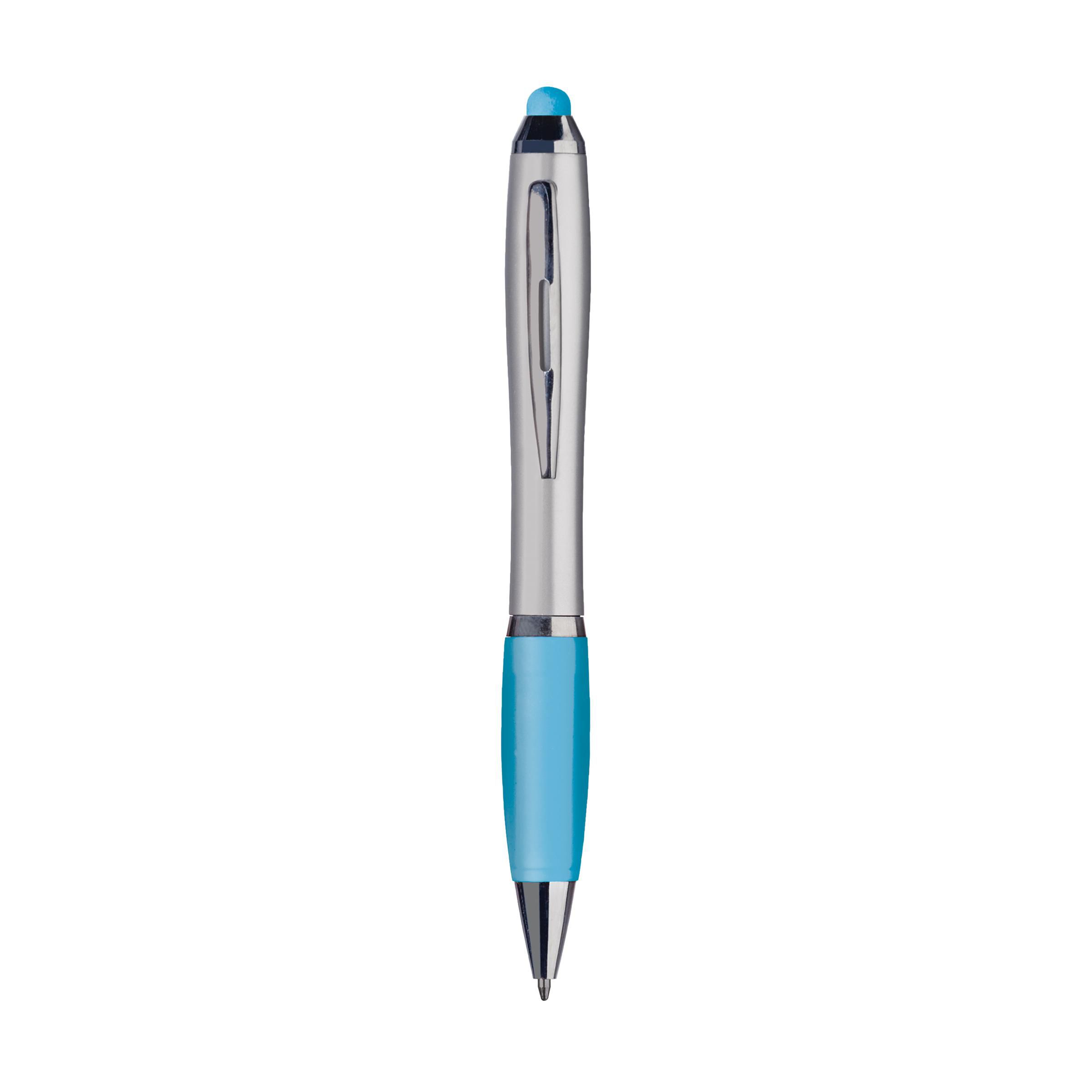 Beschreibung: Blauschreibender Kugelschreiber mit farbiger, gummierter Spitze / Pointer zum Bedienen von Touchscreens (wie iPhone / iPad), hochglänzenden Akzenten, farbigem, grifffestem Vorderteil, Aussparungen im Metallclip und Dreh-Klicksystem.