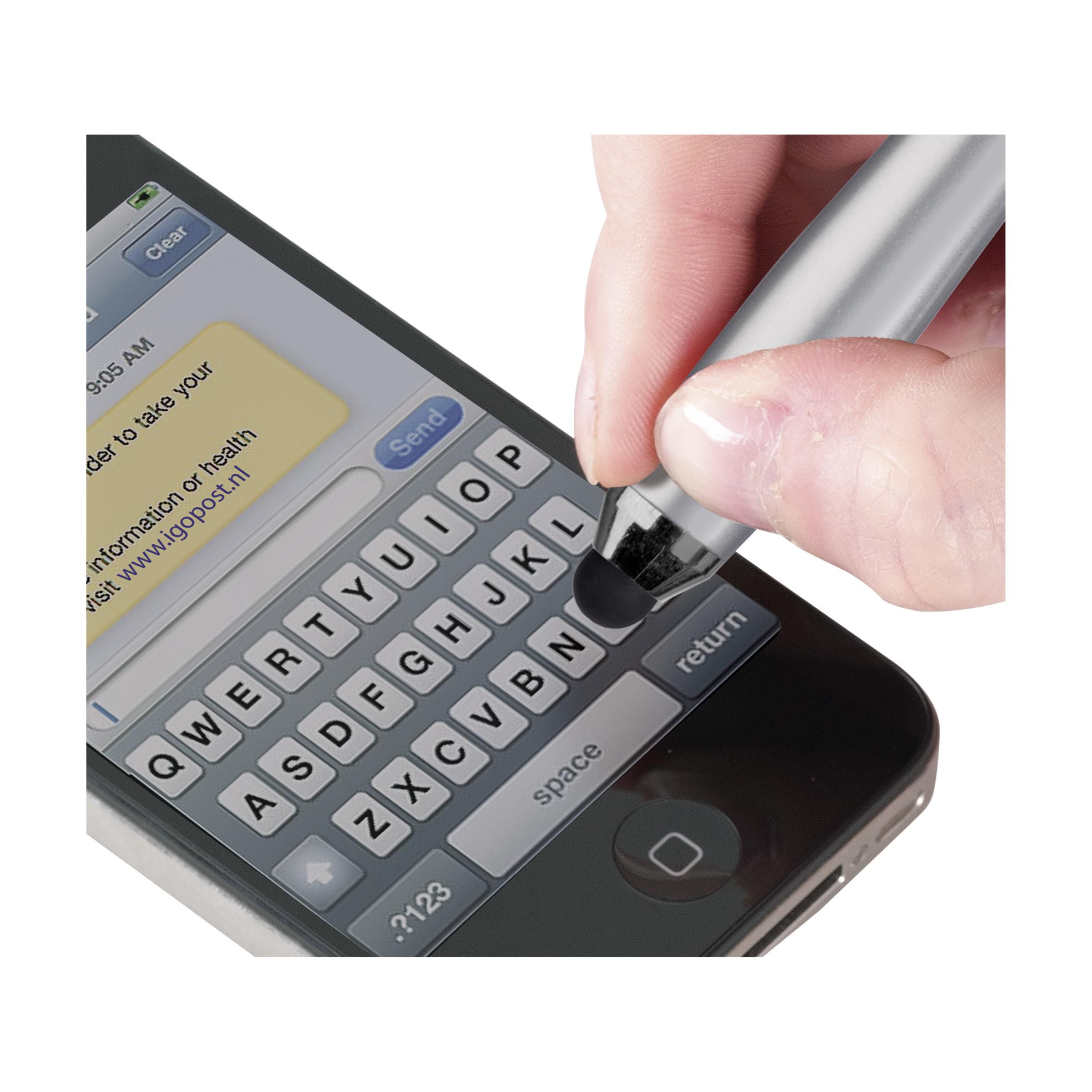 Beschreibung: Blauschreibender Kugelschreiber mit farbiger, gummierter Spitze / Pointer zum Bedienen von Touchscreens (wie iPhone / iPad), hochglänzenden Akzenten, farbigem, grifffestem Vorderteil, Aussparungen im Metallclip und Dreh-Klicksystem.