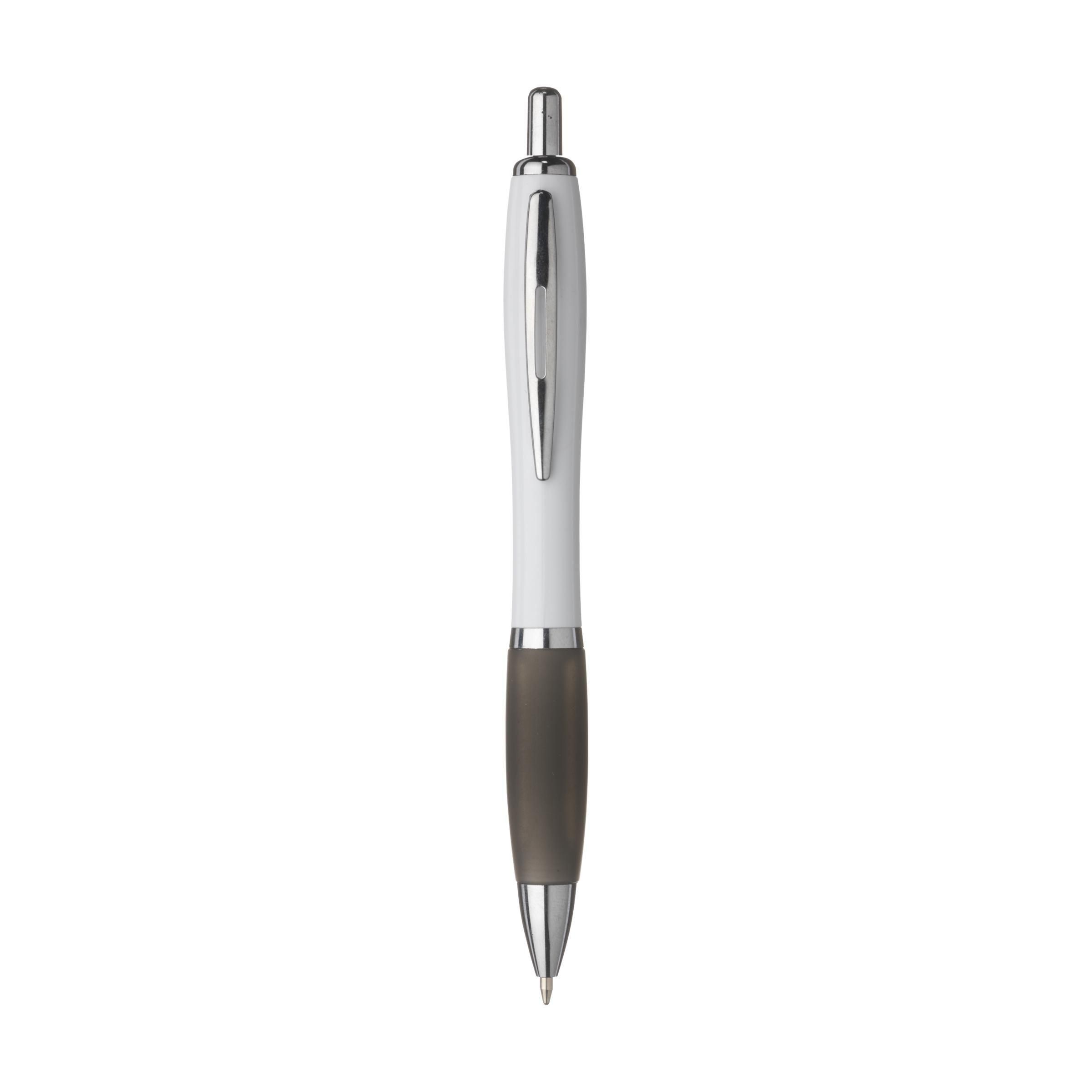 Beschreibung: Blauschreibender oder schwarzschreibender Kugelschreiber mit weißem Gehäuse, farbigem, grifffestem Vorderstück und Metallclip.