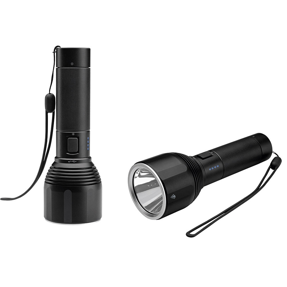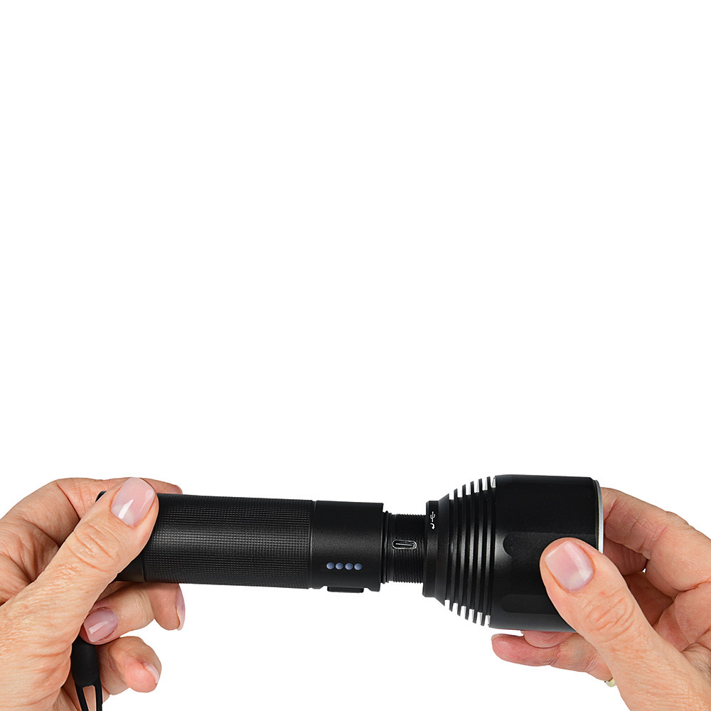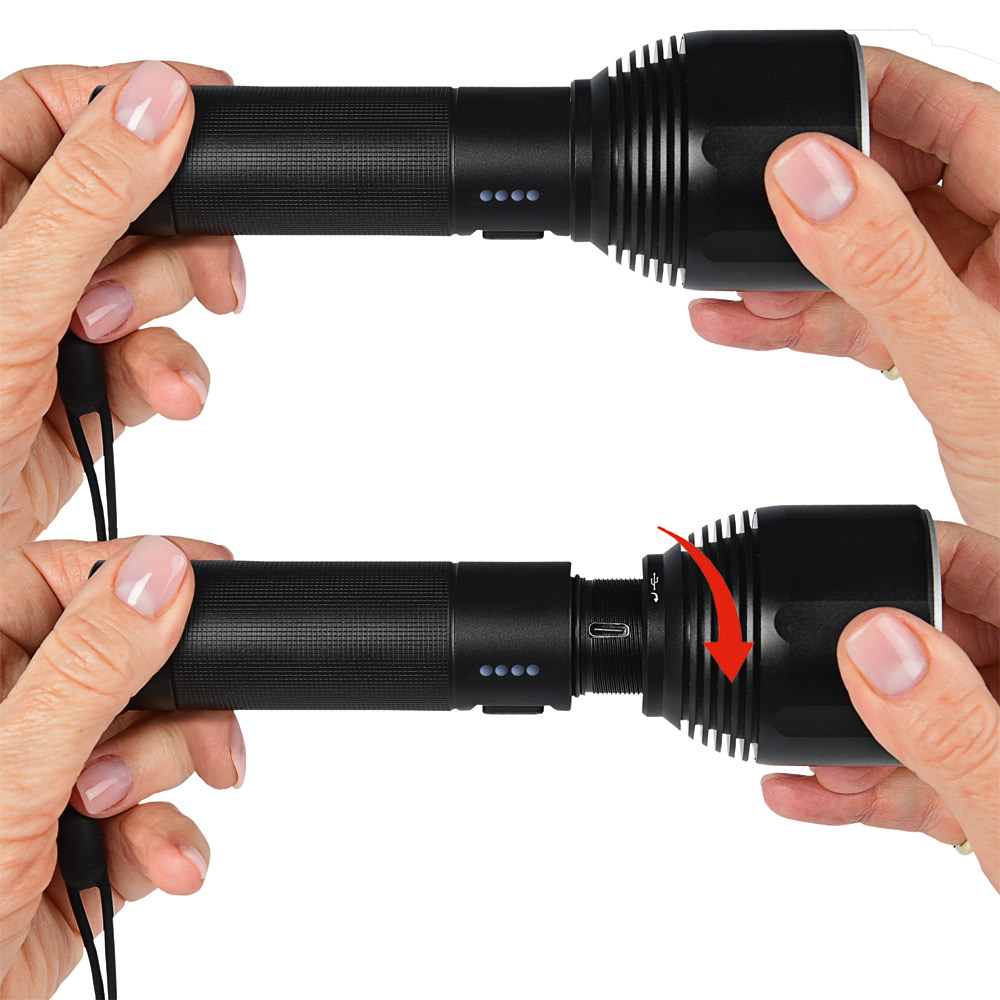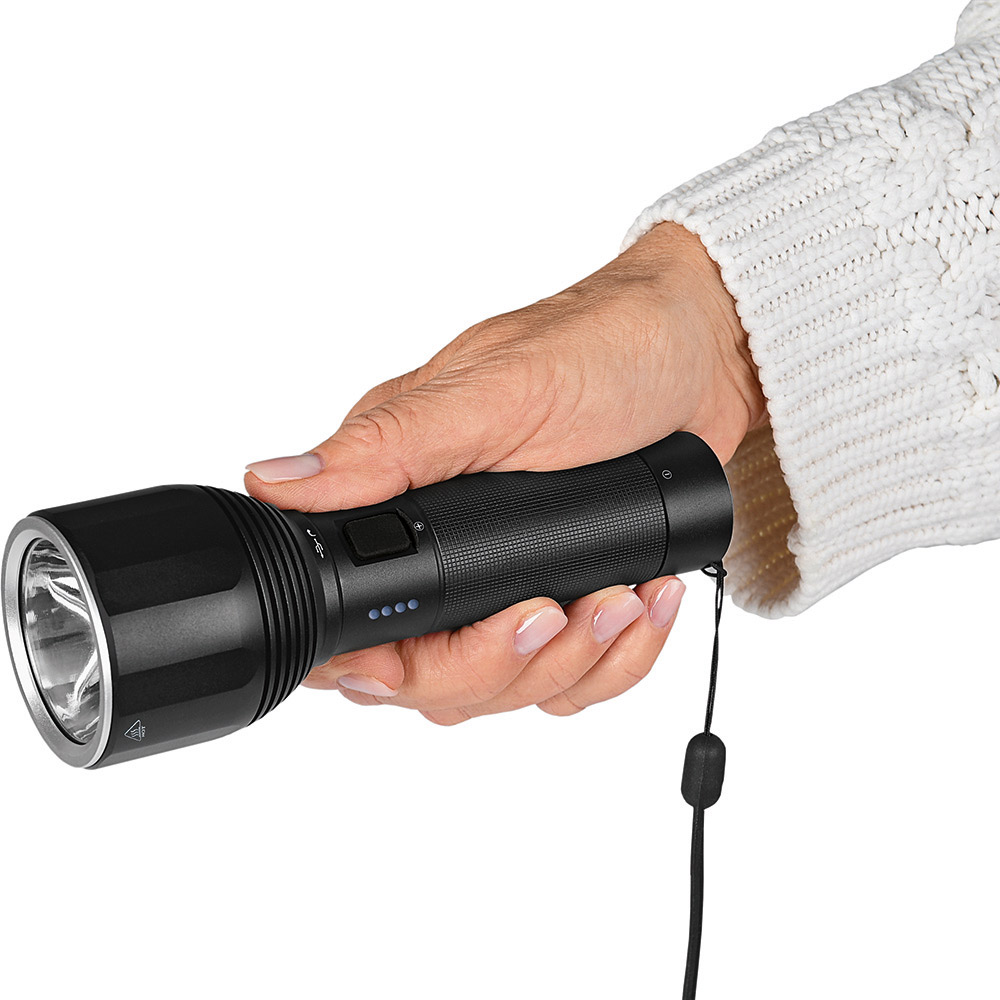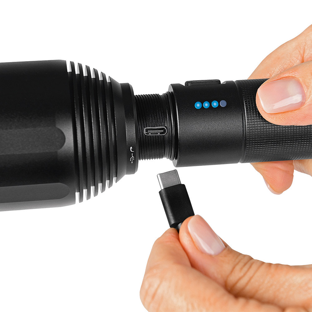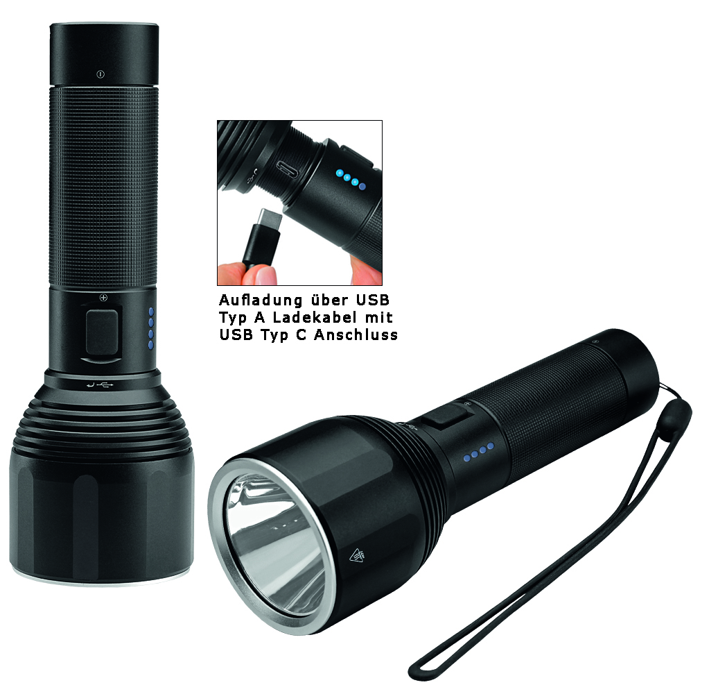 Aufladbare 20W CREE® LED Taschenleuchte mit Signallichtfunktion. Eine effiziente und nachhaltige Lichtquelle, die durch eine absolut leistungsstarke 2000 Lumen LED mit geringem Energieverbrauch und 300 Meter Leuchtweite besticht. Die LED lässt sich für einen vielseitigen Einsatz in 5 verschiedene Leuchtmodi schalten. Der aufladbare Akku ersetzt eine große Menge Einwegbatterien und macht diese äußerst hochwertige Leuchte zu einer nachhaltigen, umweltfreundlichen Alternative zu batteriebetriebenen Leuchten. Das passende Ladekabel sowie der Akku sind im Lieferumfang enthalten. Gehäuse: Aluminium eloxiert. Leuchtmittel: 20W CREE® SMD LED. Lichtwerte: 2000 Lumen, 300 Meter Leuchtweite (100% Power). Ladezeit: ca. 5 Stunden. Leuchtmodi: 100% Power weißes Licht / 50% Power weißes Licht / 30% Power weißes Licht / Strobe weißes Licht / S. O.S. weißes Licht. Equipment: Handschlaufe, Ladestandanzeige, USB Typ A / USB Typ C Ladekabel (100 cm Länge). Schutzklasse: IP44. Stromversorgung: 3,7V 2200mAh Li-Ionen Akku Typ 18650 (inkl.). Verpackung: schwarze Geschenkverpackung.