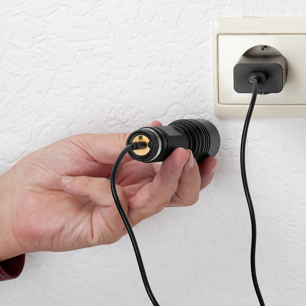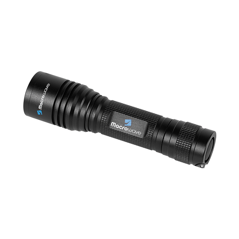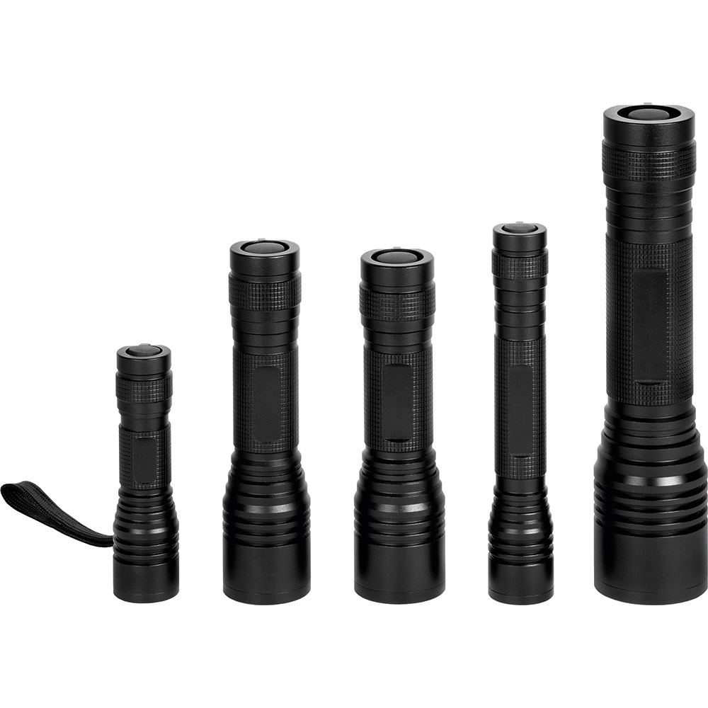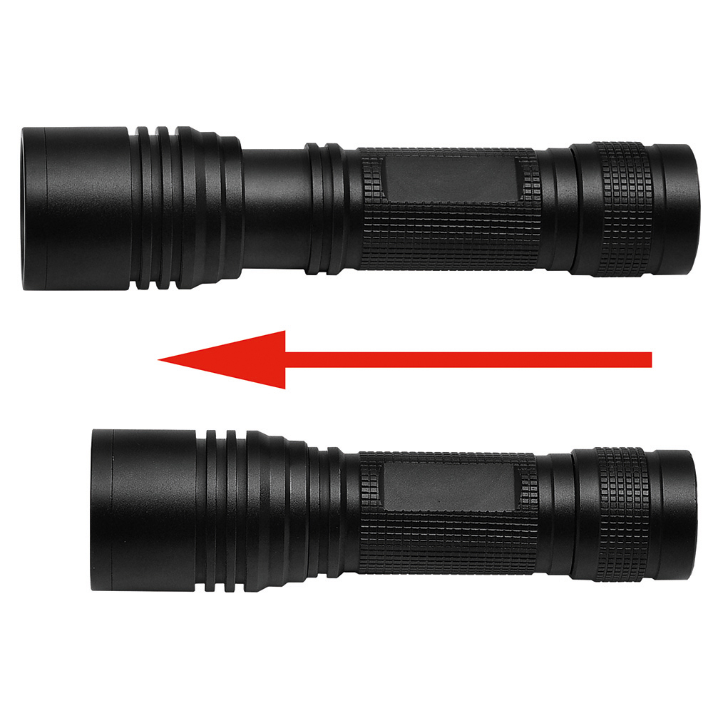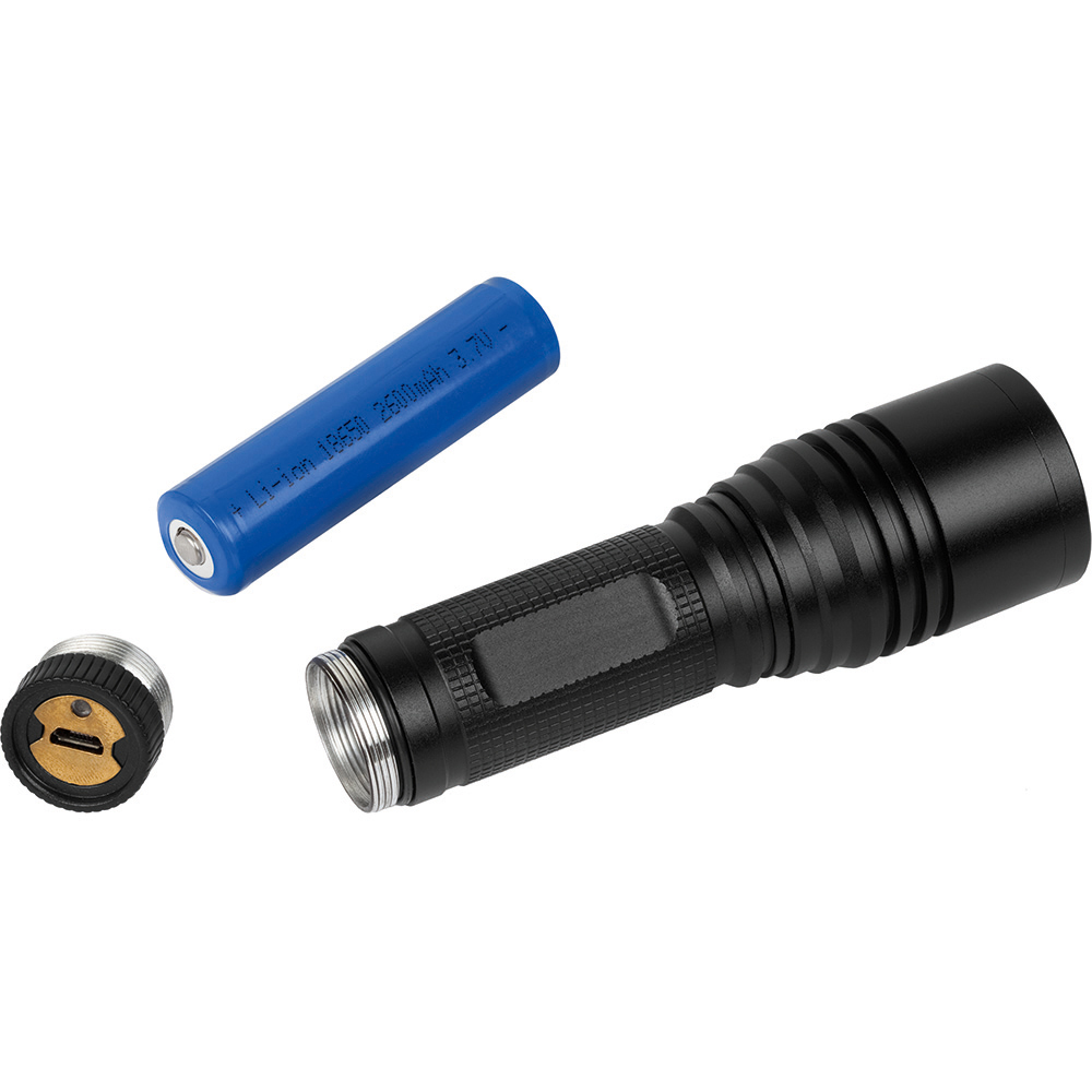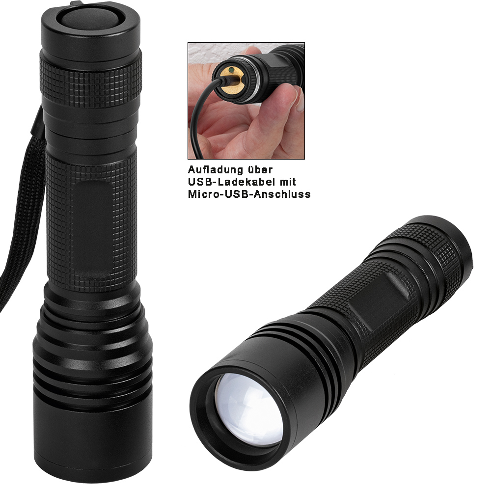 Aufladbare LED Taschenleuchte mit Fokussierung und Signallichtfunktion. Gehäuse: Aluminium eloxiert. Leuchtmittel: 5W SMD LED. Lichtwerte: 300 Lumen, 200 Meter Leuchtweite (100% Power). Ladezeit: ca. 3 Stunden. Leuchtmodi: 100% Power weißes Licht / 50% Power weißes Licht / 30% Power weißes Licht / Strobe weißes Licht / S. O.S. weißes Licht. Equipment: fokussierbar durch Herausziehen des Leuchtenkopfes, Handschlaufe, USB Typ A / Micro-USB Typ B Ladekabel (100 cm Länge), Ladestandanzeige. Schutzklasse: IP44. Stromversorgung: 3,7V 2200mAh Li-Ionen Akku Typ 18650 (inkl.). Verpackung: schwarze Geschenkverpackung.