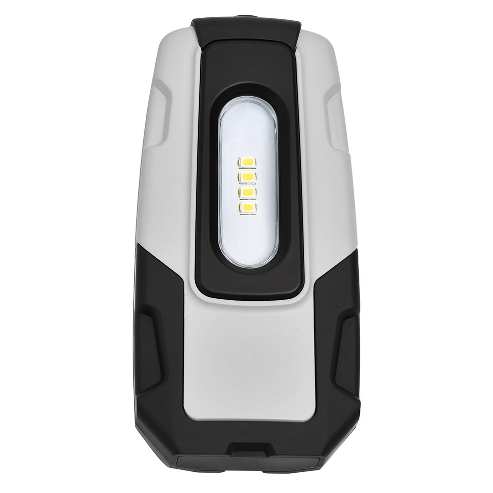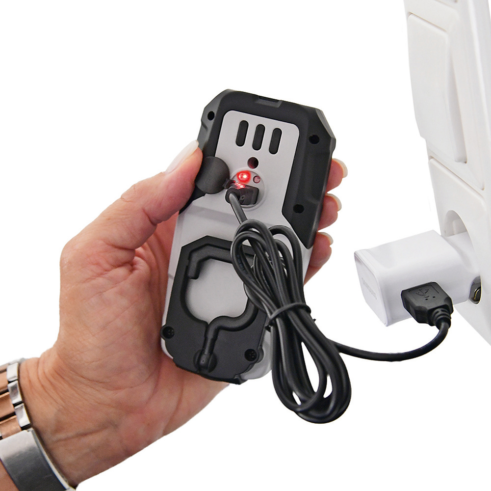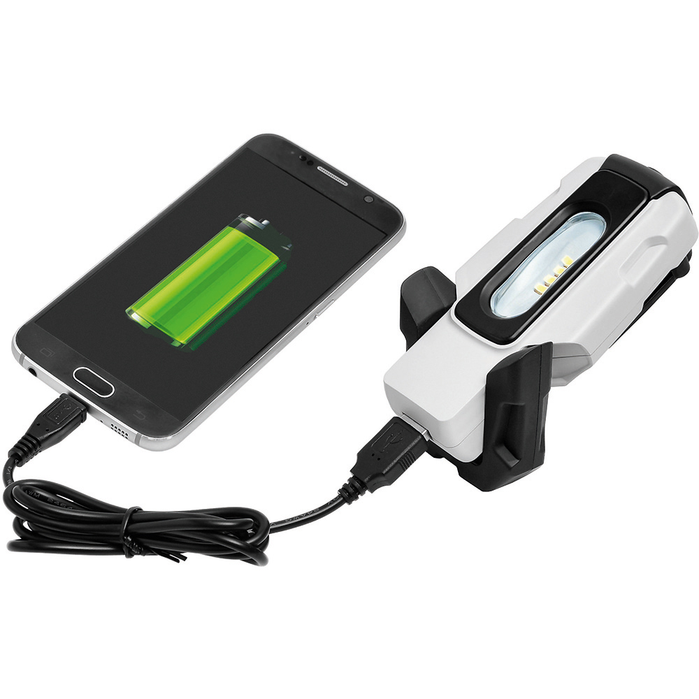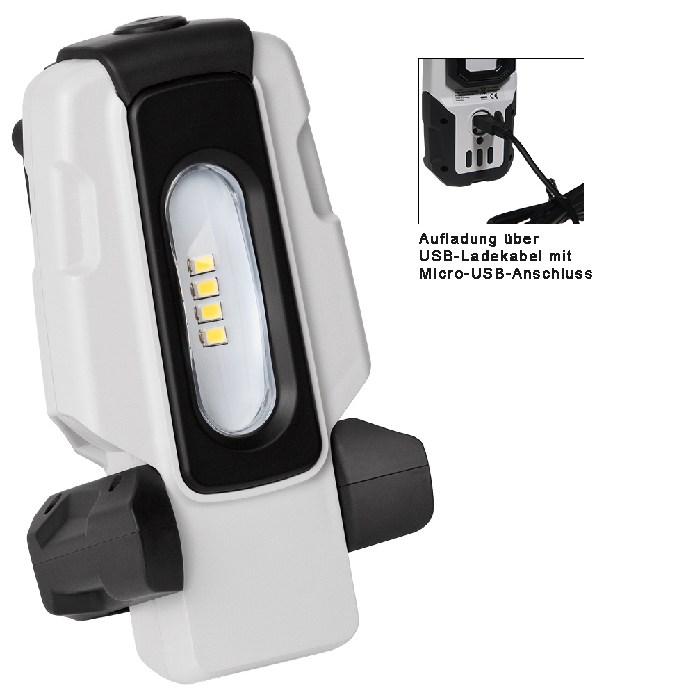 Aufladbare LED Arbeitsleuchte mit Powerbank-Funktion. Gehäuse: ABS, PC. Leuchtmittel: 4 SMD LED. Lichtwerte: 220 Lumen mit 90° Abstrahlwinkel. Leuchtdauer: ca. 5 Stunden. Ladezeit: ca. 3 Stunden. Leuchtmodi: 100% Power weißes Licht. Equipment: extra starker Magnet im Fuß, 180° schwenkbar, Gürtelclip, 360° drehbarer Fixierhaken, Ladestandanzeige, USB Typ A / Micro-USB Typ B Ladekabel (1 Meter Länge). Schutzklasse: IP20. Stromversorgung: 3,7V 1800mAh Lithium-Akku (inkl.). Verpackung: schwarze Geschenkverpackung.