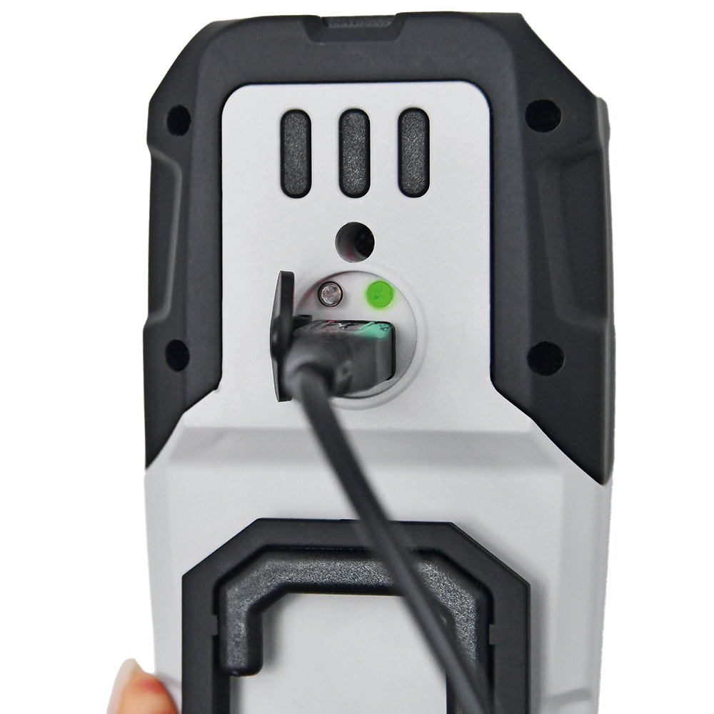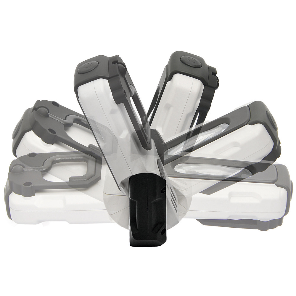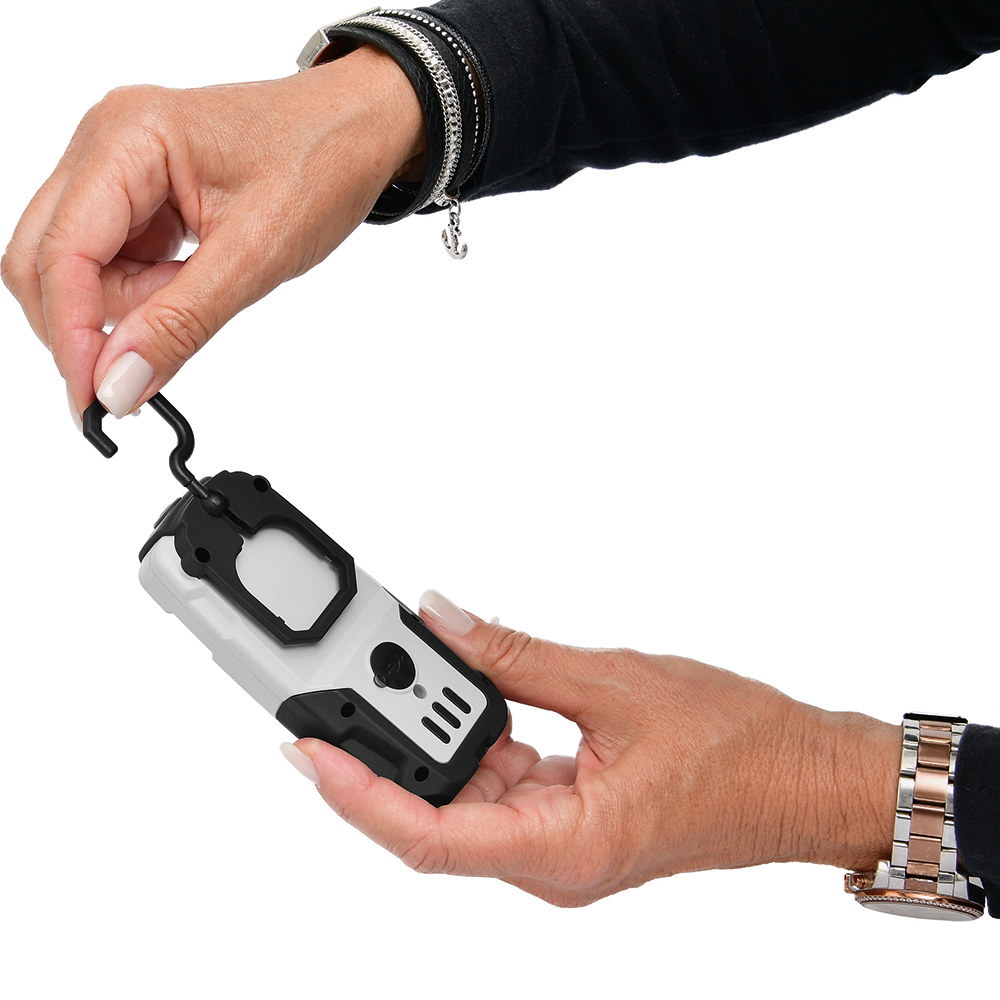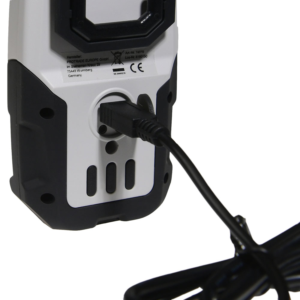 Aufladbare LED Arbeitsleuchte mit Powerbank-Funktion. Gehäuse: ABS, PC. Leuchtmittel: 4 SMD LED. Lichtwerte: 220 Lumen mit 90° Abstrahlwinkel. Leuchtdauer: ca. 5 Stunden. Ladezeit: ca. 3 Stunden. Leuchtmodi: 100% Power weißes Licht. Equipment: extra starker Magnet im Fuß, 180° schwenkbar, Gürtelclip, 360° drehbarer Fixierhaken, Ladestandanzeige, USB Typ A / Micro-USB Typ B Ladekabel (1 Meter Länge). Schutzklasse: IP20. Stromversorgung: 3,7V 1800mAh Lithium-Akku (inkl.). Verpackung: schwarze Geschenkverpackung.