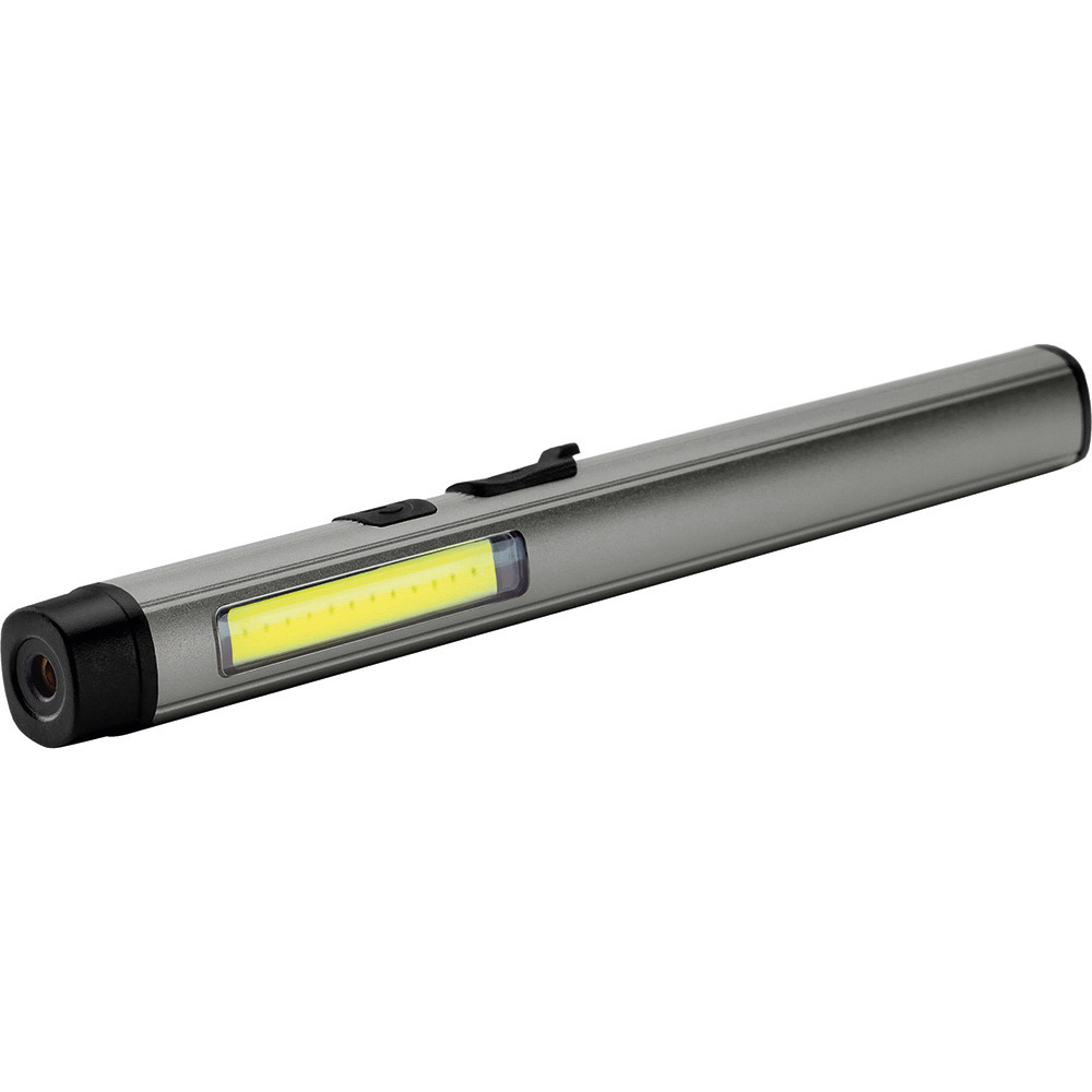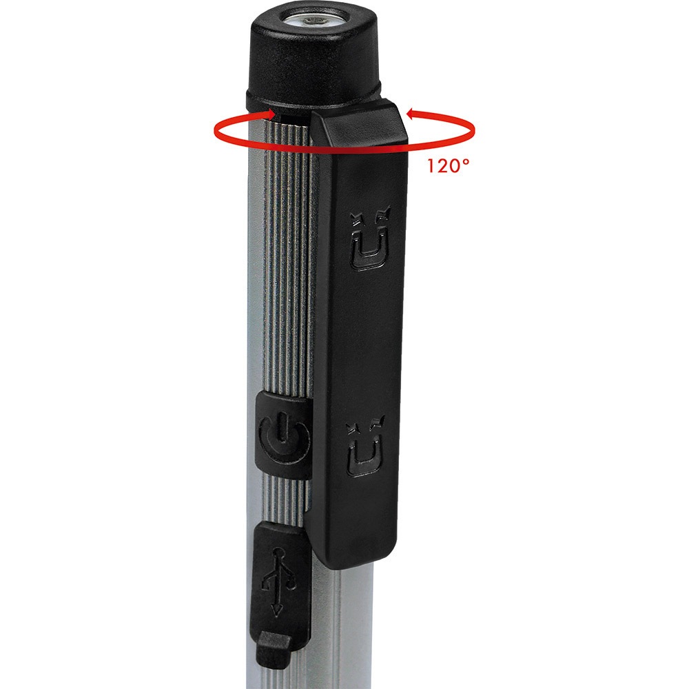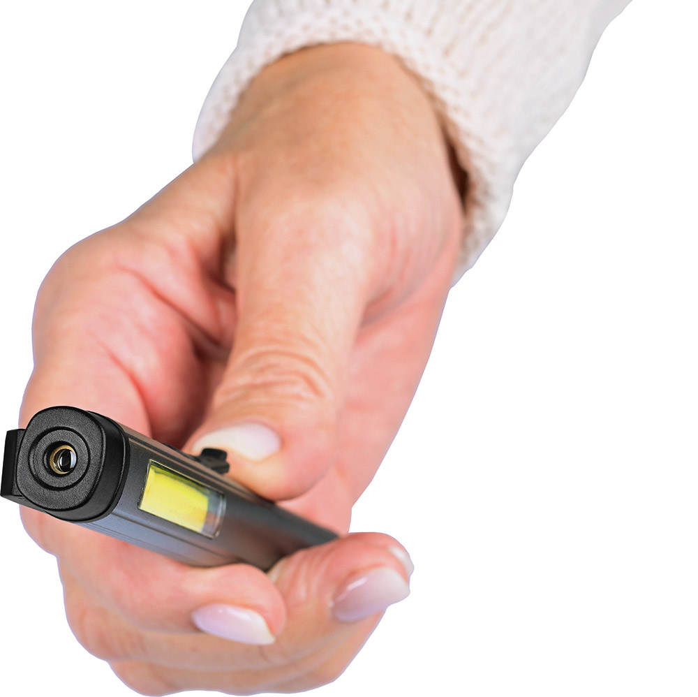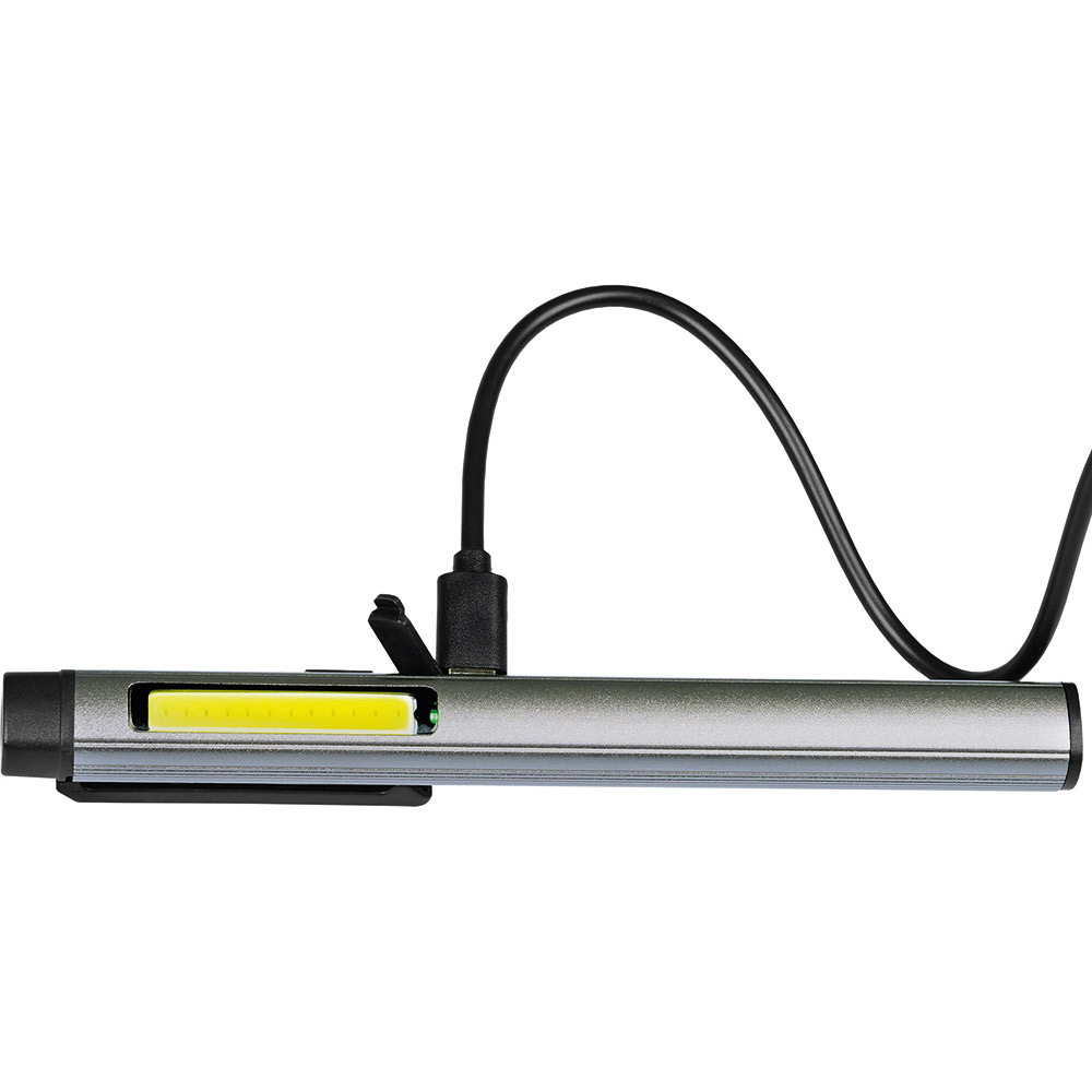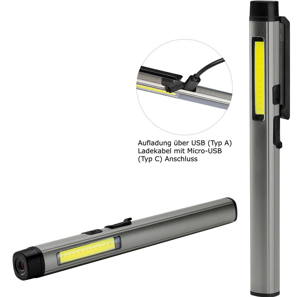 Aufladbare LED-Inspektionsleuchte mit Laser. Gehäuse: Aluminium eloxiert. Leuchtmittel: Arbeitsleuchte 3 W COB LED, Inspektionsleuchte 1 W LED, Laser 650 nm. Lichtwerte: Arbeitsleuchte 200 Lumen, Inspektionsleuchte 100 Lumen. Ladezeit: ca. 2-3 Stunden. Leuchtdauer: ca. 3-4 Stunden. Leuchtmodi: Arbeitsleuchte 100 % Power weißes Licht / 50 % Power weißes Licht, Inspektionsleuchte 100 % Power weißes Licht, Laser rot. Equipment: 120° drehbarer Clip mit starkem Magnet, Ladekontroll-LED, USB (Typ A) / USB Typ-C Ladekabel (100 cm Länge). Schutzklasse: IPX2. Laserklasse: 2. Stromversorgung: 3,7V 800mAh Li-Ionen Akku Typ 14500 (inkl.). Verpackung: schwarze Geschenkverpackung.