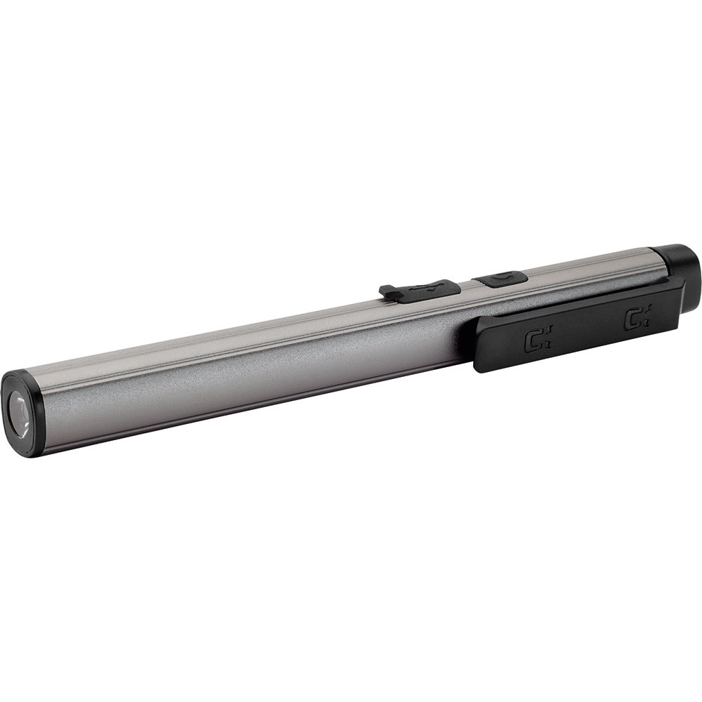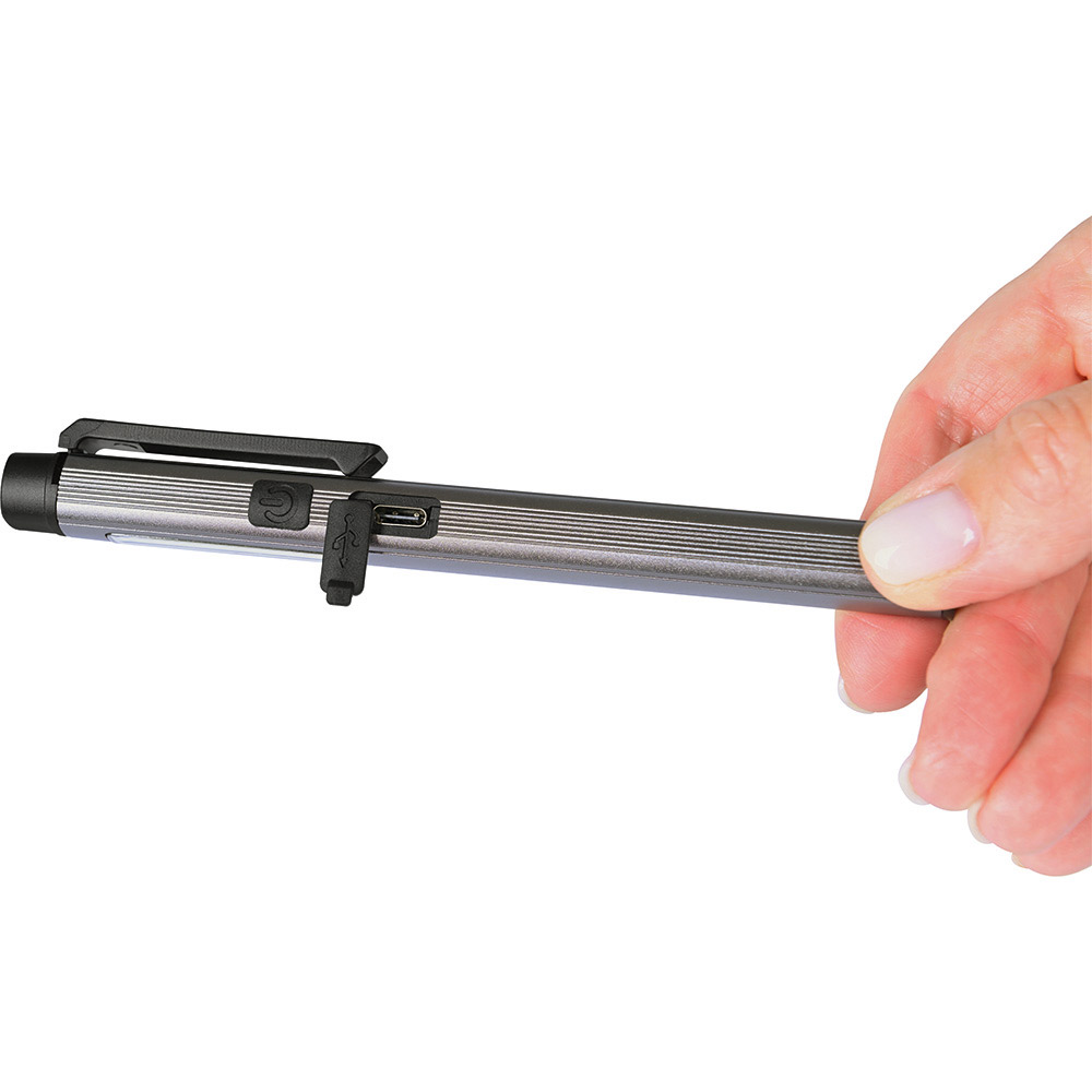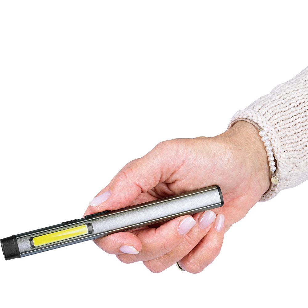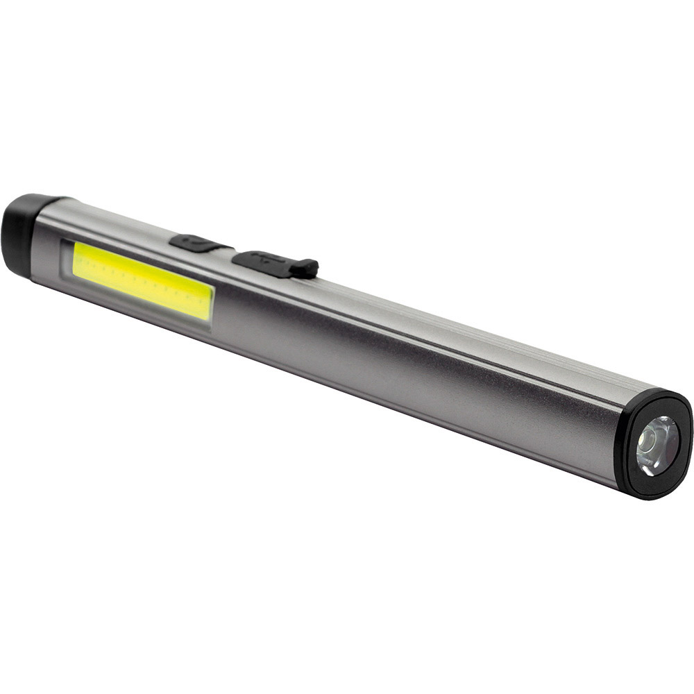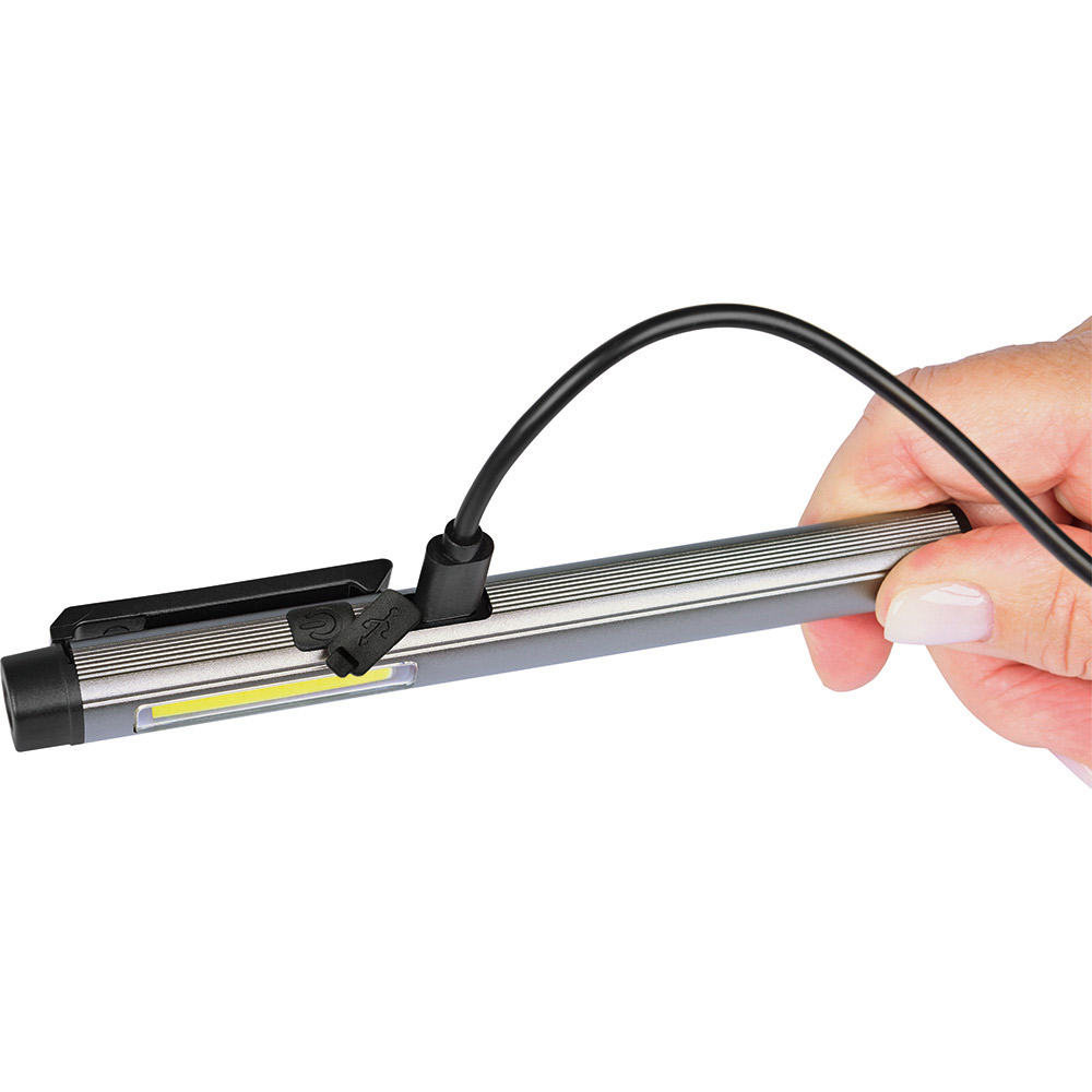Aufladbare LED-Inspektionsleuchte mit Laser. Gehäuse: Aluminium eloxiert. Leuchtmittel: Arbeitsleuchte 3 W COB LED, Inspektionsleuchte 1 W LED, Laser 650 nm. Lichtwerte: Arbeitsleuchte 200 Lumen, Inspektionsleuchte 100 Lumen. Ladezeit: ca. 2-3 Stunden. Leuchtdauer: ca. 3-4 Stunden. Leuchtmodi: Arbeitsleuchte 100 % Power weißes Licht / 50 % Power weißes Licht, Inspektionsleuchte 100 % Power weißes Licht, Laser rot. Equipment: 120° drehbarer Clip mit starkem Magnet, Ladekontroll-LED, USB (Typ A) / USB Typ-C Ladekabel (100 cm Länge). Schutzklasse: IPX2. Laserklasse: 2. Stromversorgung: 3,7V 800mAh Li-Ionen Akku Typ 14500 (inkl.). Verpackung: schwarze Geschenkverpackung.