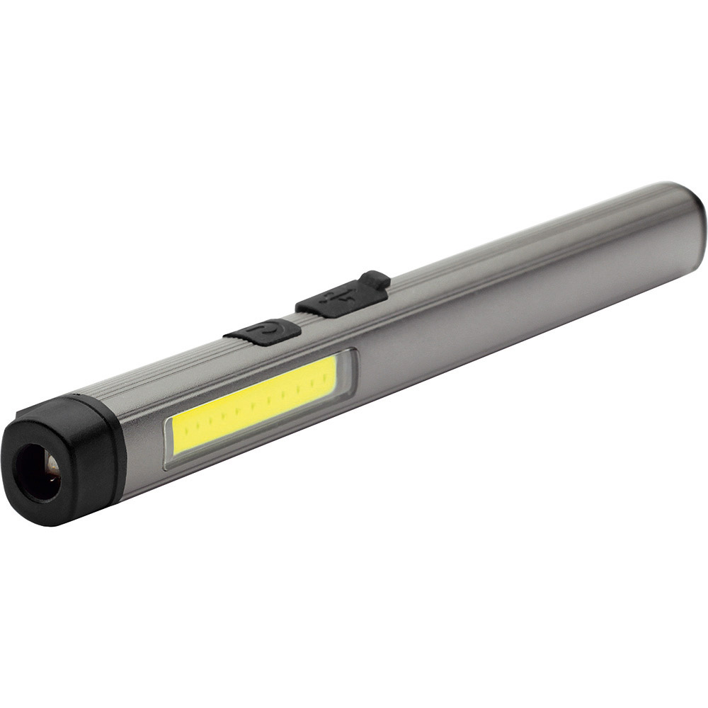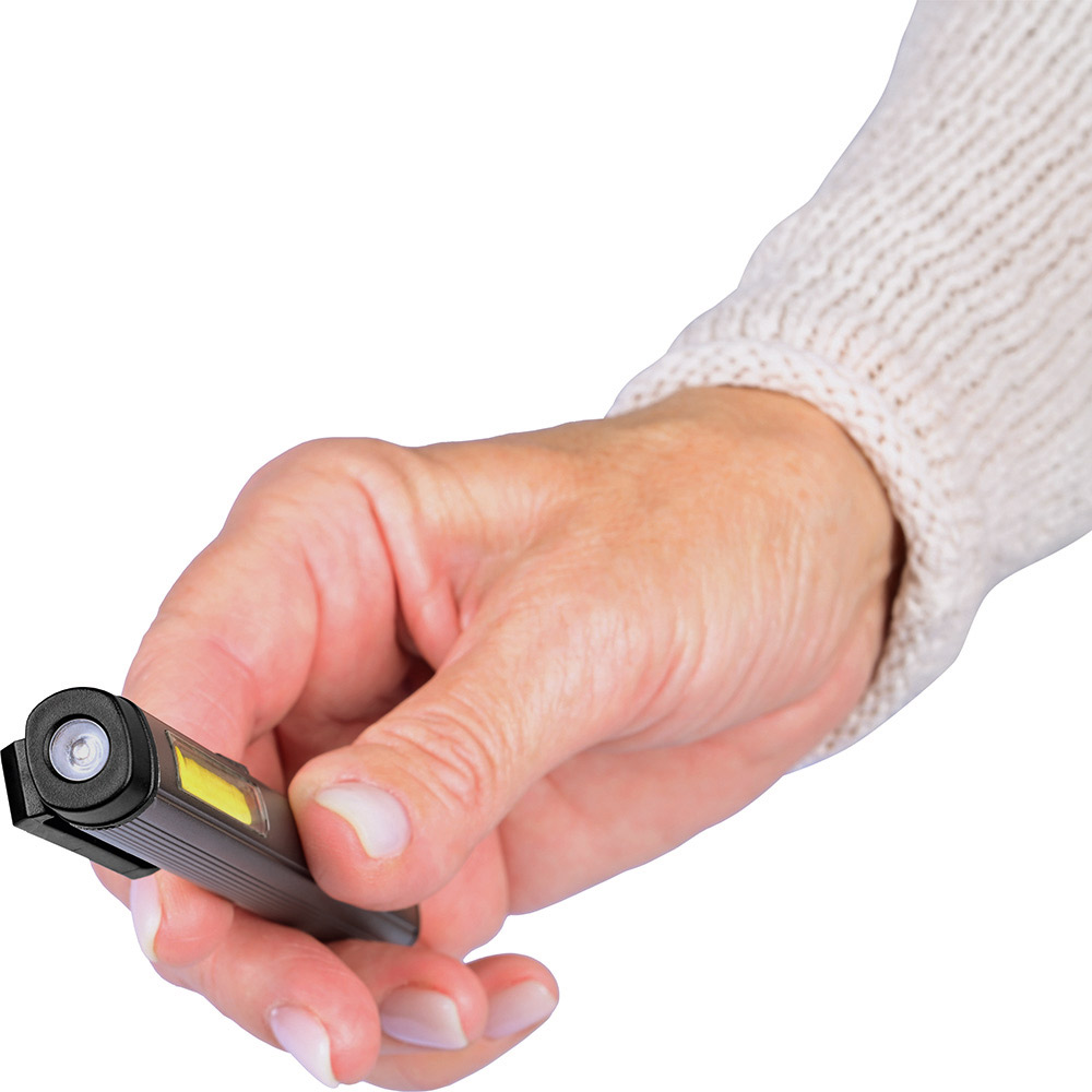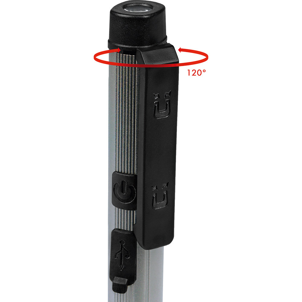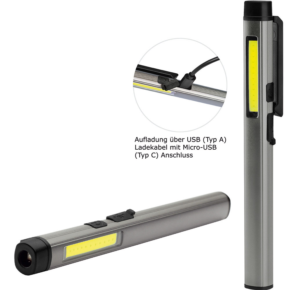 Aufladbare LED-Inspektionsleuchte mit UV-Licht. Gehäuse: Aluminium eloxiert. Leuchtmittel: Arbeitsleuchte 3 W COB LED, Inspektionsleuchte 1 W LED, UV-Licht 365 nm. Lichtwerte: Arbeitsleuchte 200 Lumen, Inspektionsleuchte 100 Lumen. Ladezeit: ca. 2-3 Stunden. Leuchtdauer: ca. 3-4 Stunden. Leuchtmodi: Arbeitsleuchte 100 % Power weißes Licht / 50 % Power weißes Licht, Inspektionsleuchte 100 % Power weißes Licht, UV-Licht. Equipment: 120° drehbarer Clip mit starkem Magnet, Ladekontroll-LED, USB (Typ A) / USB Typ-C Ladekabel (100 cm Länge). Schutzklasse: IP44. Stromversorgung: 3,7V 800mAh Li-Ionen Akku Typ 14500 (inkl.). Verpackung: schwarze Geschenkverpackung.