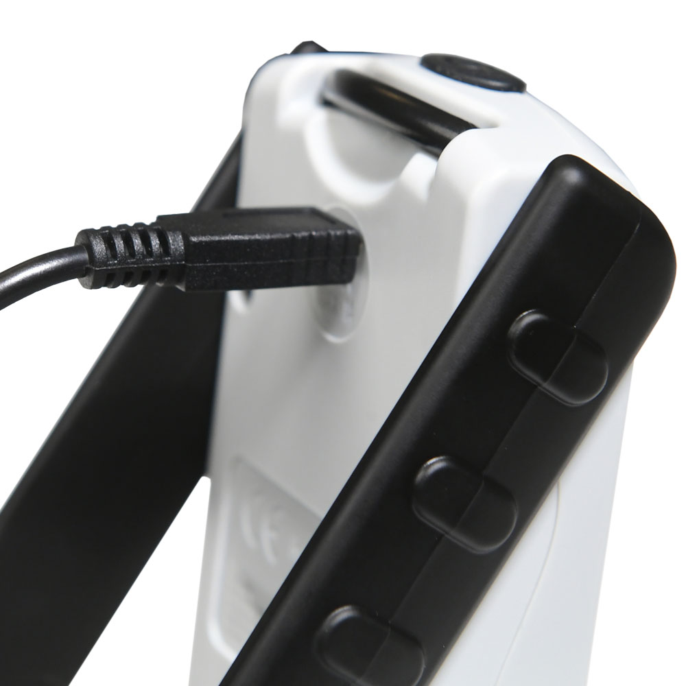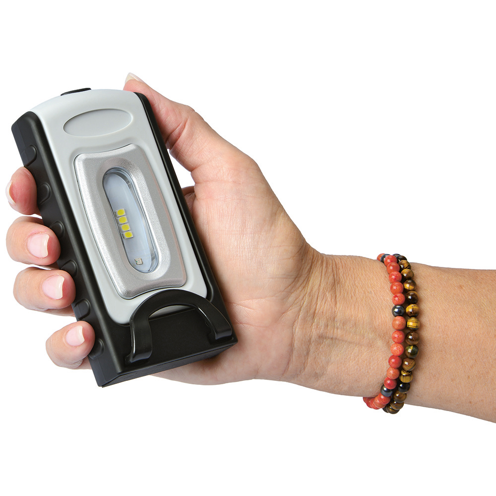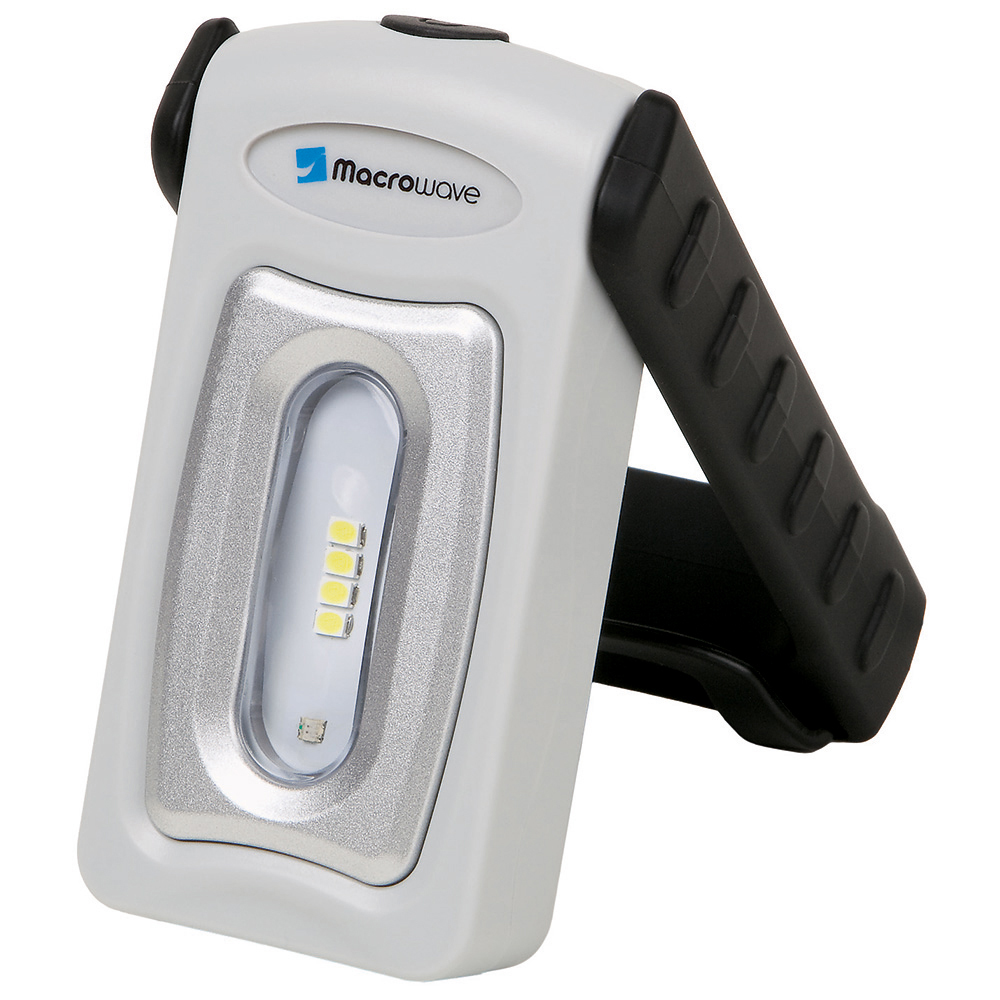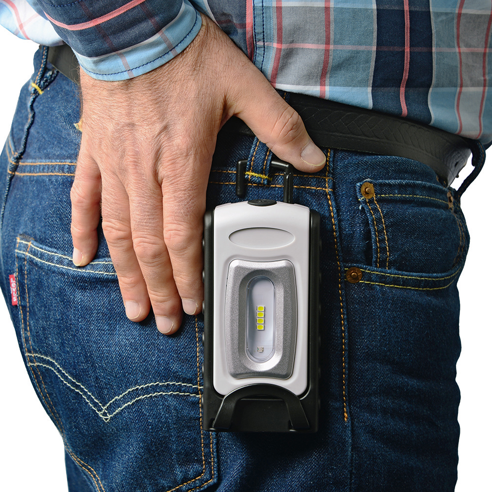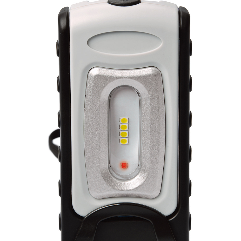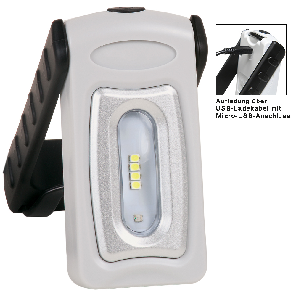 Aufladbare LED Arbeitsleuchte. Gehäuse: ABS, PC, POM. Leuchtmittel: 4 SMD LED. Lichtwerte: 280 Lumen mit 101° Abstrahlwinkel. Leuchtdauer: ca. 2 Stunden. Ladezeit: ca. 4 Stunden. Leuchtmodi: 100% Power weißes Licht. Equipment: Handschlaufe, extra starker Magnet im Fuß, 340° schwenkbar, Gürtelclip, 360° drehbarer Fixierhaken, Ladestandanzeige, USB Typ A / Micro-USB Typ B Ladekabel (1,20 Meter Länge). Schutzklasse: IP20. Stromversorgung: 3,7V 1200mAh Lithium-Akku (inkl.). Verpackung: schwarze Geschenkverpackung.