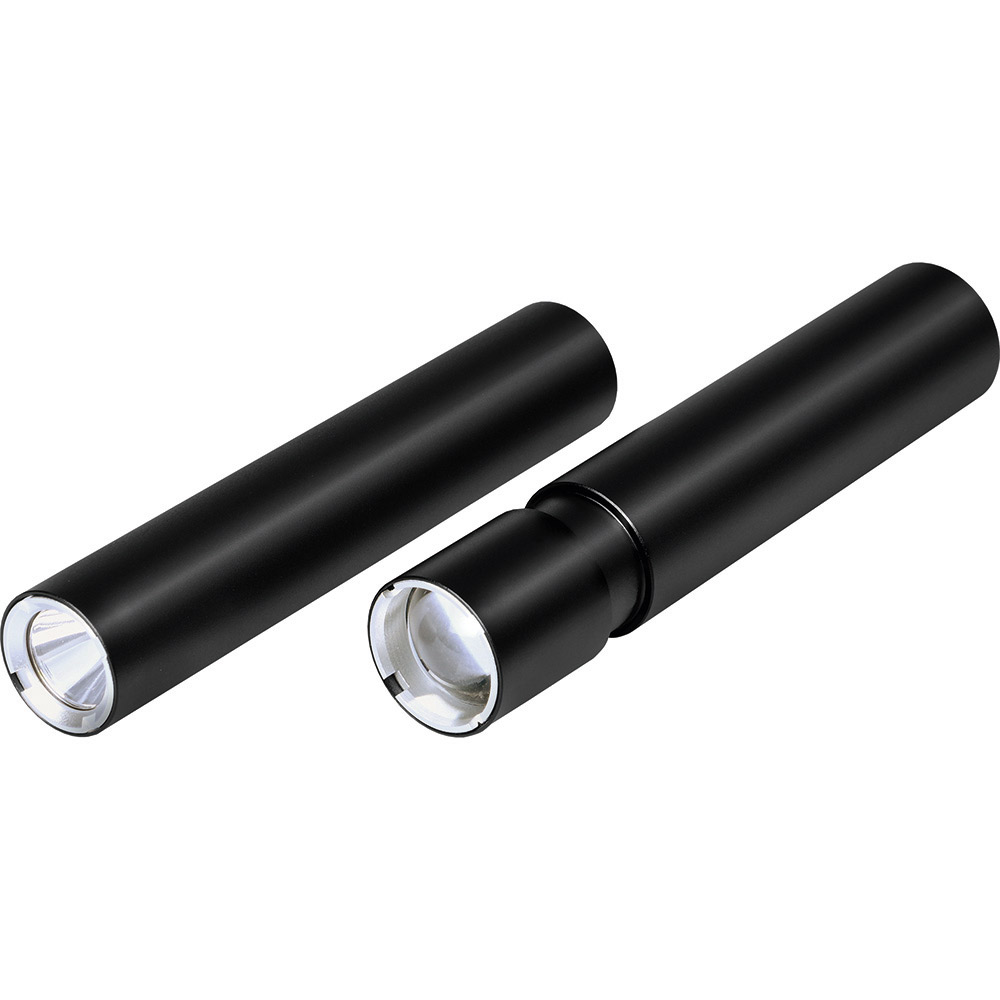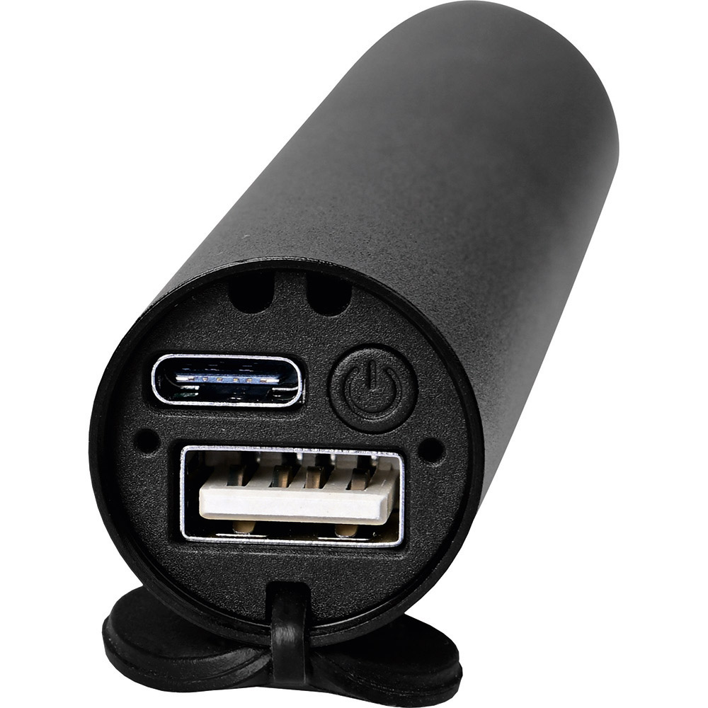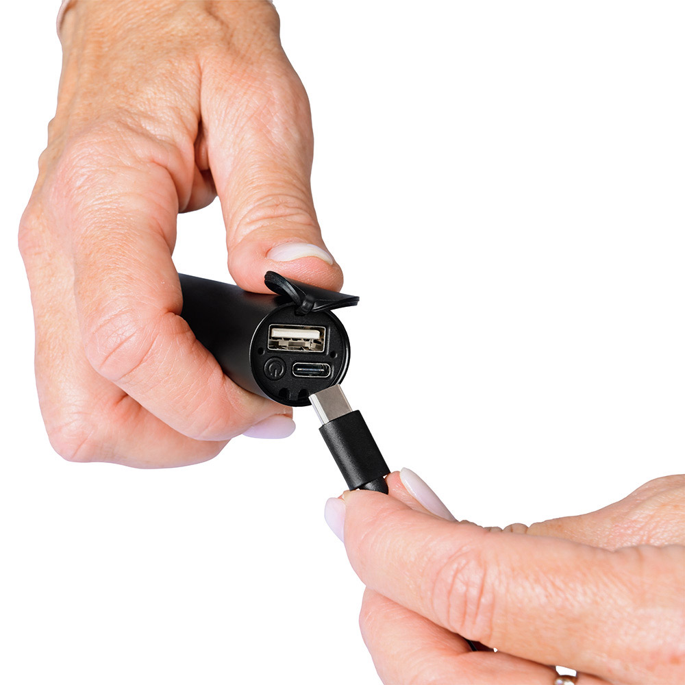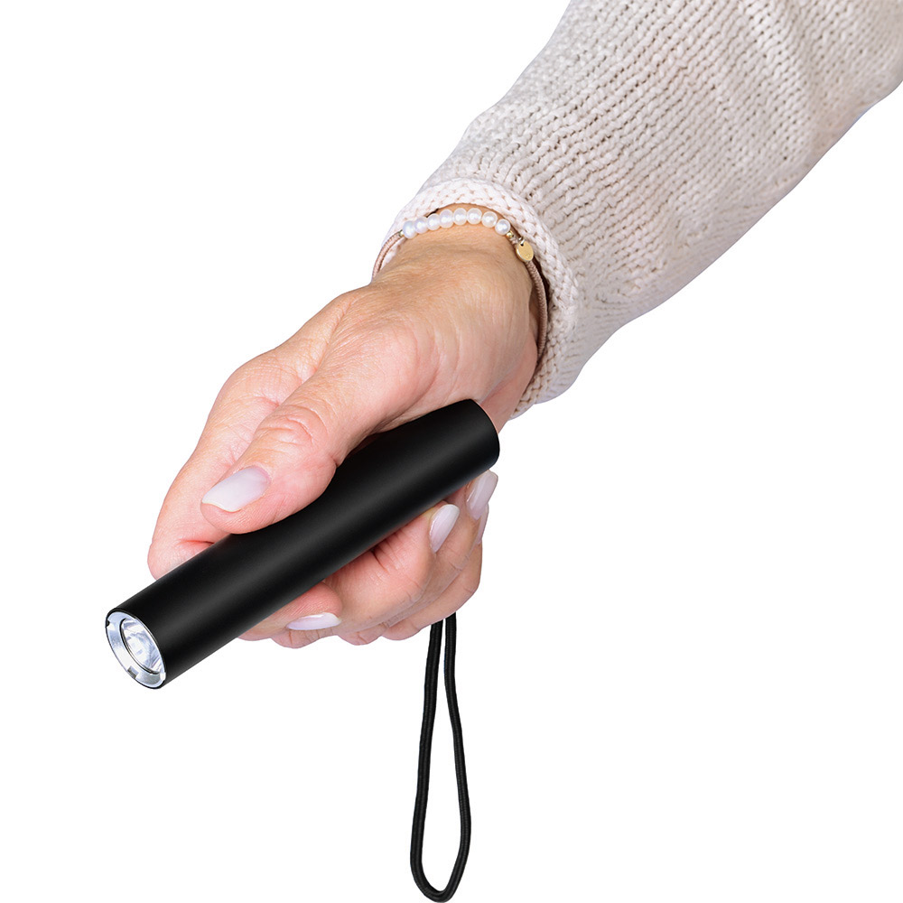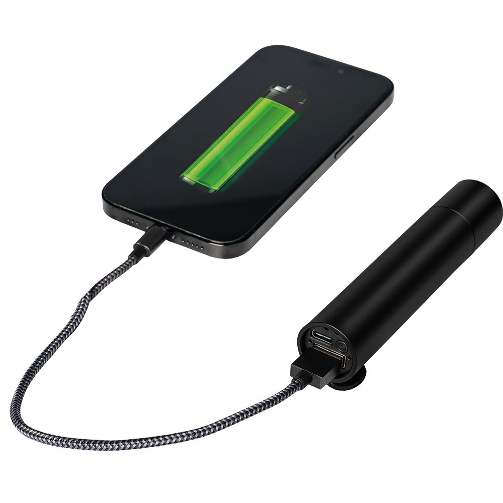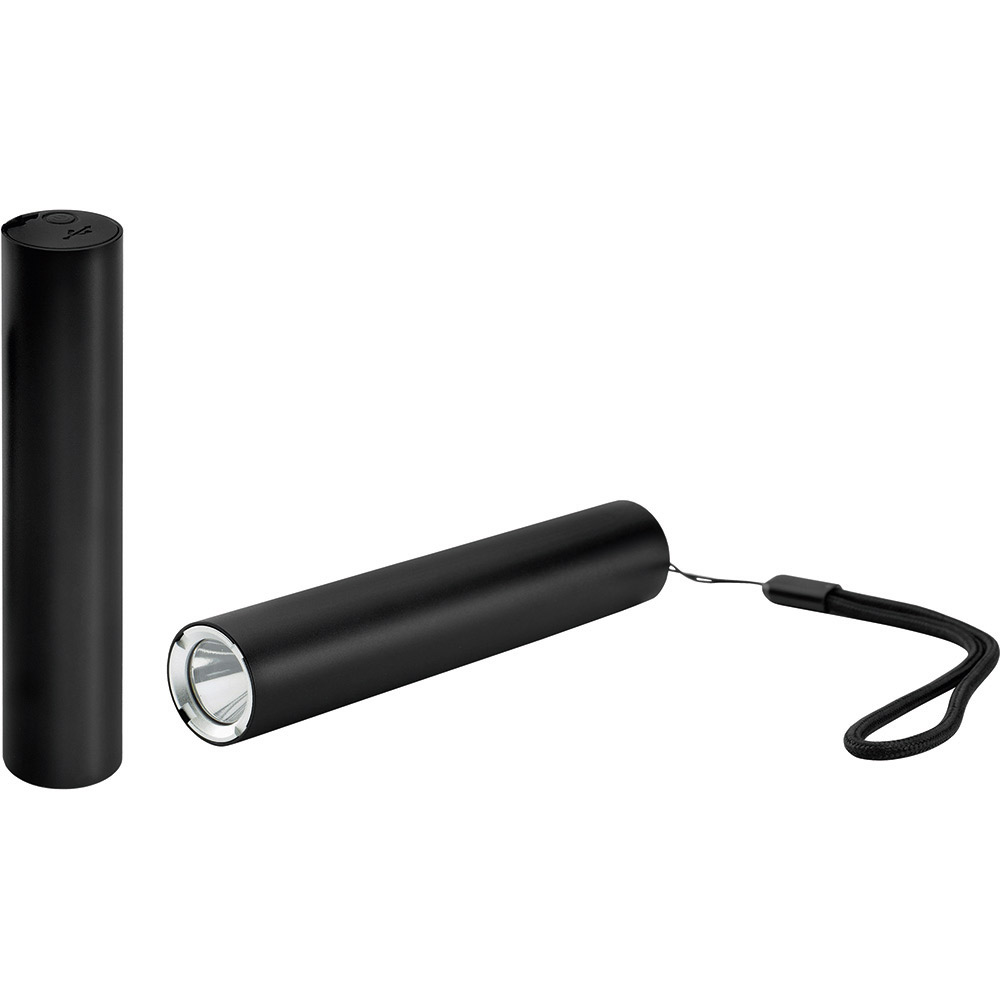 Aufladbare LED-Taschenleuchte mit Dimmfunktion und Powerbank-Funktion. Gehäuse: Aluminium eloxiert. Leuchtmittel: 5 W SMD LED. Lichtwerte: 270 Lumen. Ladezeit: ca. 3,5 Stunden. Leuchtdauer: ca. 3 Stunden. Leuchtmodi: 100 % Power weißes Licht dimmbar / Blinklicht weiß / S. O.S. Licht weiß. Equipment: Handschlaufe, Ladekontroll-LED, USB (Typ A) / USB (Typ C) Ladekabel (50 cm Länge). Schutzklasse: IPX2. Stromversorgung: 3,7V 2000mAh Li-Ionen Akku Typ 18650 (inkl.). Verpackung: schwarze Geschenkverpackung.