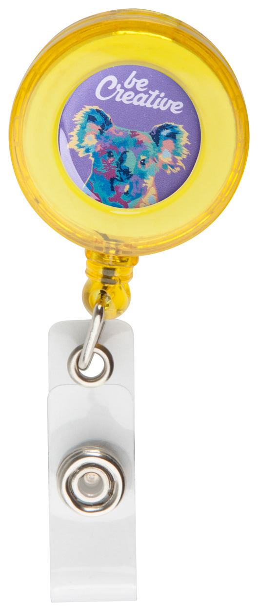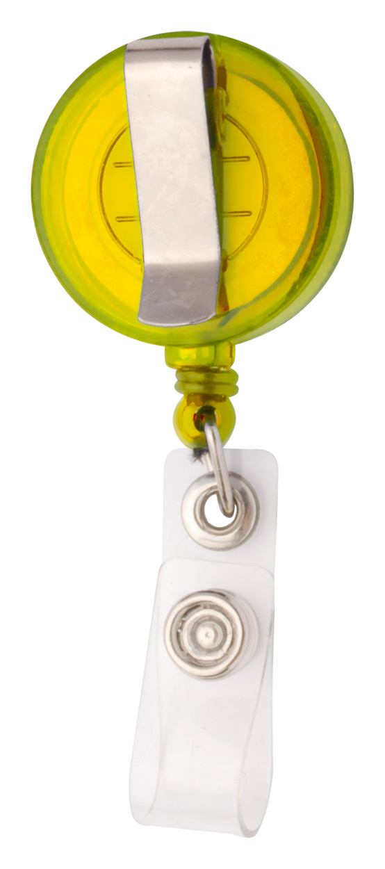 Ausweishalter mit Zugschnur und Druckknopf, aus transparentem Kunststoff.