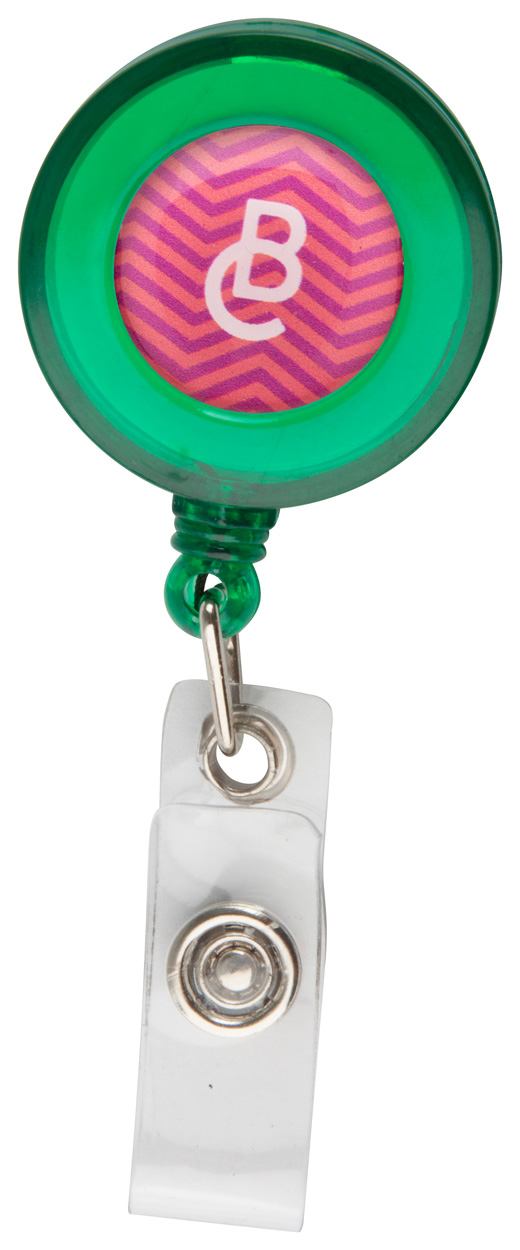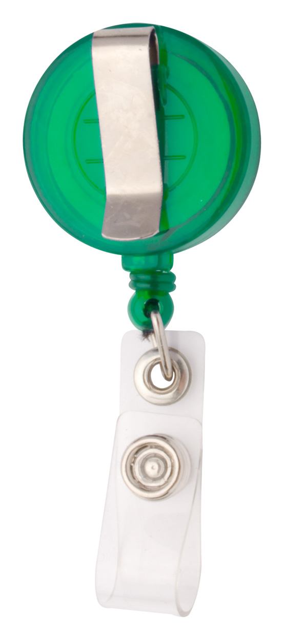 Ausweishalter mit Zugschnur und Druckknopf, aus transparentem Kunststoff.