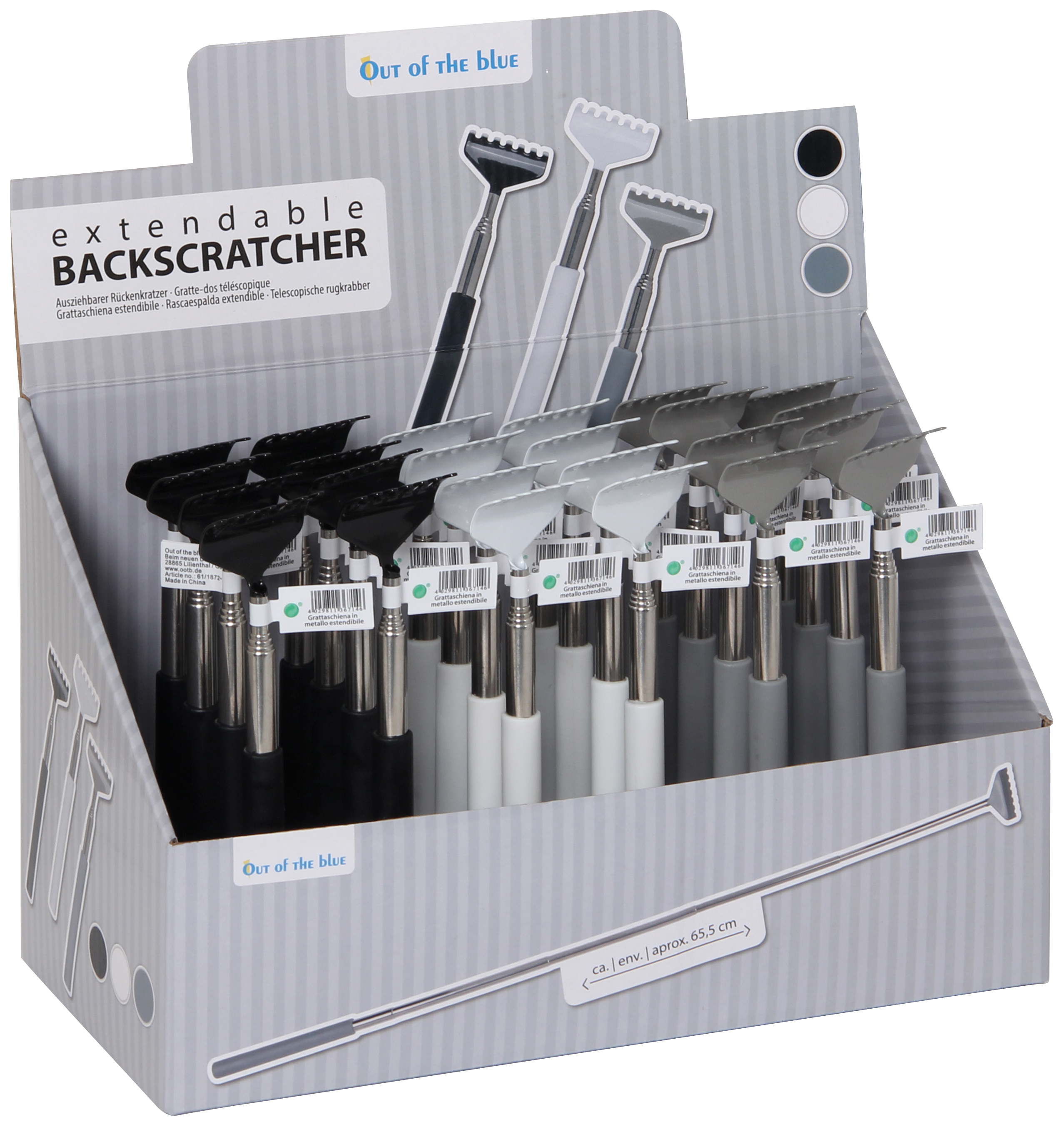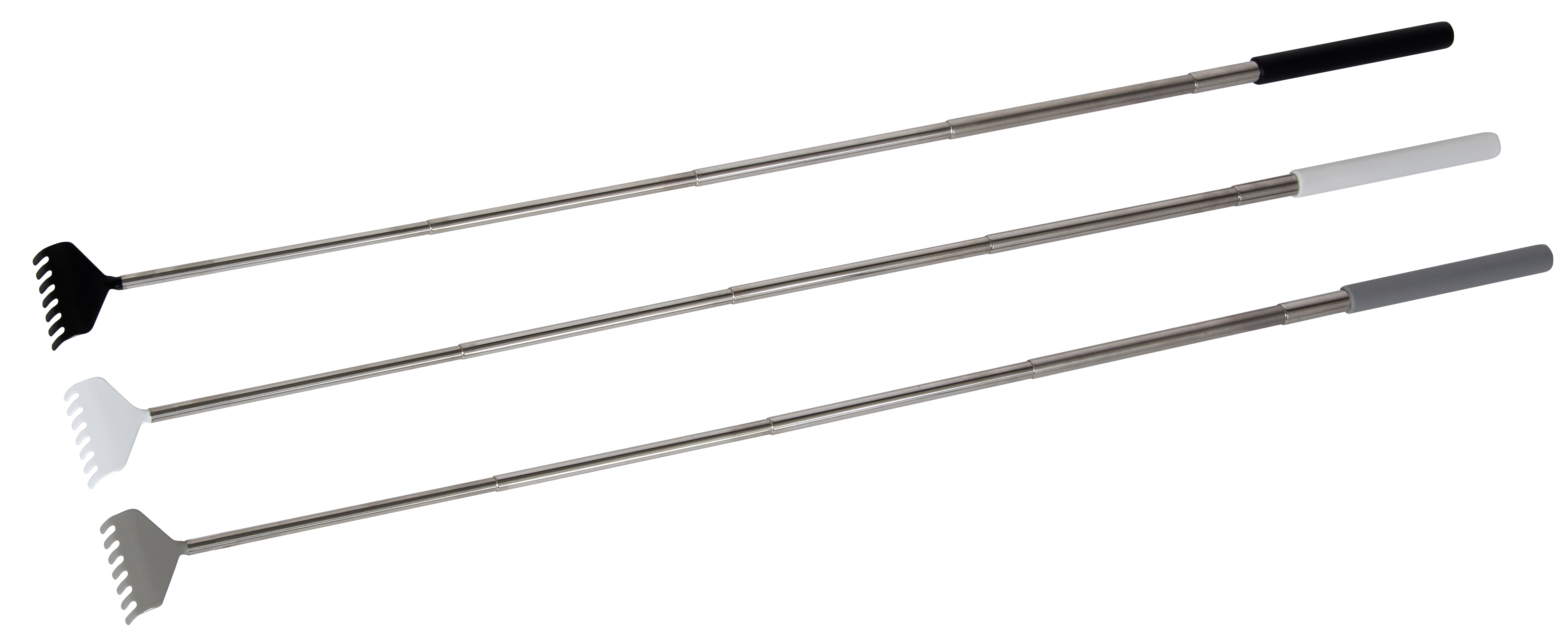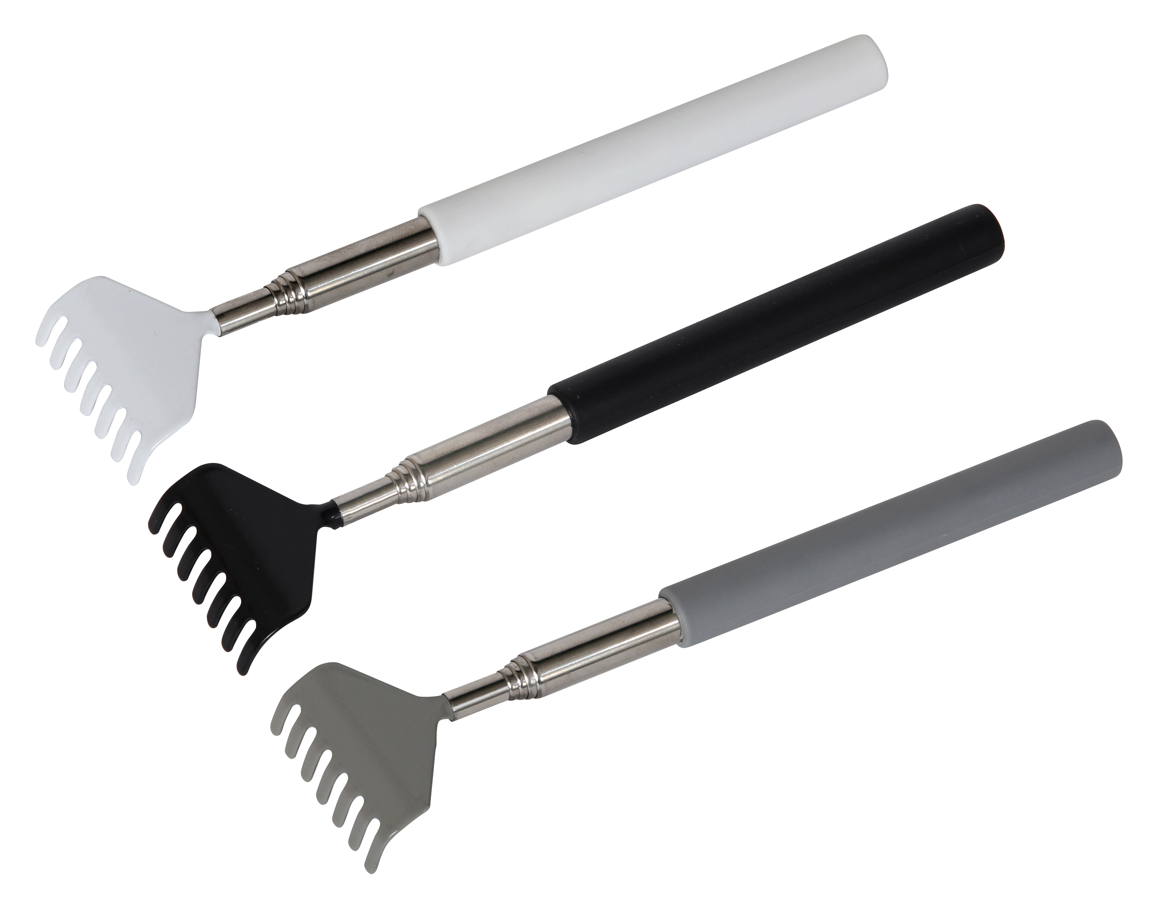Platzsparender Rückenkratzer mit gummiertem Griff, bis zu 65,5cm ausziehbar. In 3 Farben sortiert: schwarz, weiß und grau.