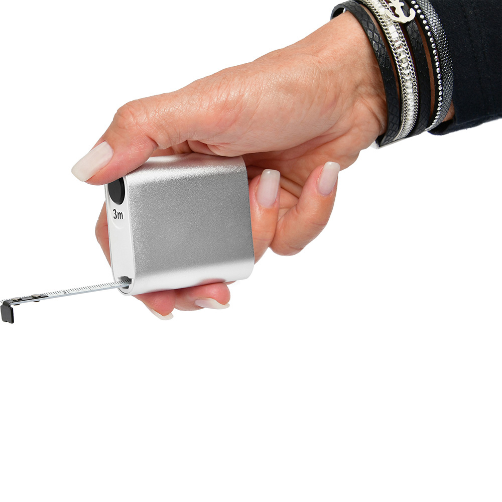 3 Meter Bandmaß aus Aluminium mit automatischem Bandfeststellmechanismus. Durch den komfortablen automatischen Bandfeststellmechanismus bleibt das Band in der gewünschten Länge fixiert und wird durch Drücken des Knopfes durch den dynamischen Bandrücklauf wieder eingeholt. Der bewegliche Bandanfangshaken ermöglicht exaktes Messen auf Stoß und Zug. Gehäuse: Aluminium eloxiert, ABS. Band: 3 m/12,5 mm, lackiert. Knickfestigkeit: 1,20 m. Skalierung: cm, einseitig. Genauigkeitsklasse: EG-Klasse II. Ausstattung: automatischer Bandfeststellmechanismus, dynamischer Bandrücklauf, beweglicher Bandanfangshaken. Verpackung: schwarze Geschenkverpackung.