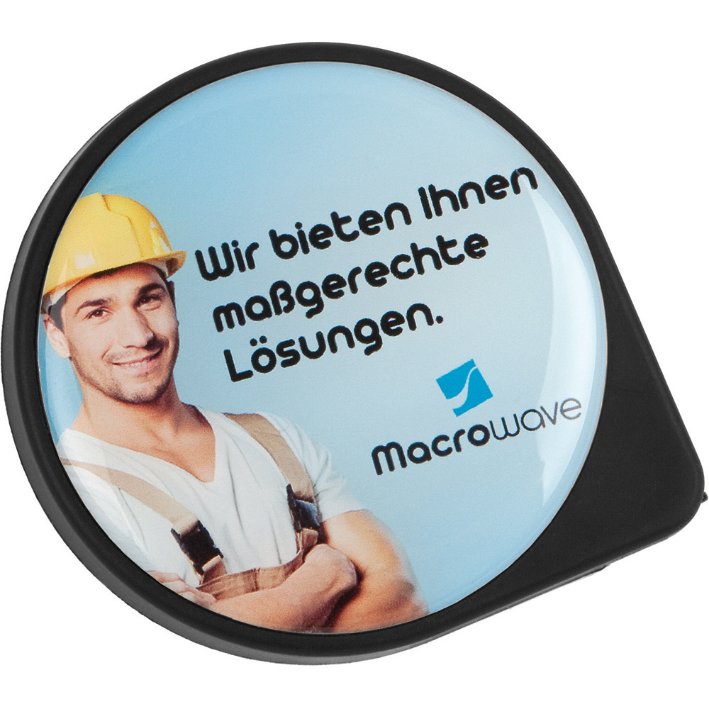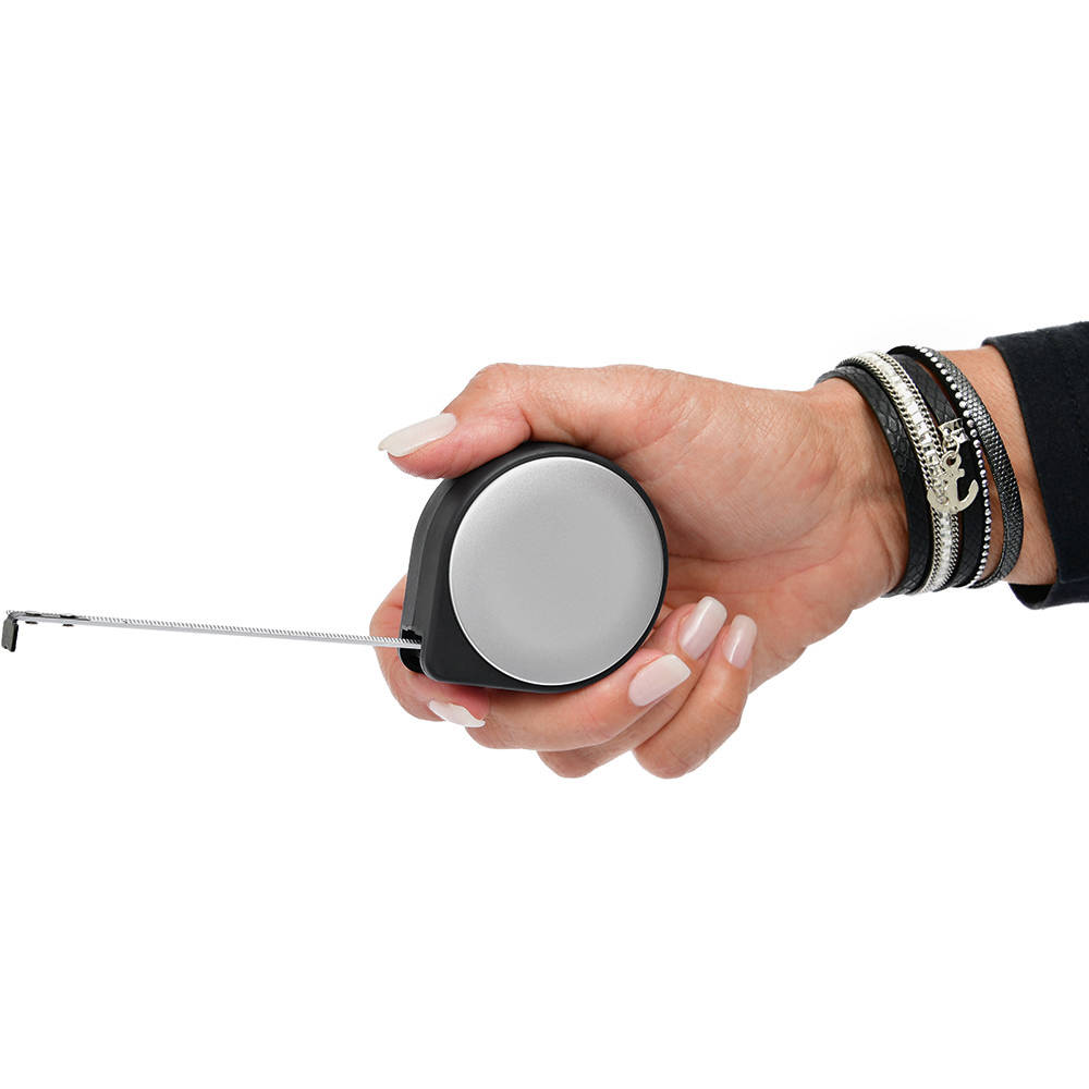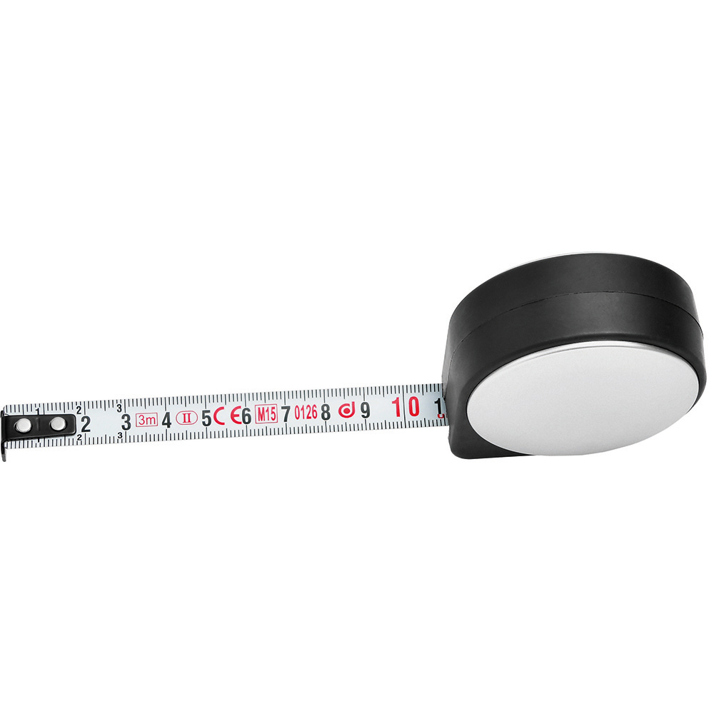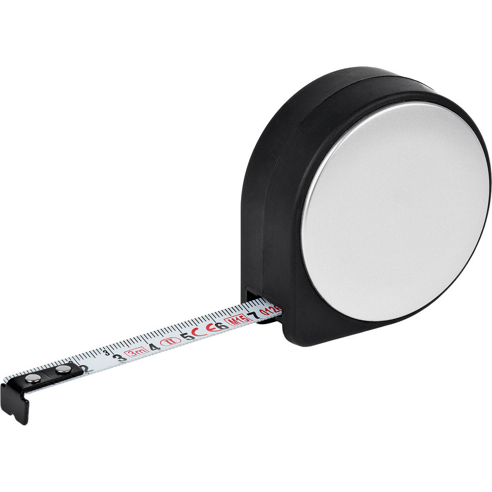 3 Meter Bandmaß mit automatischem Bandfeststellmechnismus. Das runde ABS Gehäuse bietet eine große Werbefläche und ist beidseitig zu veredeln. Durch den komfortablen automatischen Bandfeststellmechanismus bleibt das Band in der gewünschten Länge fixiert und wird durch Drücken des Knopfes durch den dynamischen Bandrücklauf wieder eingeholt. Der bewegliche Bandanfangshaken ermöglicht exaktes Messen auf Stoß und Zug. Gehäuse: ABS beschichtet, TPR. Band: 3 m/12,5 mm, lackiert. Knickfestigkeit: 1,20 m. Skalierung: cm, einseitig. Genauigkeitsklasse: EG-Klasse II. Ausstattung: automatischer Bandfeststellmechanismus, dynamischer Bandrücklauf, beweglicher Bandanfangshaken. Verpackung: schwarze Geschenkverpackung.