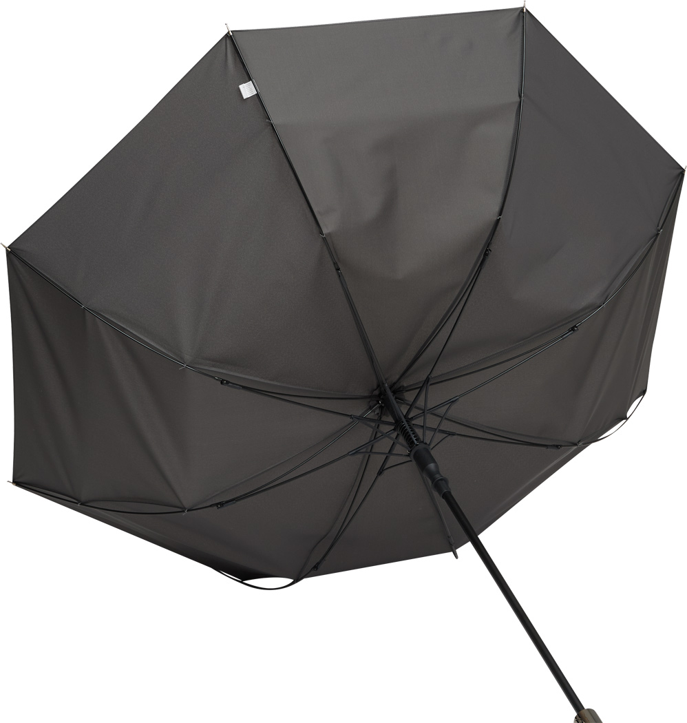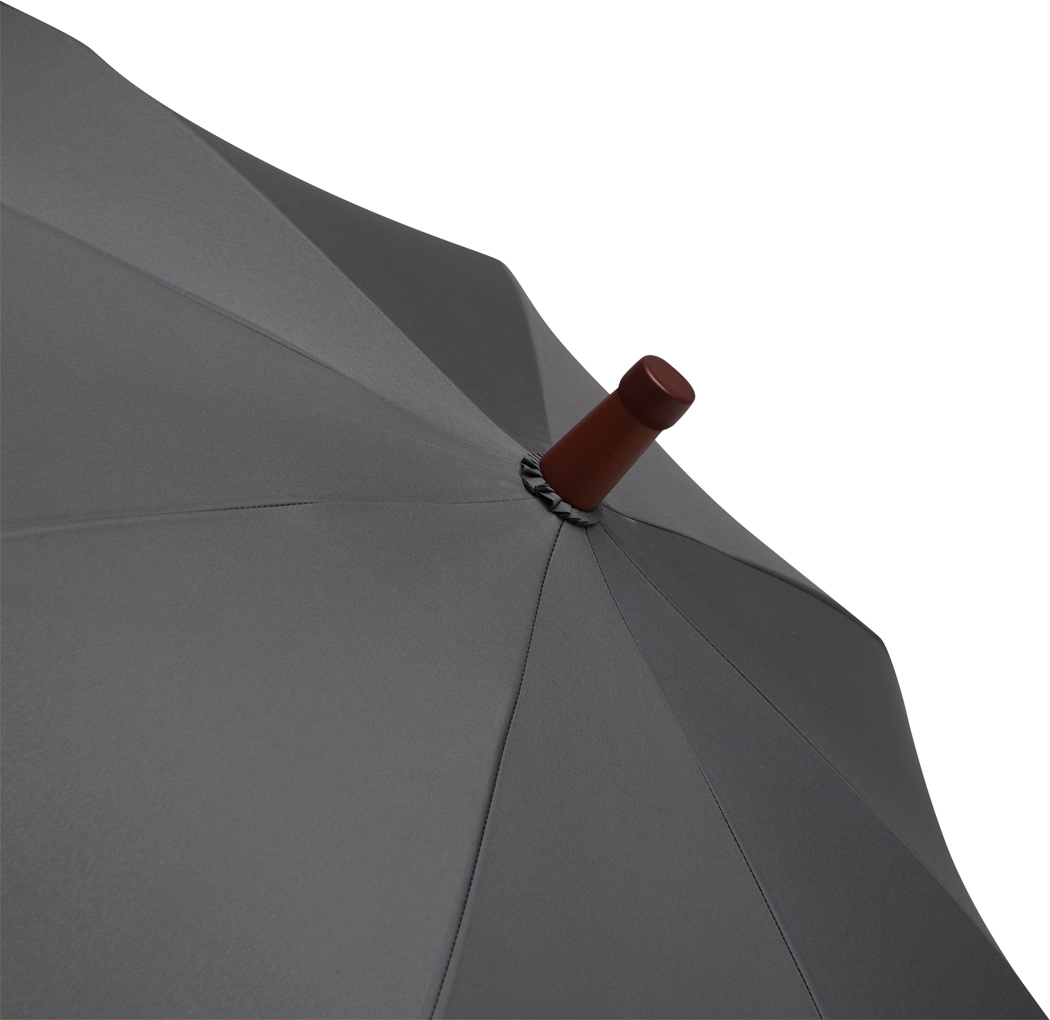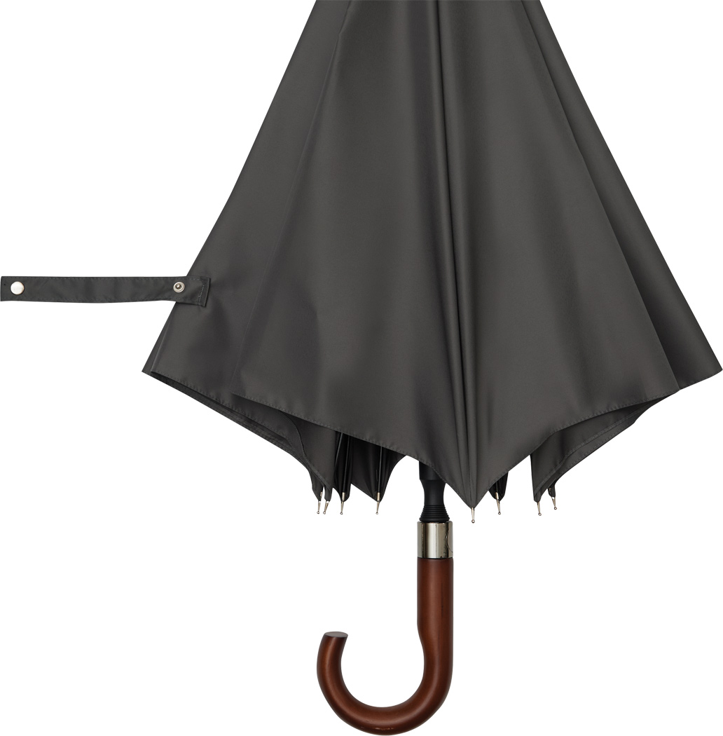 Automatik-Golfschirm EARL: schwarzer Metallstock, Fiberglasspeichen und Metalltips, Holzrundhakengriff und -Spitze, Griff mit integrierter Automatik-Auslösetaste, hochwertige Polyester-Pongee-Bespannung, Schließband mit Druckknopf