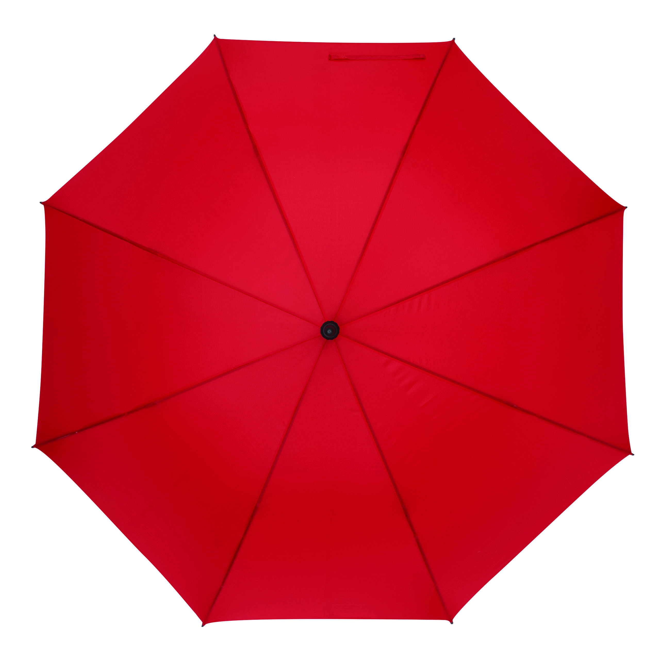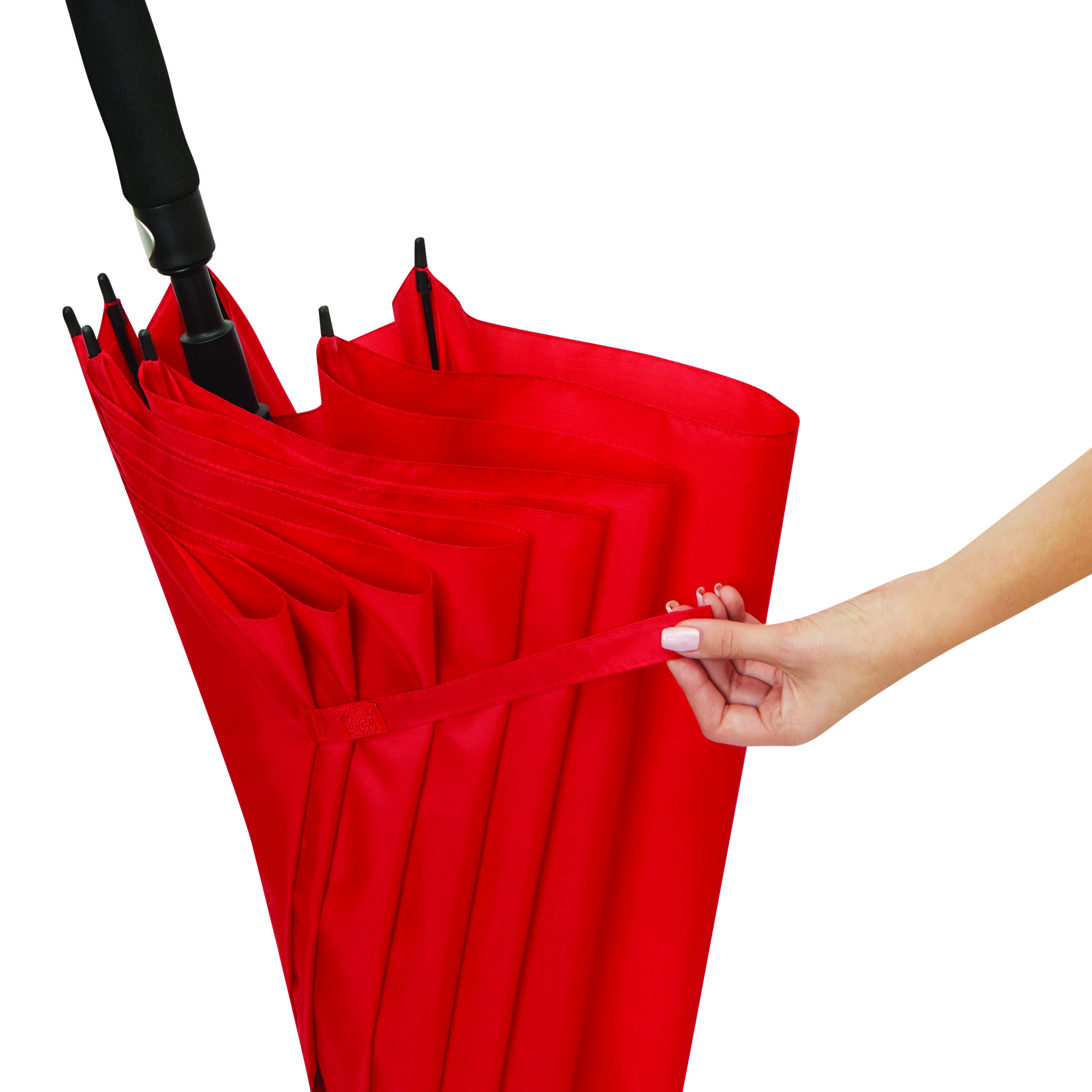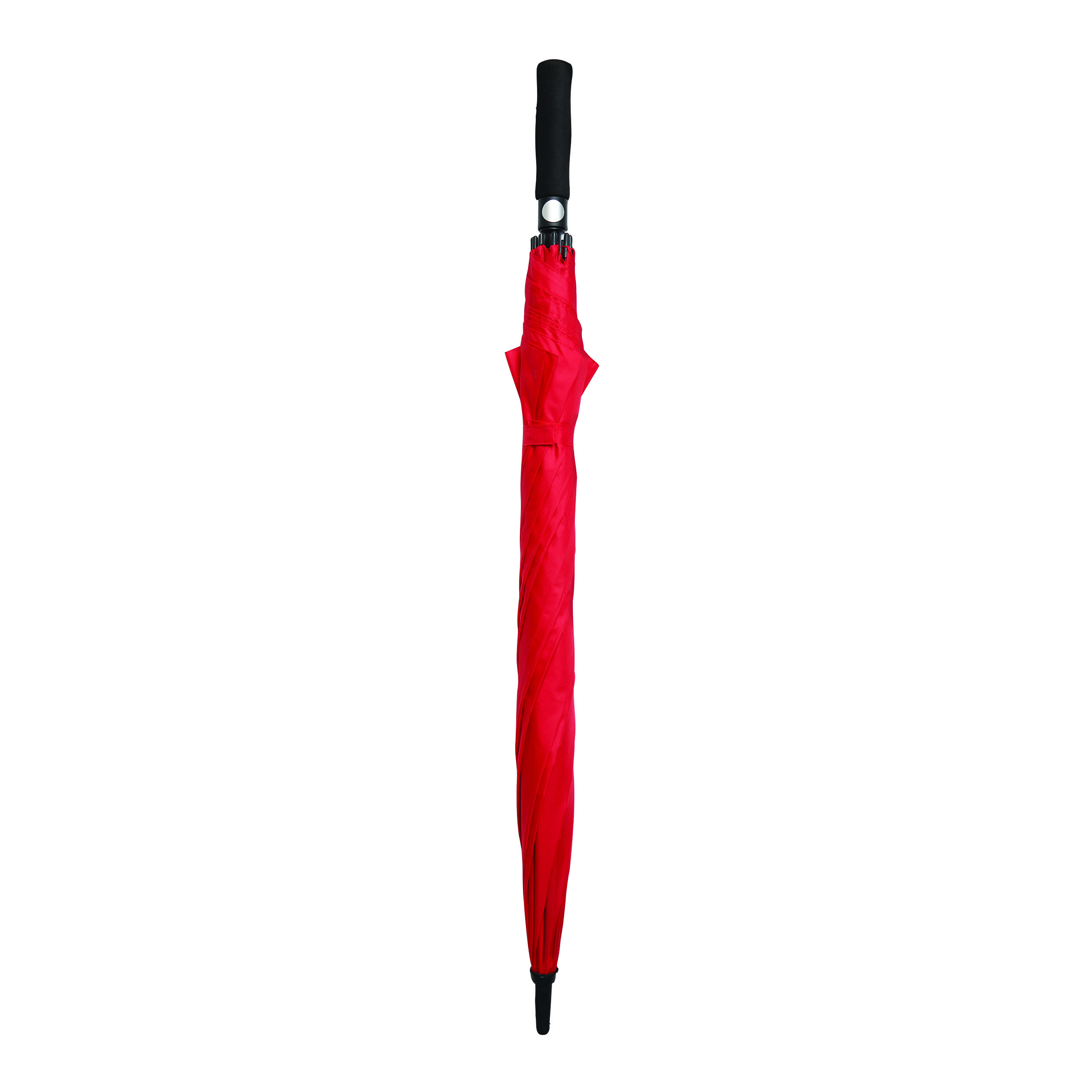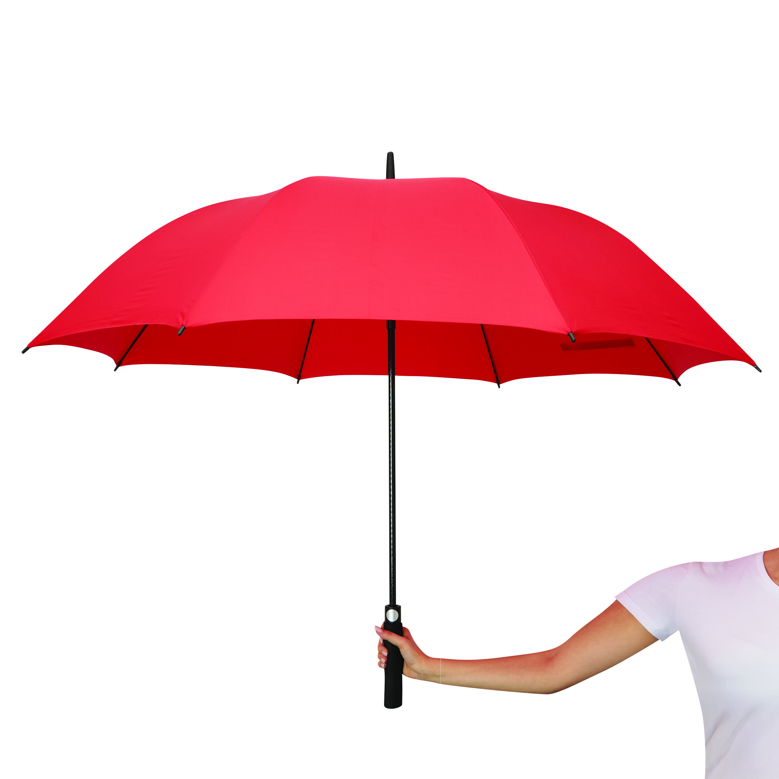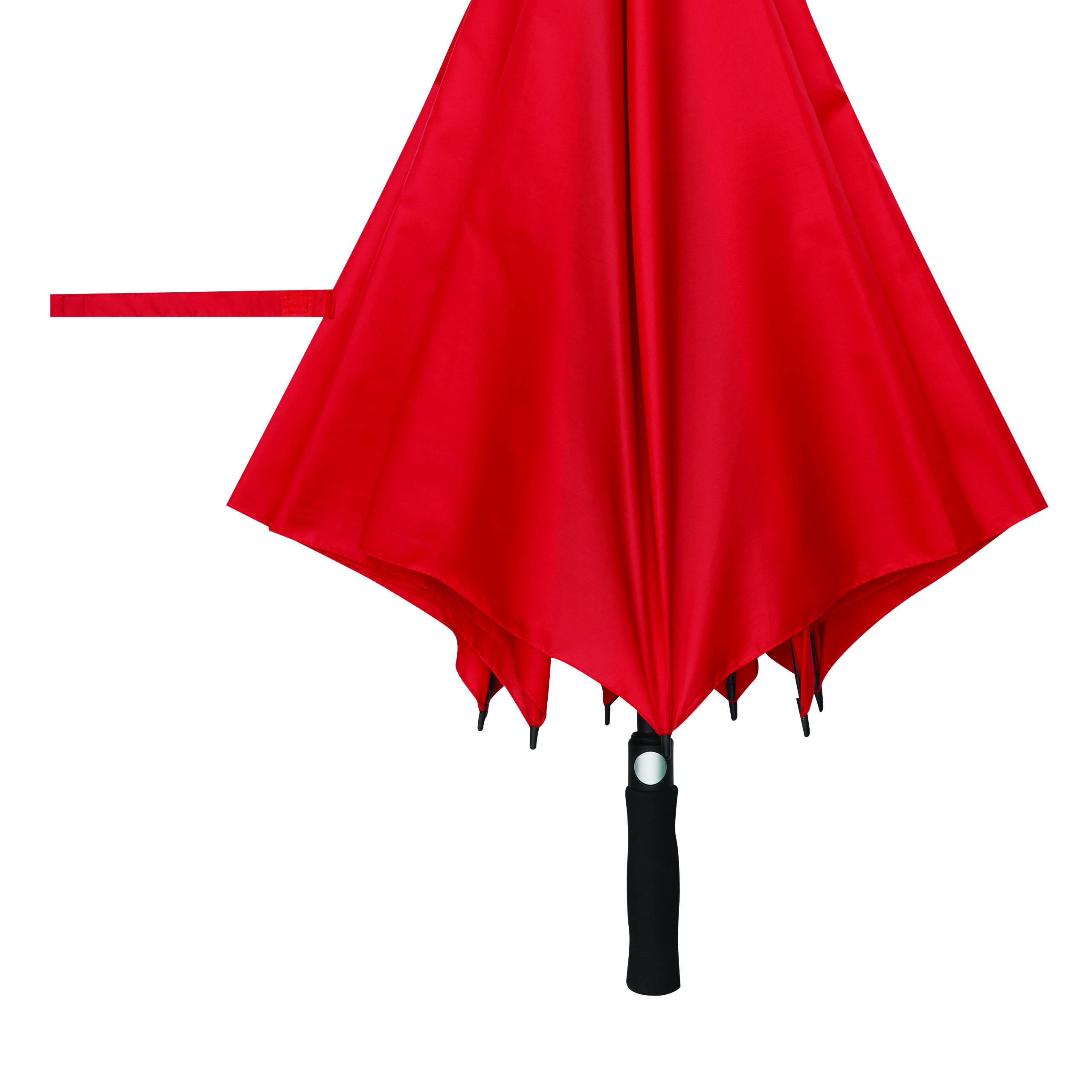 Automatik-Golfschirm ORA: Fiberglasstock, Fiberglasspeichen und Kunststofftips, EVA-Griff mit integrierter Automatik-Auslösetaste, Polyester-Pongee-Bespannung aus recycelten Kunststoffen / RPET, Schließband mit Klettverschluss