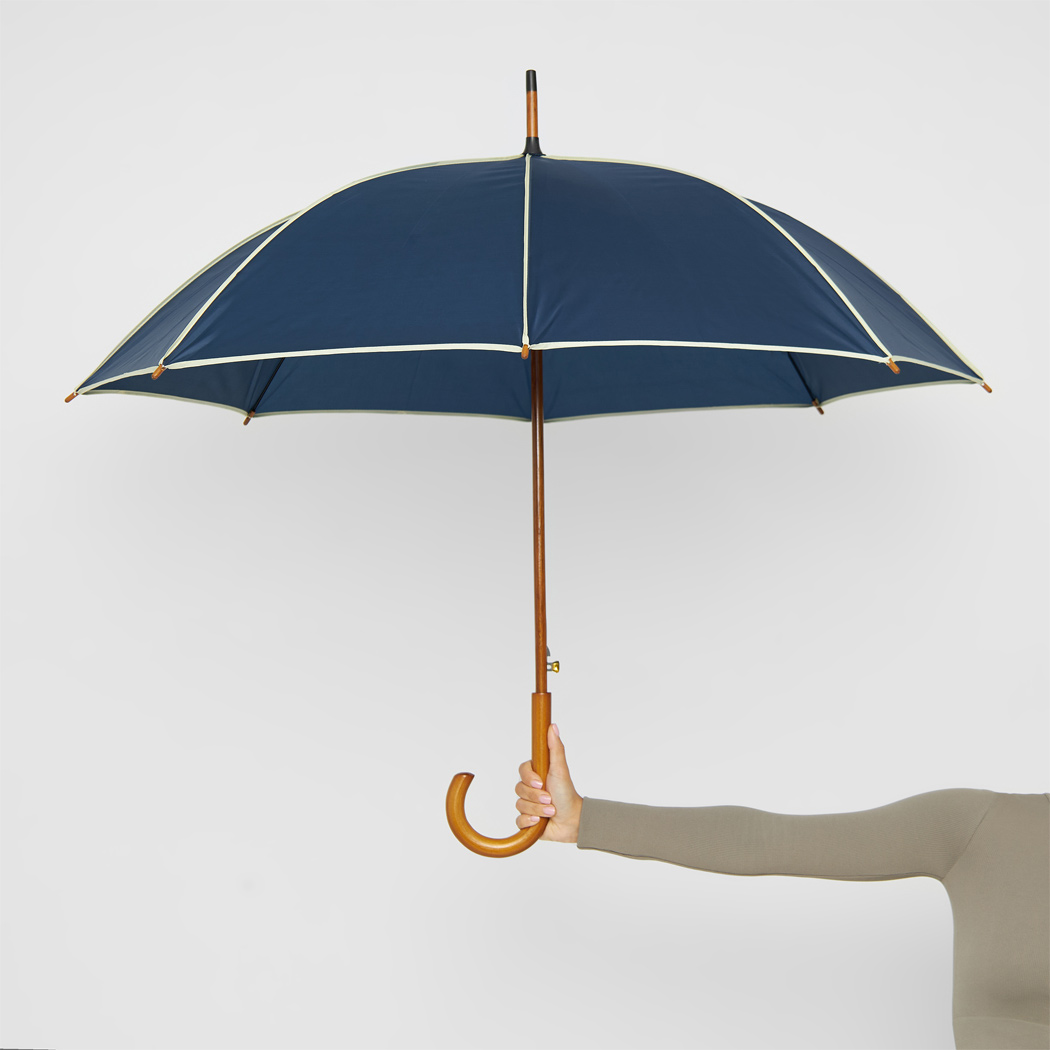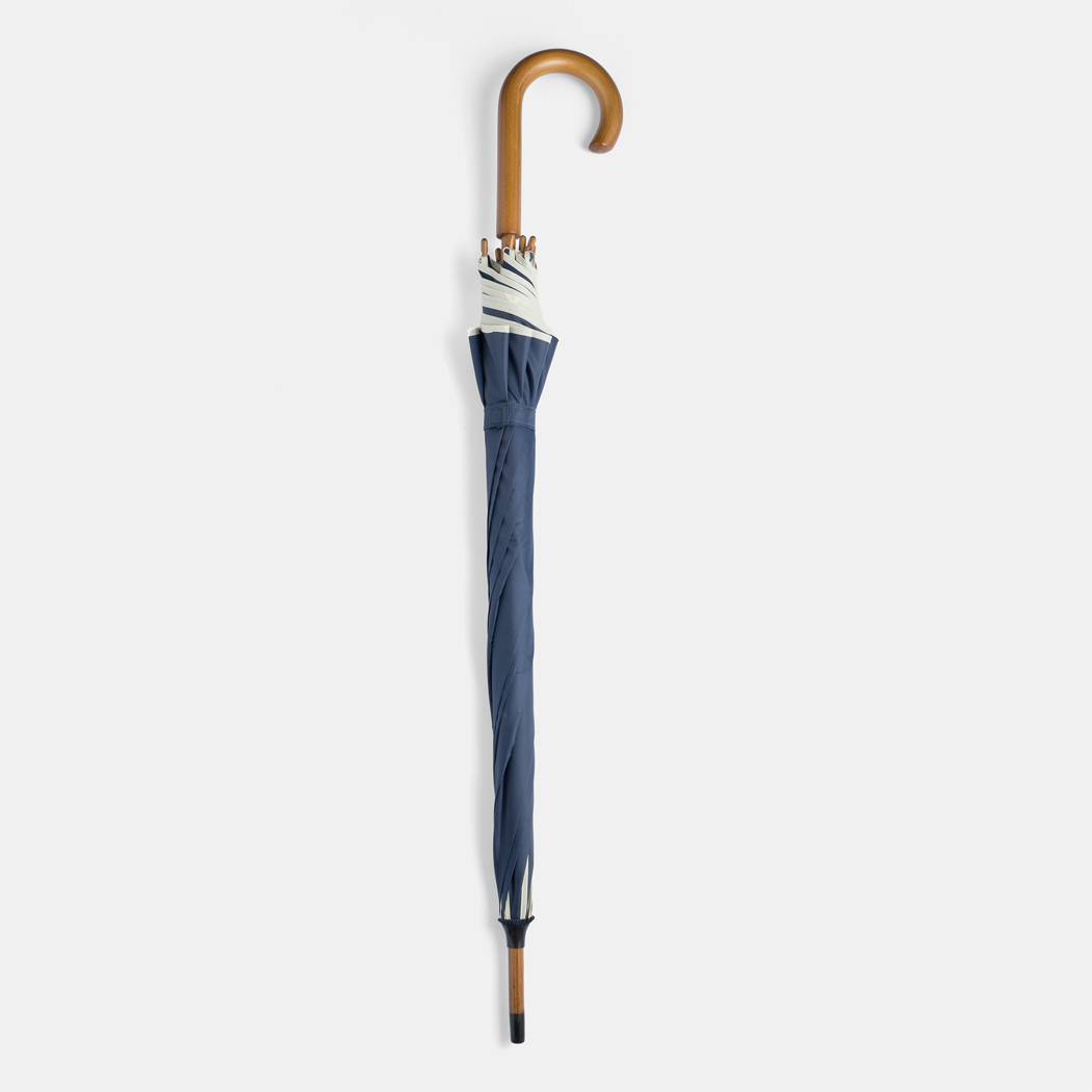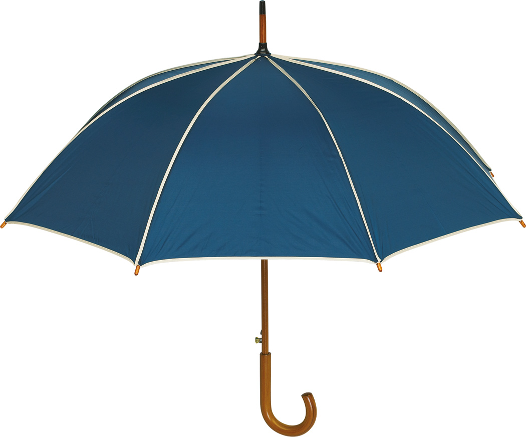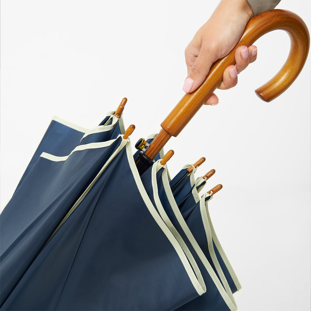 Automatik-Holzstockschirm WALTZ mit farbiger Paspelierung: Metallspeichen, Holztips und -Rundhakengriff, Polyester-Bespannung, Schließband mit Klettverschluss