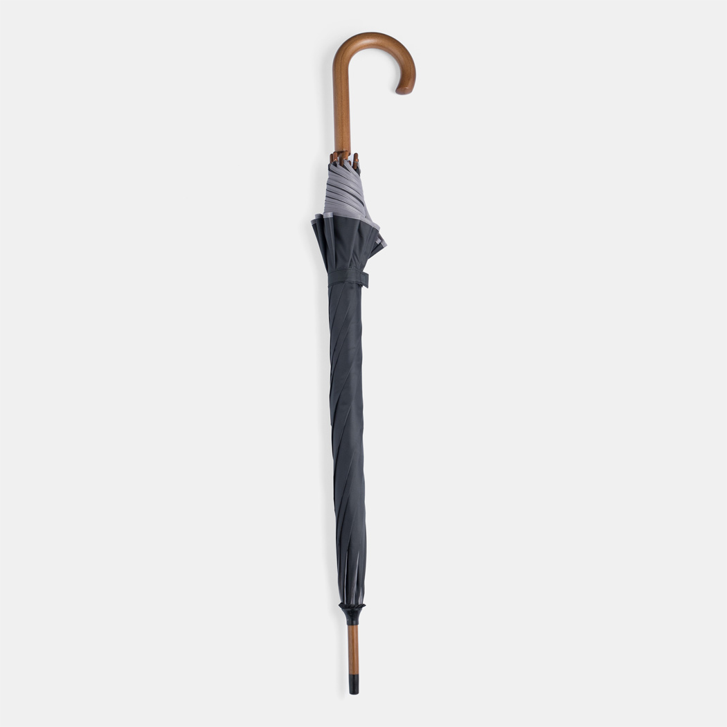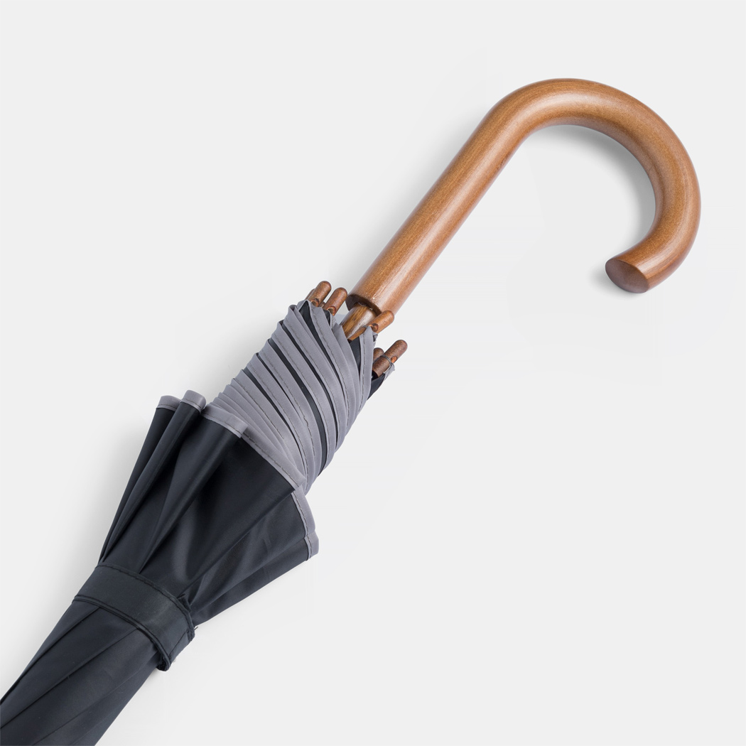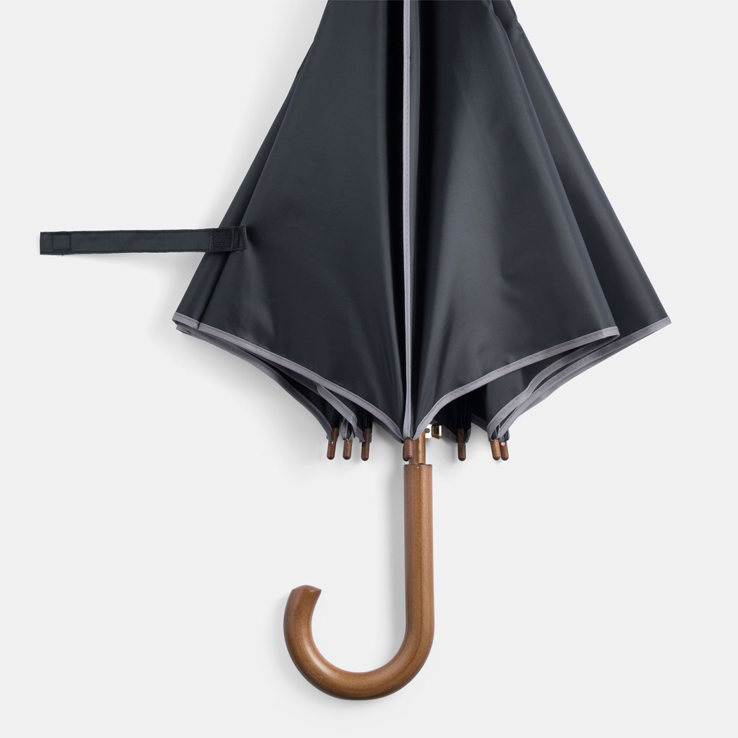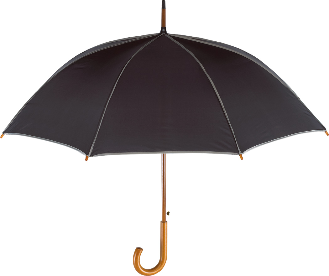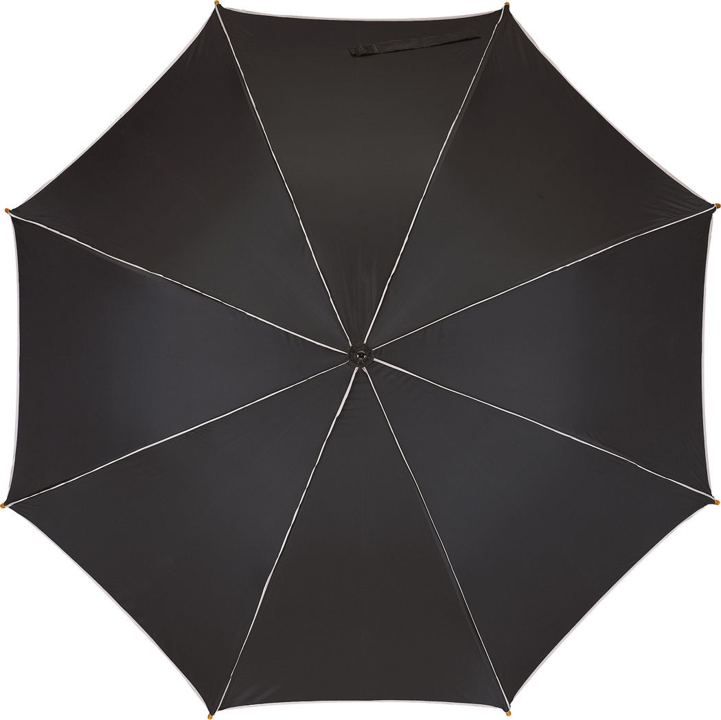 Automatik-Holzstockschirm WALTZ mit farbiger Paspelierung: Metallspeichen, Holztips und -Rundhakengriff, Polyester-Bespannung, Schließband mit Klettverschluss