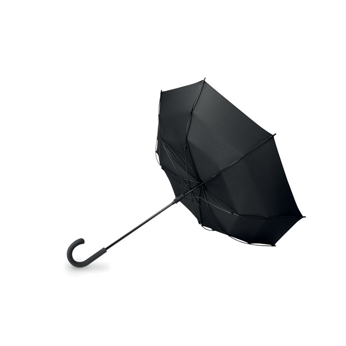 23'' Regenschirm aus 190T Seide. Windbeständig. Stock aus schwarz überzogenem Metall. Schienen aus schwarzem Fiberglas, Spitzen aus schwarzem Kunststoff. Gebogener, schwarz gummierter ABS Griff mit grauem Drücker. Automatische Öffnung, manuelle Schließung.