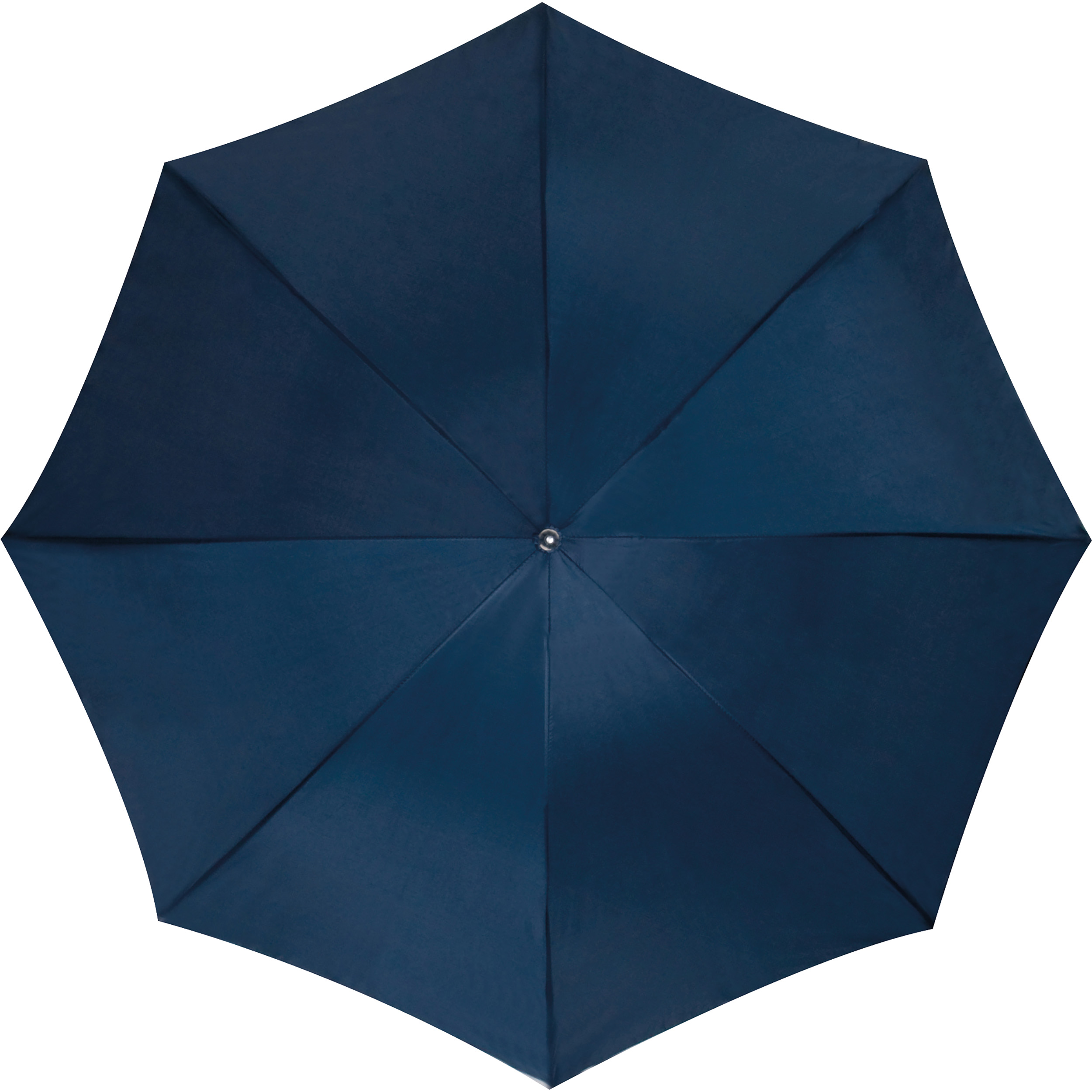Automatik Regenschirm aus Polyester mit Gestänge aus Aluminium, Metallspitzen und gebogenem, gummiertem Griff. Der Automatikknopf ist in den Griff integriert. Ihre Werbung drucken wir auf den unteren Teil eines Segments.