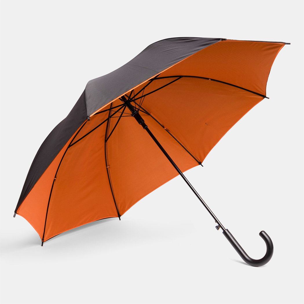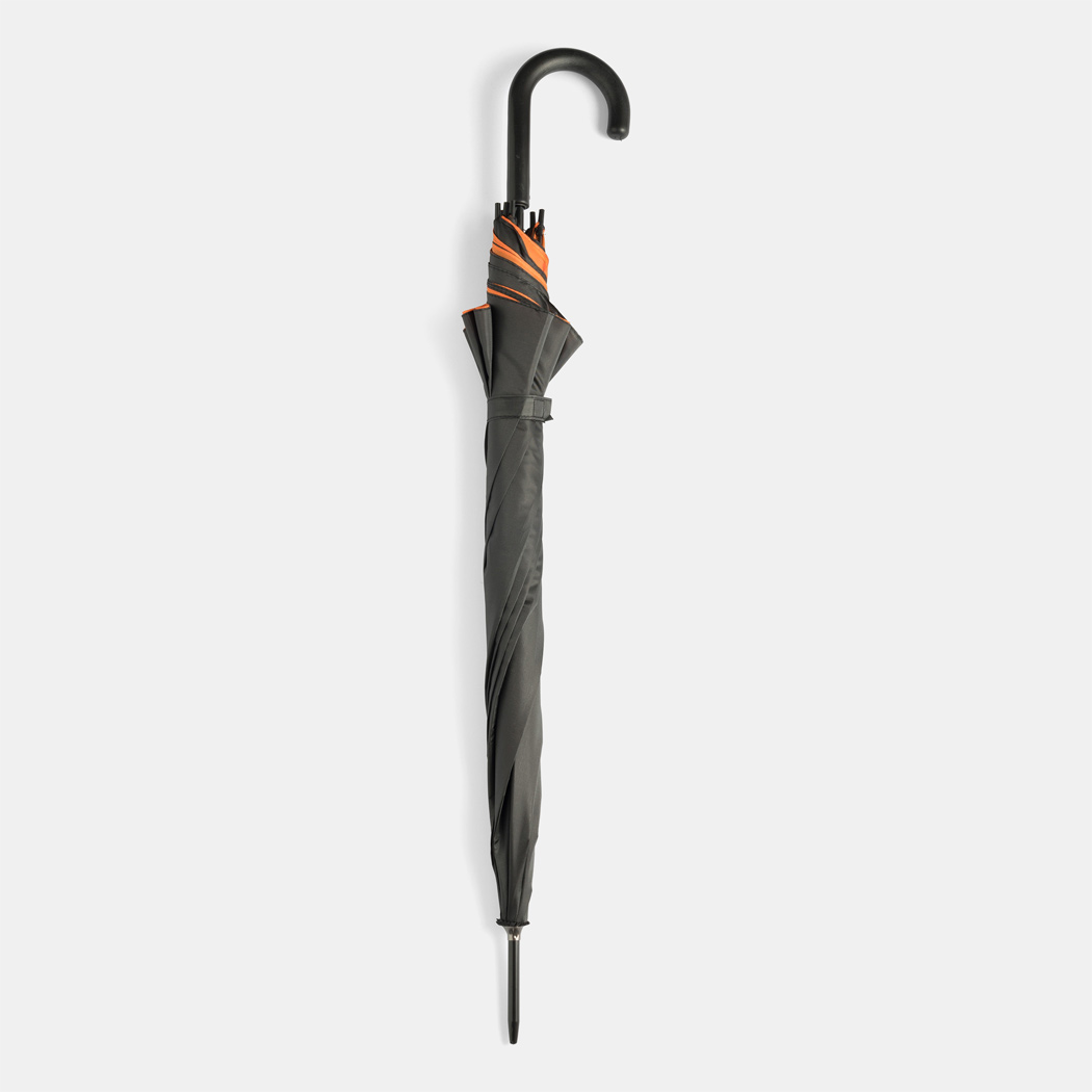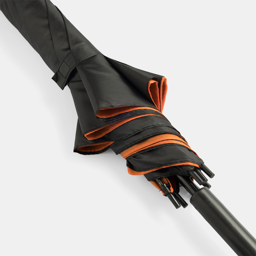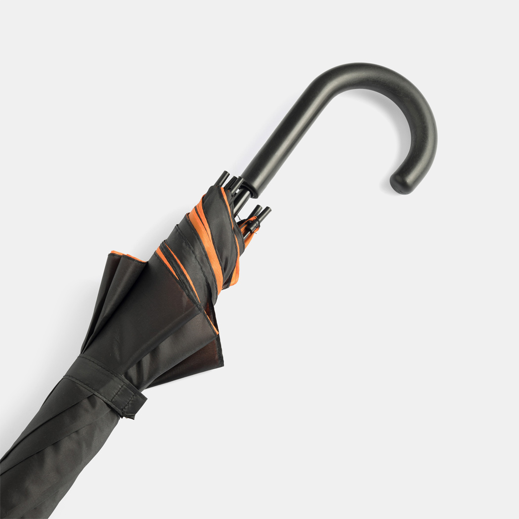 Automatik-Stockschirm DOUBLY: Metallstock und -speichen, Kunststofftips und -Rundhakengriff, doppelt bespanntes und zweifarbiges Schirmdach, Polyester-Bespannung, Schließband mit Klettverschluss