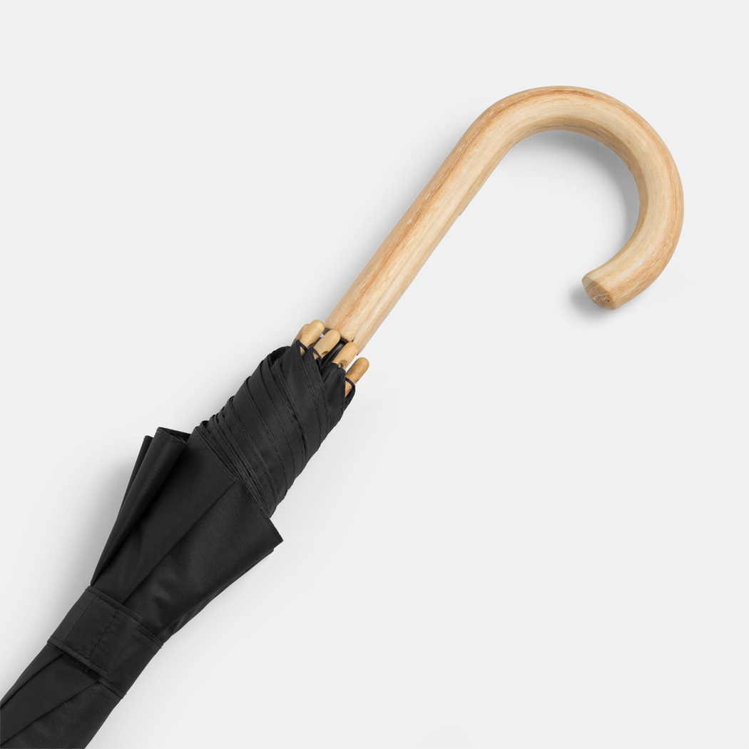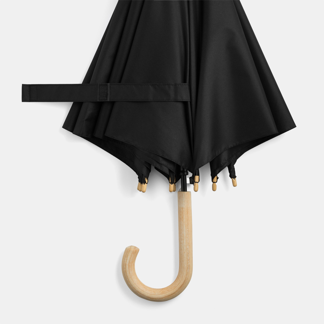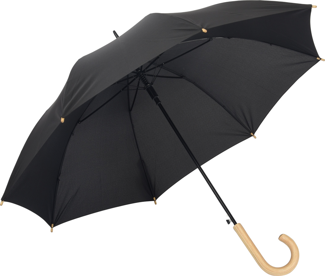 Automatik-Stockschirm LIPSI: Metallstock, Fiberglasspeichen, Holztips und -Rundhakengriff, Polyester-Pongee-Bespannung aus recycelten Kunststoffen / RPET, Schließband mit Klettverschluss