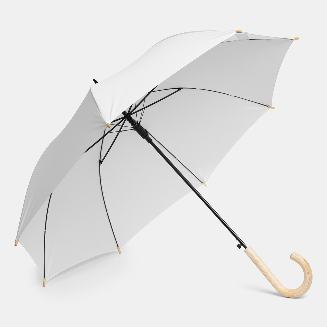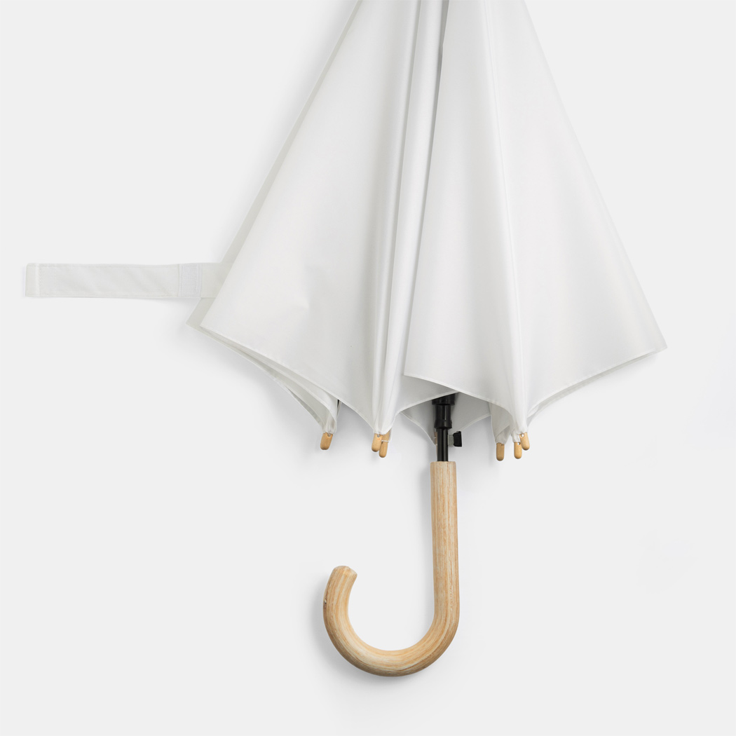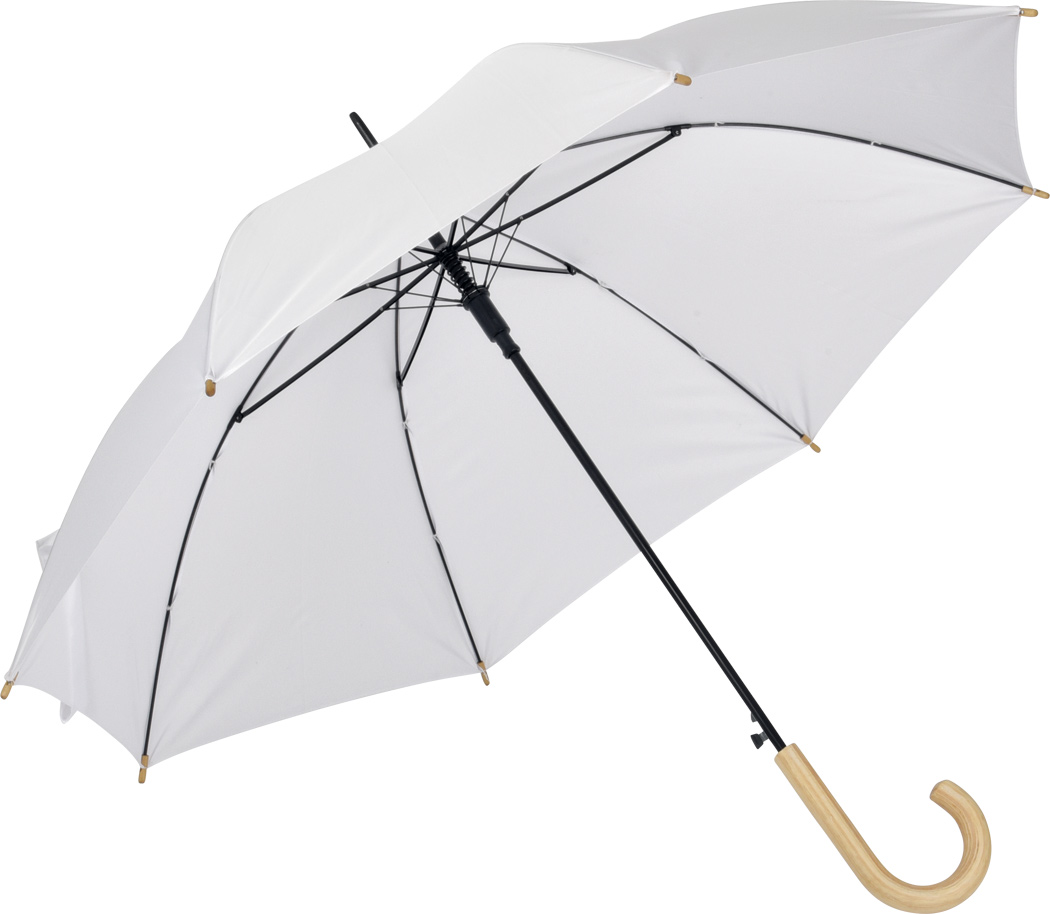 Automatik-Stockschirm LIPSI: Metallstock, Fiberglasspeichen, Holztips und -Rundhakengriff, Polyester-Pongee-Bespannung aus recycelten Kunststoffen / RPET, Schließband mit Klettverschluss