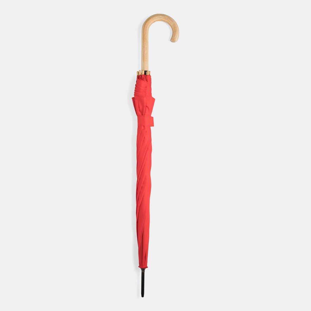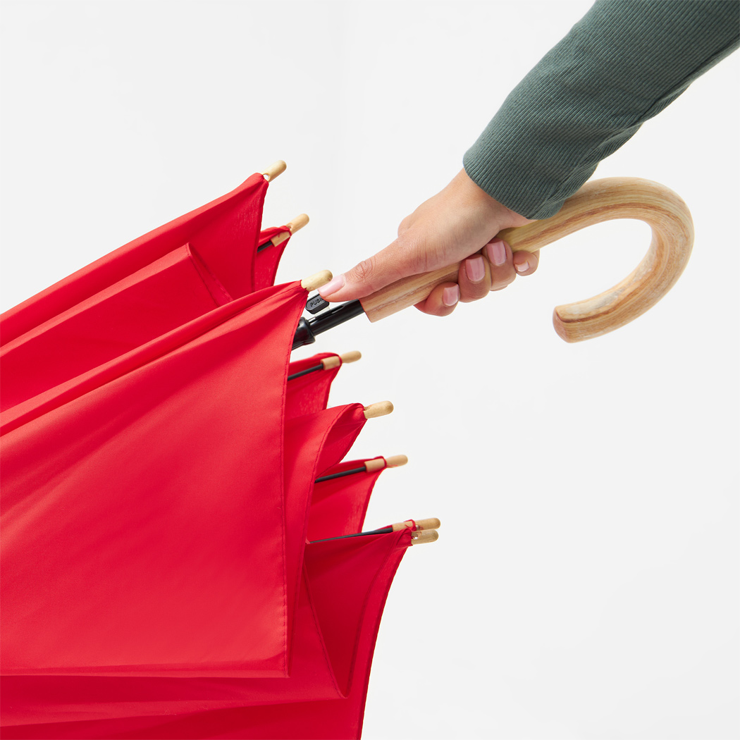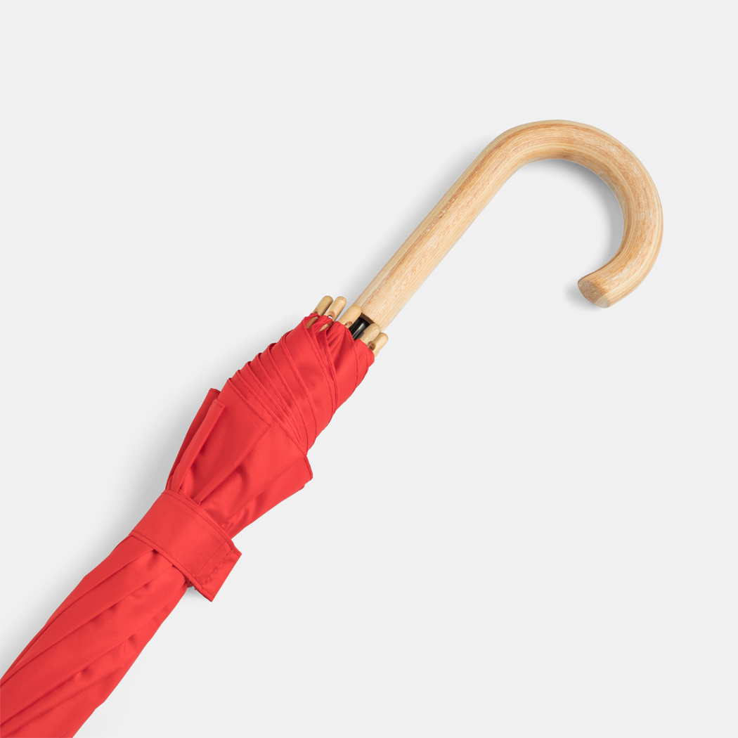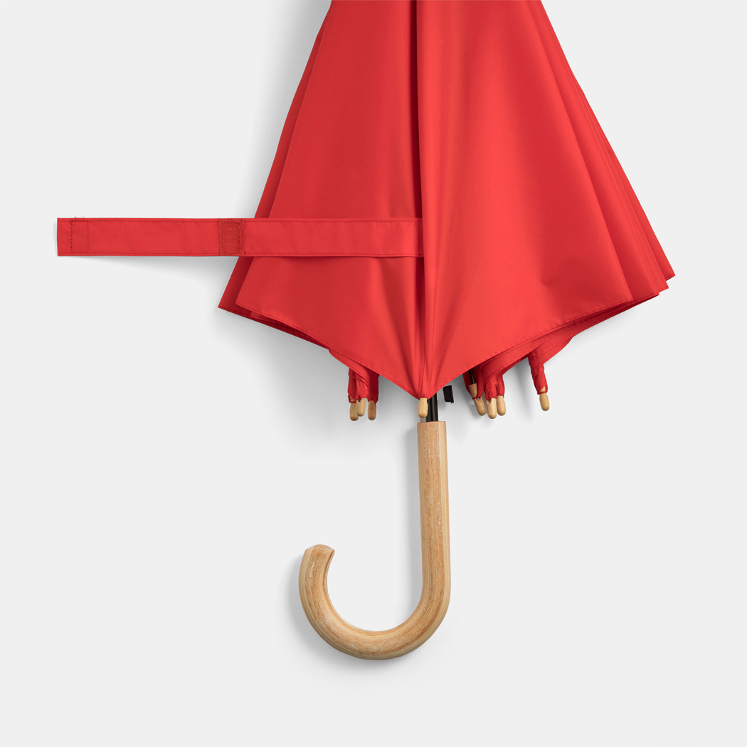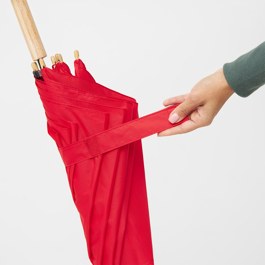 Automatik-Stockschirm LIPSI: Metallstock, Fiberglasspeichen, Holztips und -Rundhakengriff, Polyester-Pongee-Bespannung aus recycelten Kunststoffen / RPET, Schließband mit Klettverschluss
