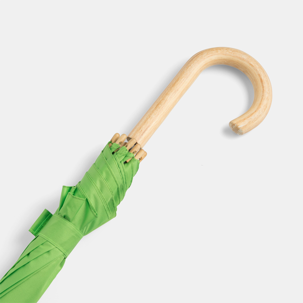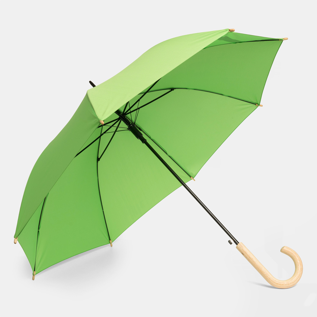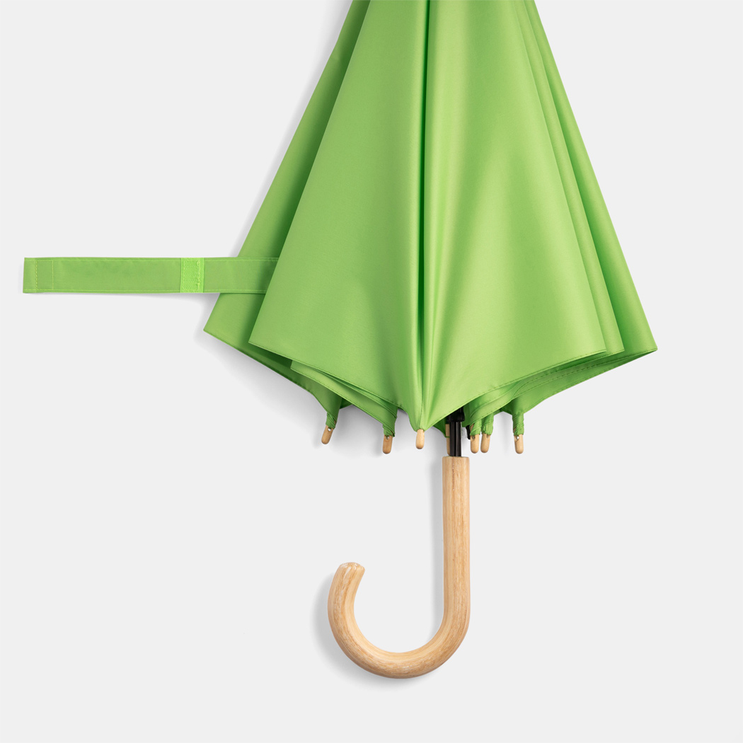 Automatik-Stockschirm LIPSI: Metallstock, Fiberglasspeichen, Holztips und -Rundhakengriff, Polyester-Pongee-Bespannung aus recycelten Kunststoffen / RPET, Schließband mit Klettverschluss