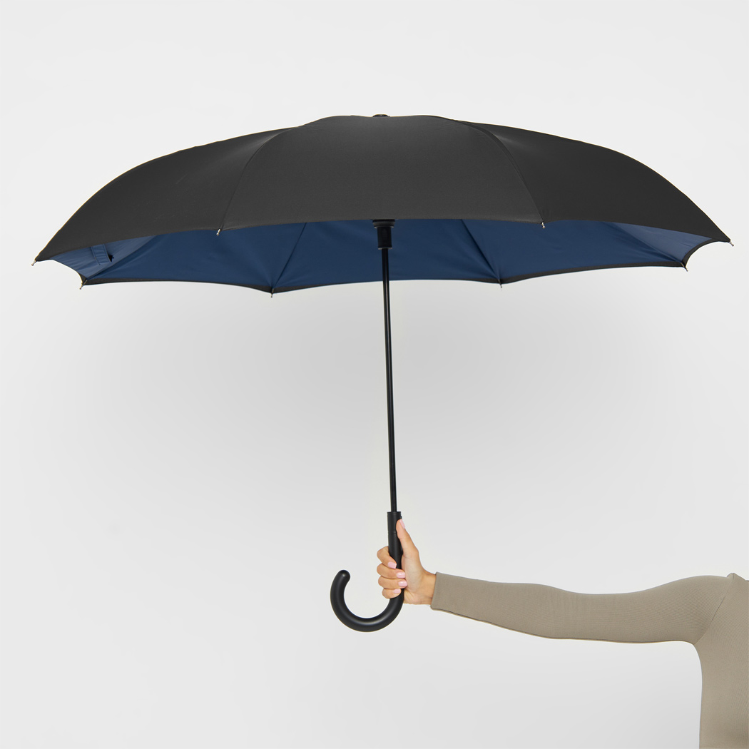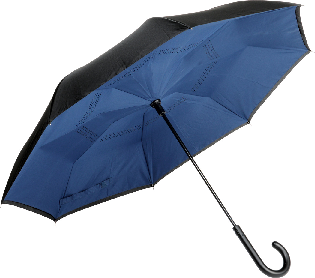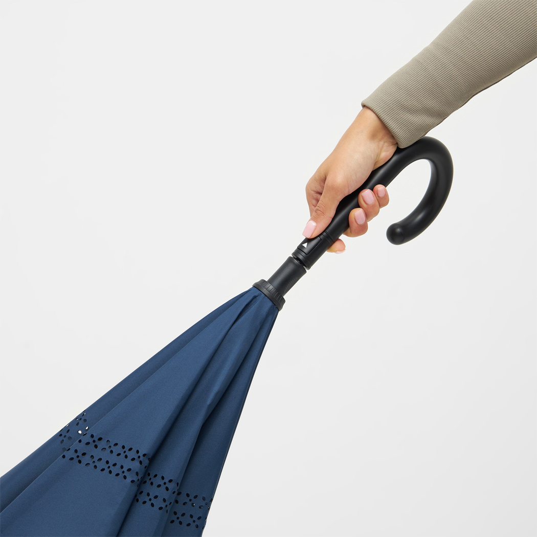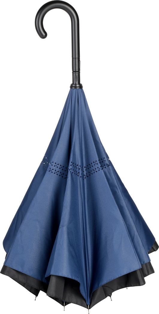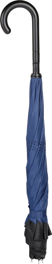 Automatik-Stockschirm OPPOSITE: mit umgekehrtem Öffnungs- und automatischem Schließmechanismus, Doppel-Bezug mit Ventilationsmuster zur Vermeidung von Luftstau, flexibles Gestänge durch Fiberglasspeichen, Metallstock, mit Metalltips, Kunststoffrundhakengriff, Polyester-Pongee-Bespannung, Schließband mit Klettverschluss