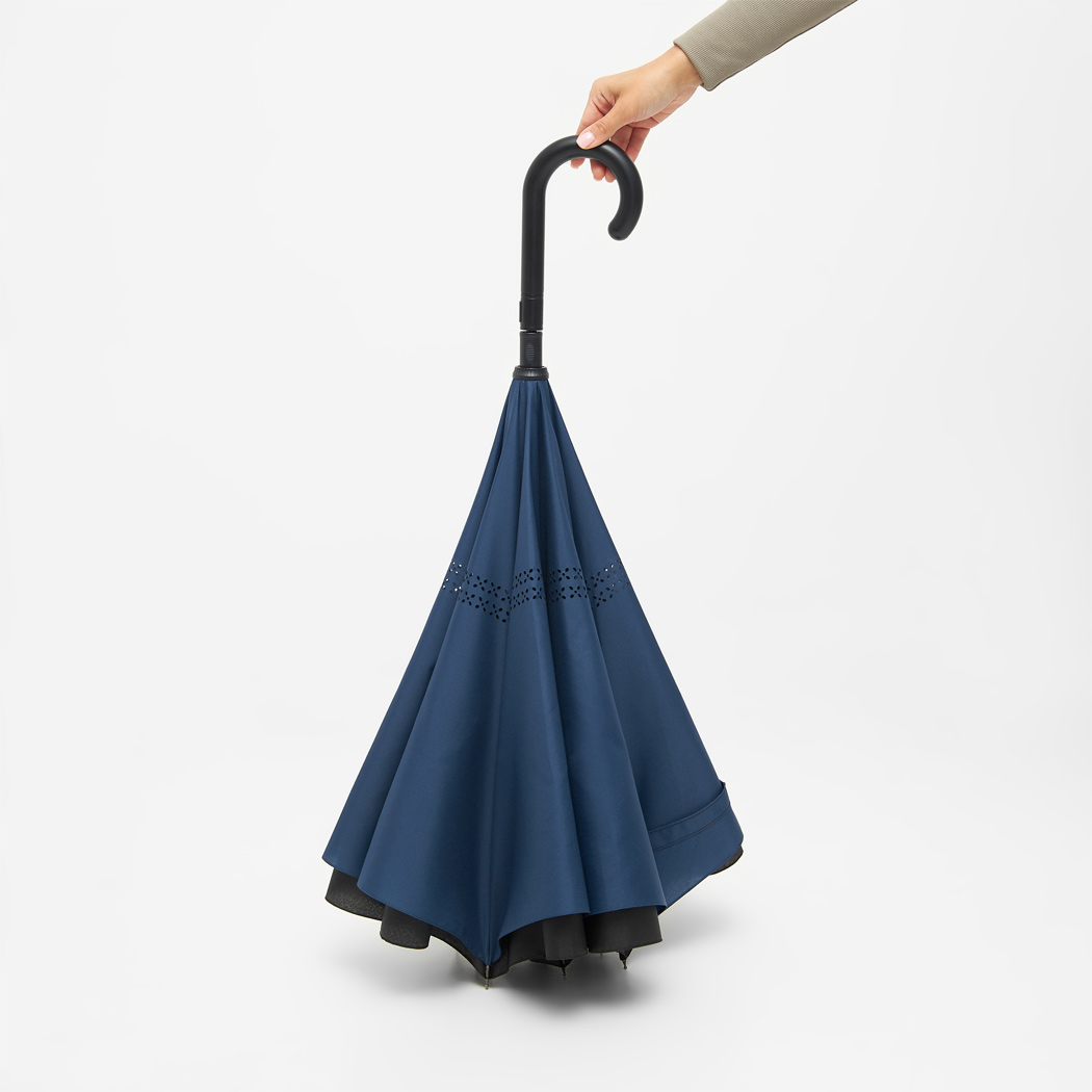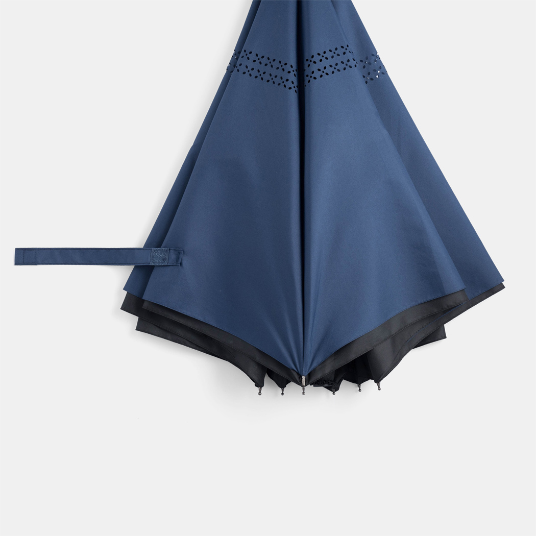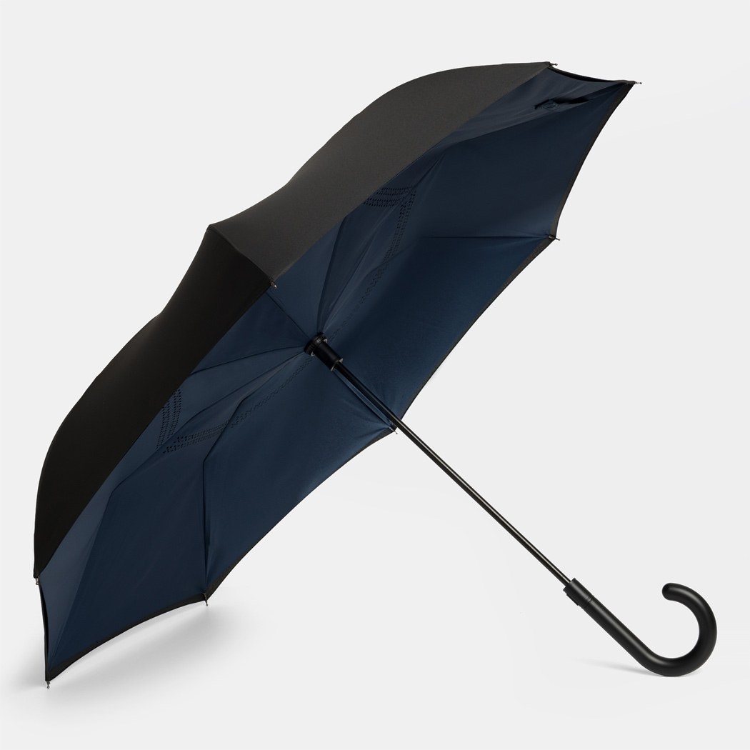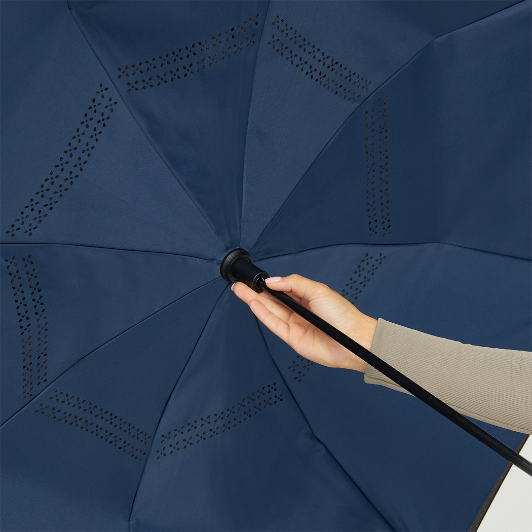 Automatik-Stockschirm OPPOSITE: mit umgekehrtem Öffnungs- und automatischem Schließmechanismus, Doppel-Bezug mit Ventilationsmuster zur Vermeidung von Luftstau, flexibles Gestänge durch Fiberglasspeichen, Metallstock, mit Metalltips, Kunststoffrundhakengriff, Polyester-Pongee-Bespannung, Schließband mit Klettverschluss