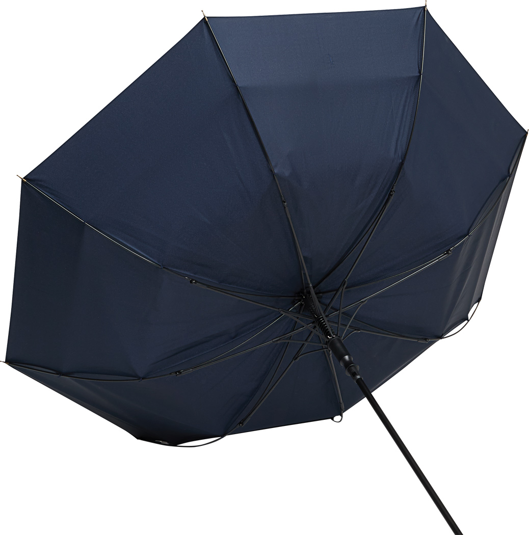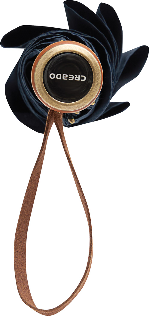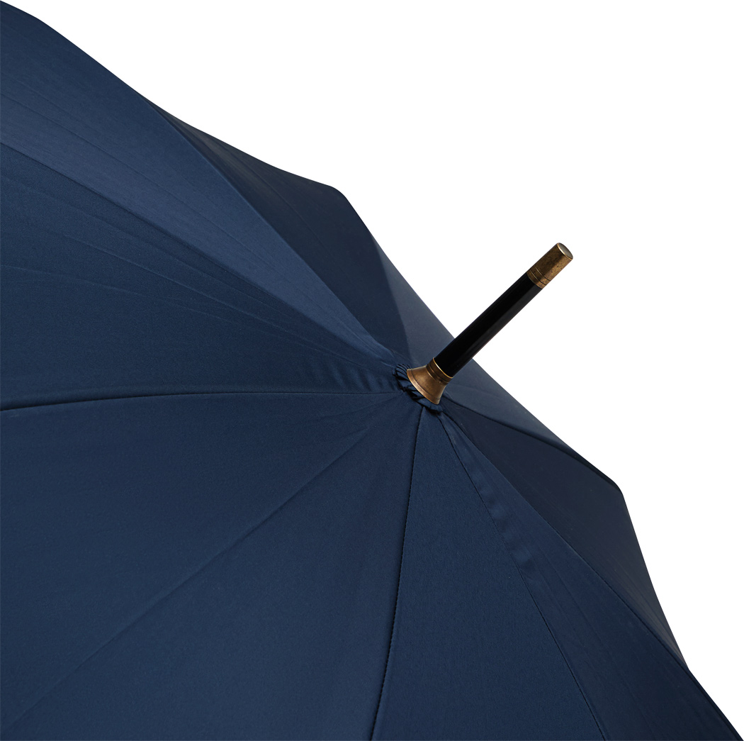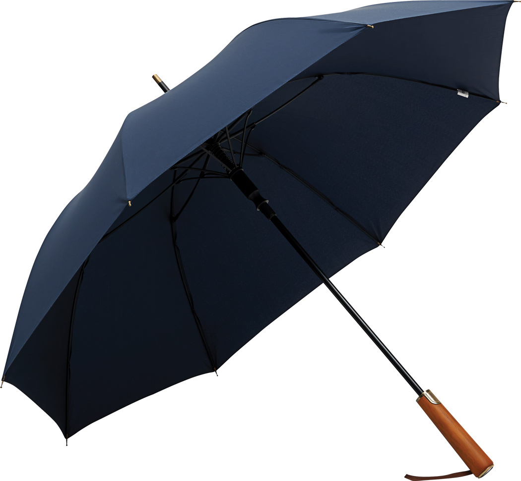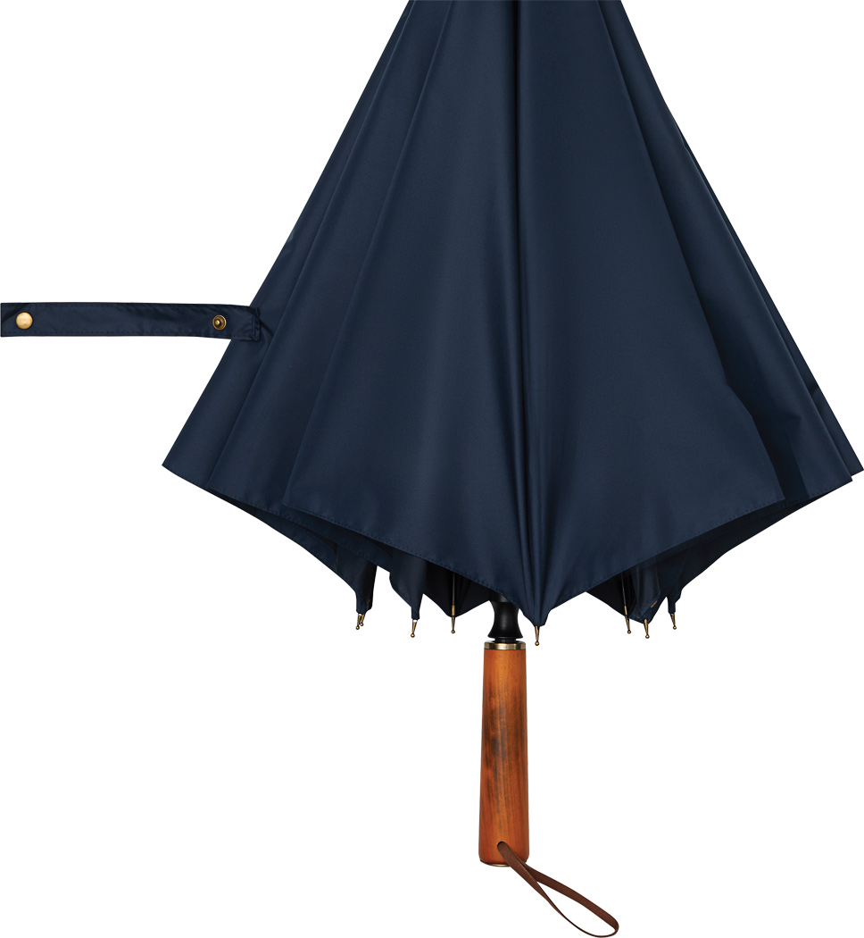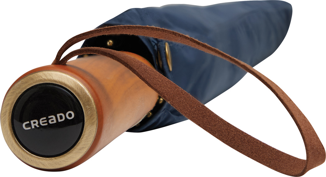 Automatik-Stockschirm POLKA: schwarzer Metallstock, Fiberglasspeichen und Metalltips, gerader Holzgriff mit messingfarbener Automatik-Auslösetaste, Griff mit "CREADO"-Doming, hochwertige Polyester-Pongee-Bespannung und -Hülle, Schließband mit Druckknopf