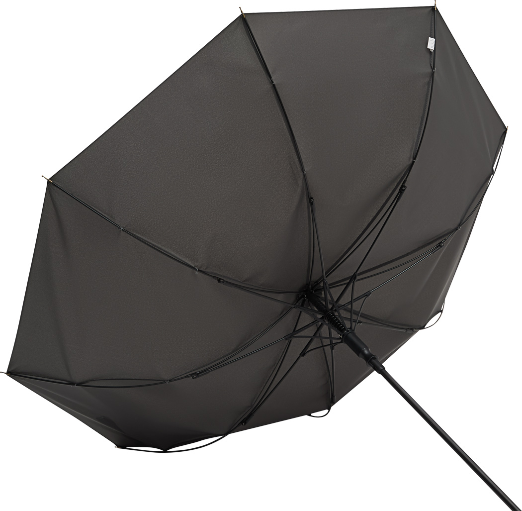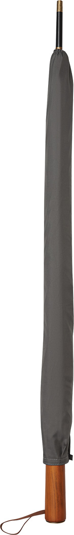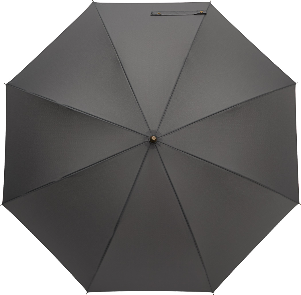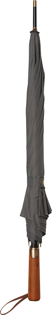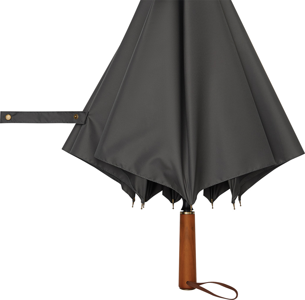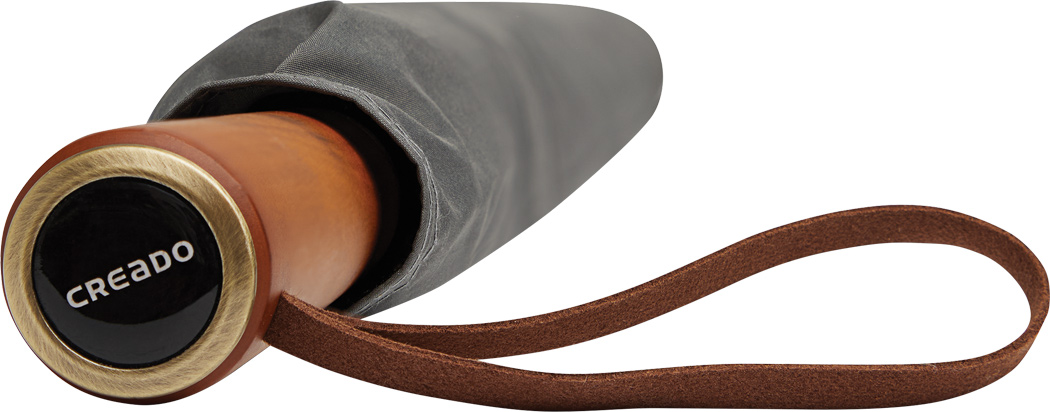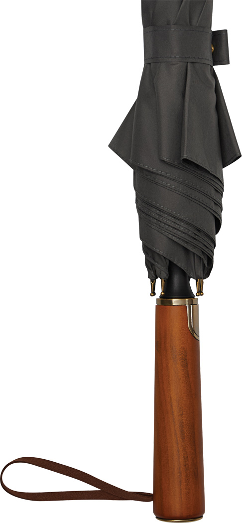 Automatik-Stockschirm POLKA: schwarzer Metallstock, Fiberglasspeichen und Metalltips, gerader Holzgriff mit messingfarbener Automatik-Auslösetaste, Griff mit "CREADO"-Doming, hochwertige Polyester-Pongee-Bespannung und -Hülle, Schließband mit Druckknopf