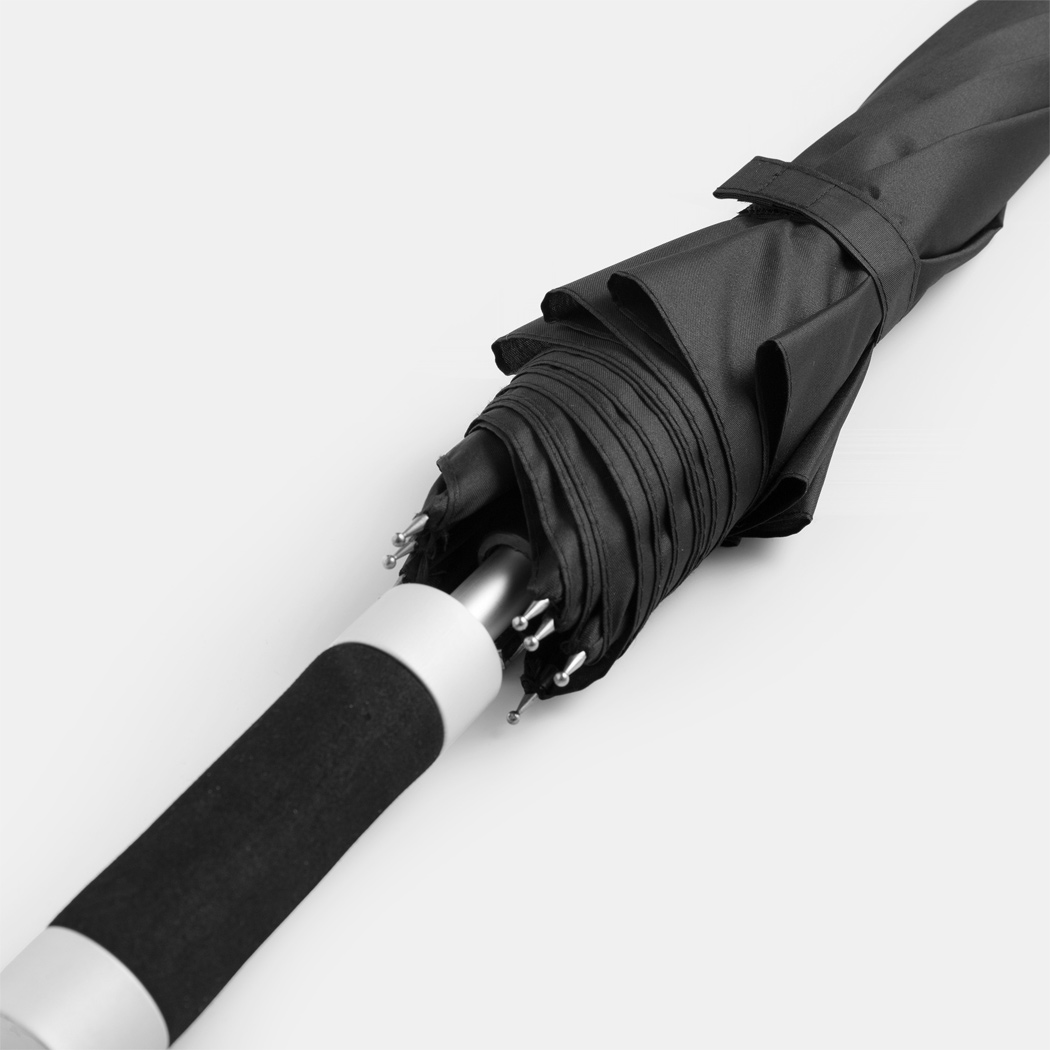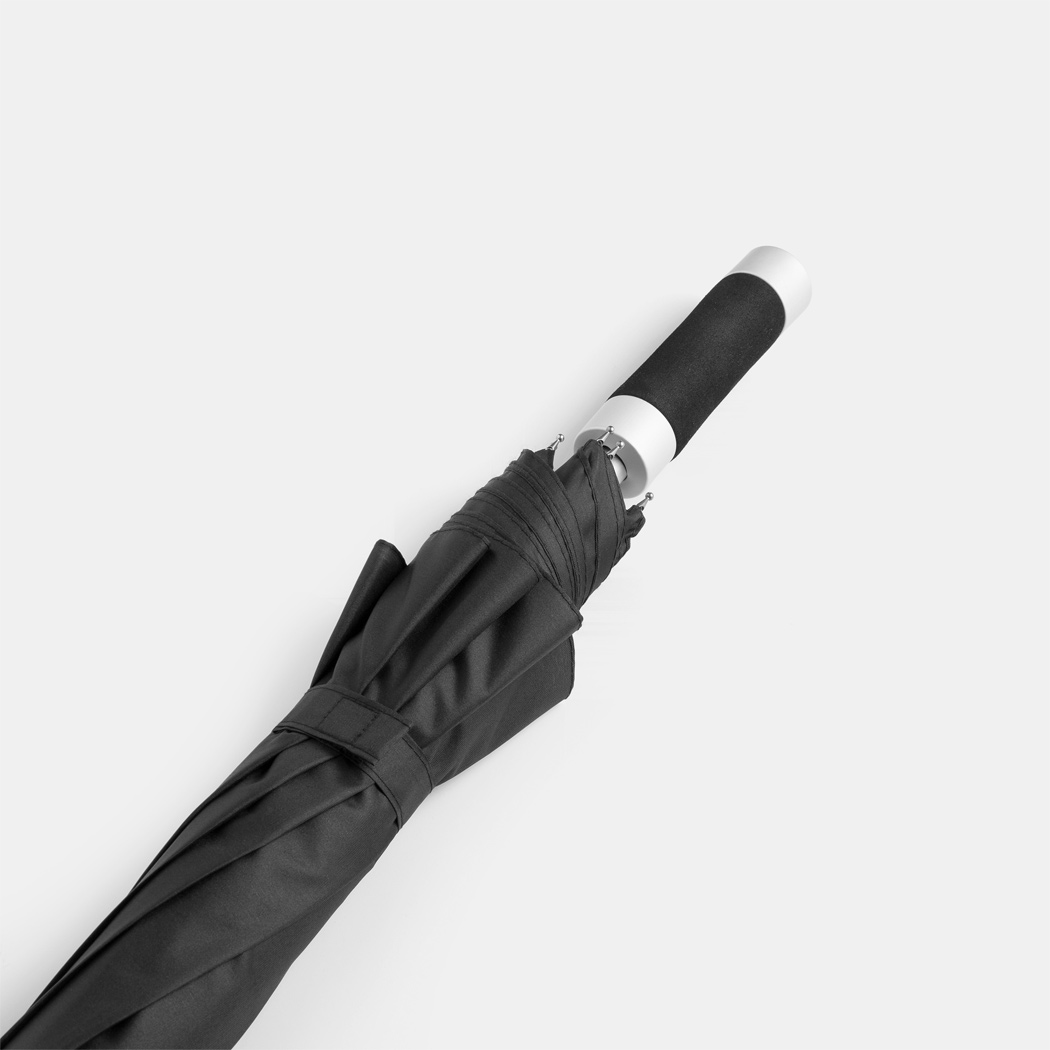 Automatik-Stockschirm RUMBA: Aluminiumstock, Fiberglasspeichen und Metalltips, Aluminium-EVA-Griff, Polyester-Pongee-Bespannung und -Hülle, Schließband mit Klettverschluss