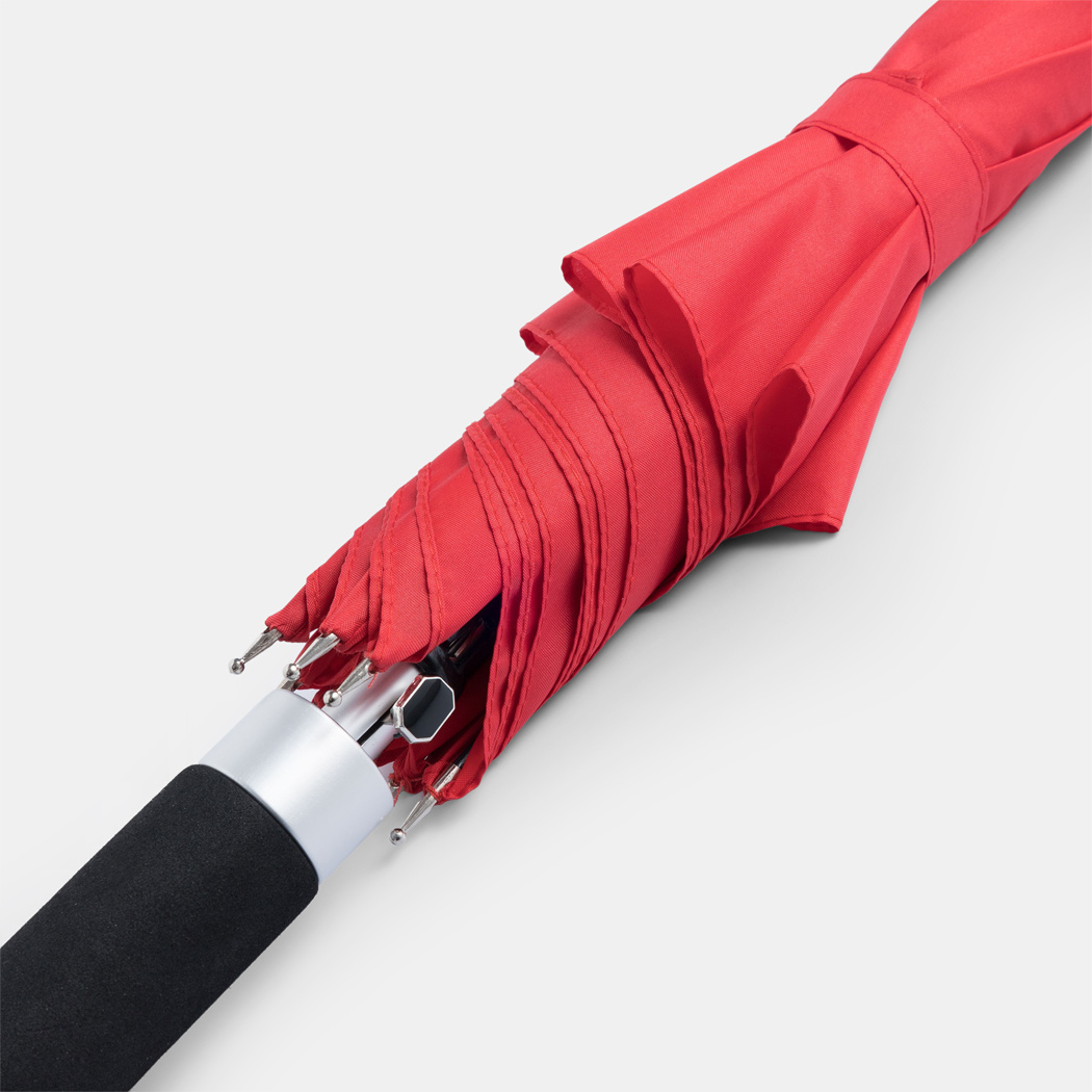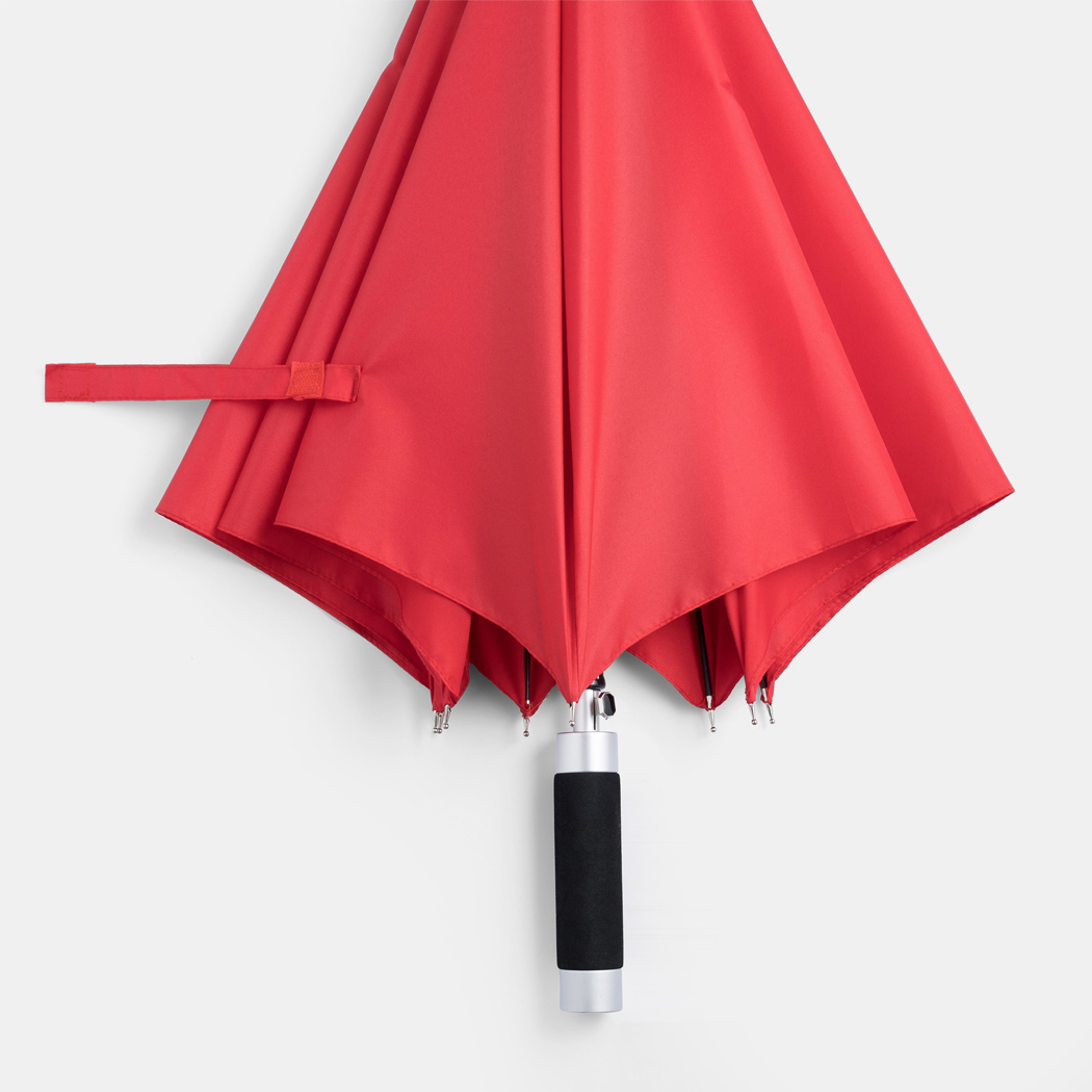 Automatik-Stockschirm RUMBA: Aluminiumstock, Fiberglasspeichen und Metalltips, Aluminium-EVA-Griff, Polyester-Pongee-Bespannung und -Hülle, Schließband mit Klettverschluss