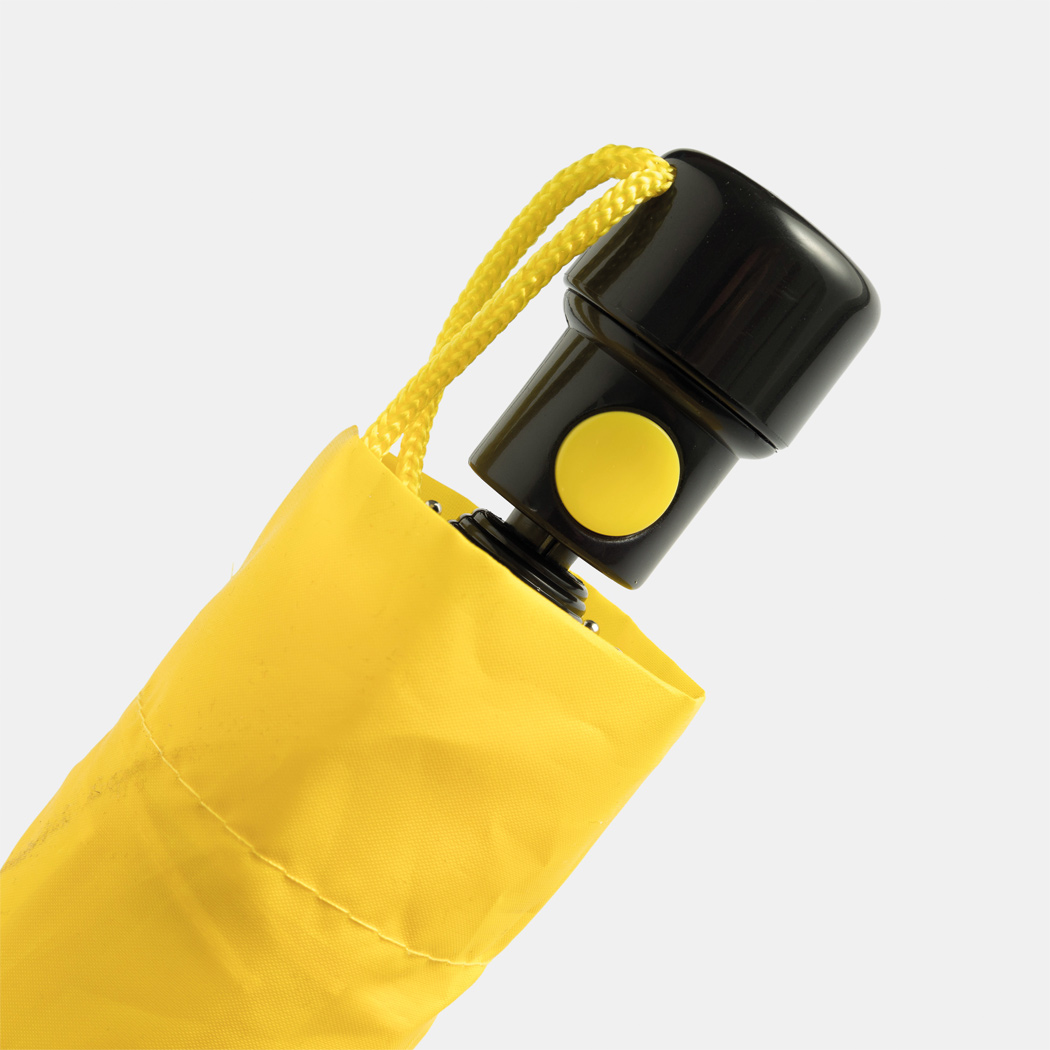 Automatik-Taschenschirm PRIMA, im farblich abgestimmten Futteral: 3-teiliger Metallstock, Metallspeichen und -tips, schwarzer Kunststoffknauf mit farblich abgestimmter Automatik-Auslösetaste und Handschlaufe, Polyester-Bespannung und Schließband mit Klettverschluss