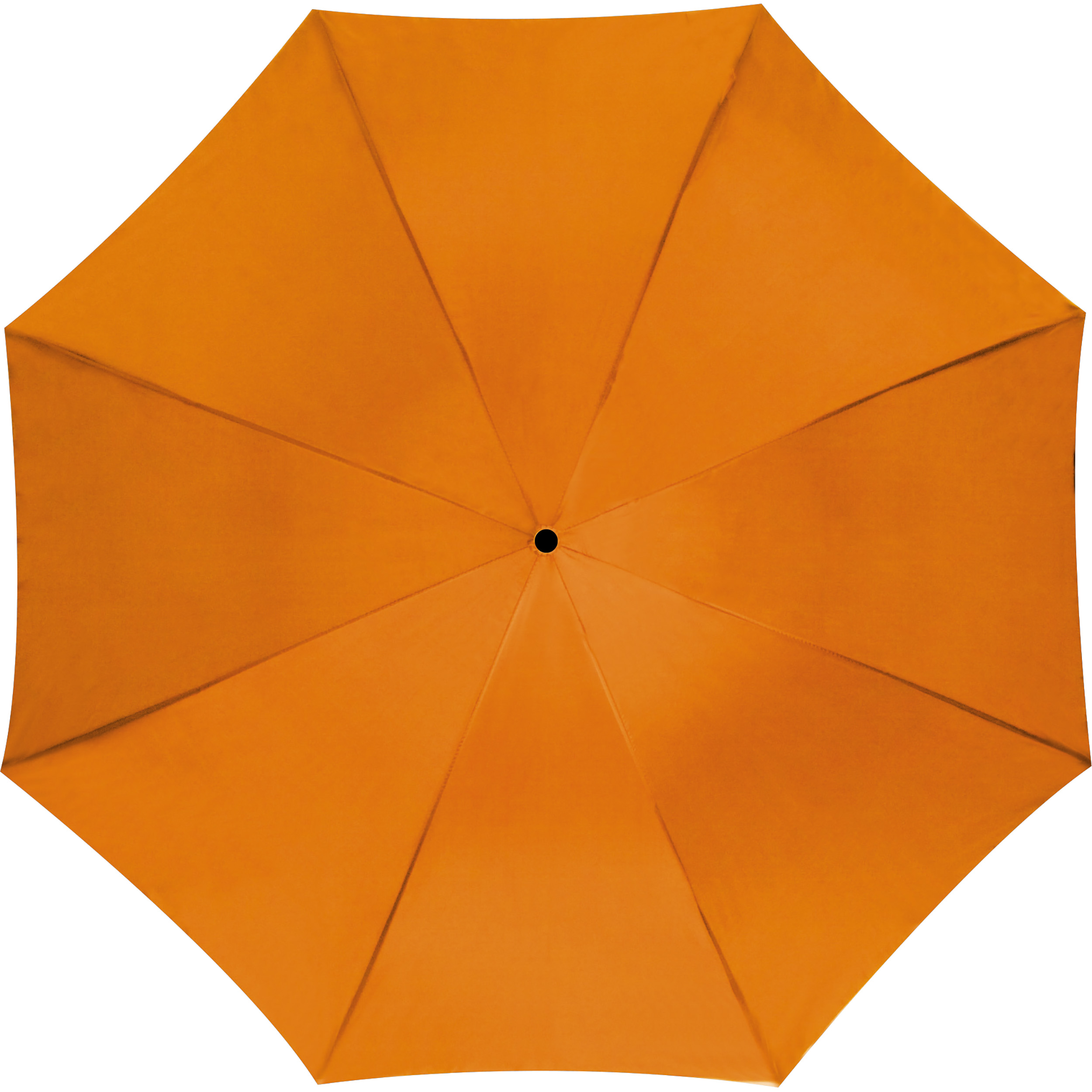 Automatikstockschirm aus 170T Polyester in vielen Unifarben mit geradem Holzgriff und Metallspitzen. Ihre Werbung drucken wir auf den unteren Teil eines Segments.